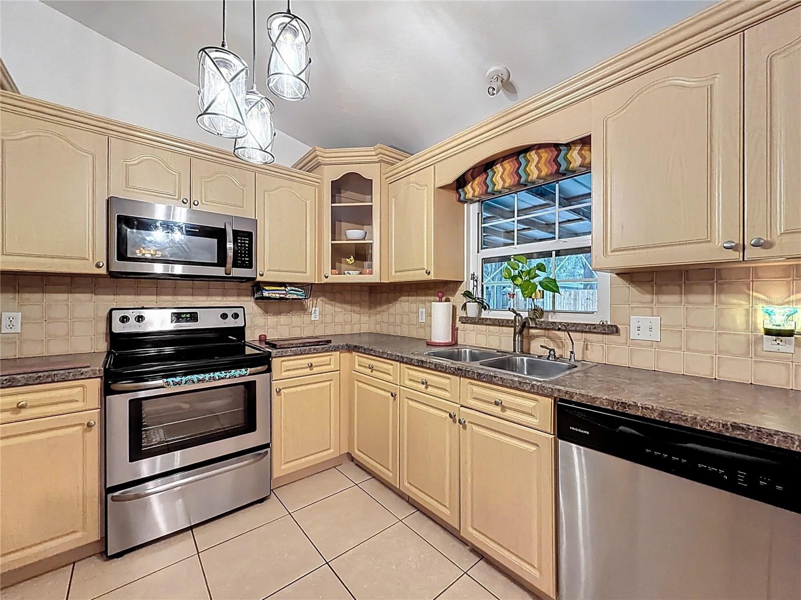 The spacious kitchen is perfect for anyone who loves to cook and features granite countertops, wood cabinetry, updated stainless steel appliances, tile backsplash, and a window overlooking the backyard. Appliances included with the home are the refrigerator, stove, microwave, dishwasher, washer, and dryer.
