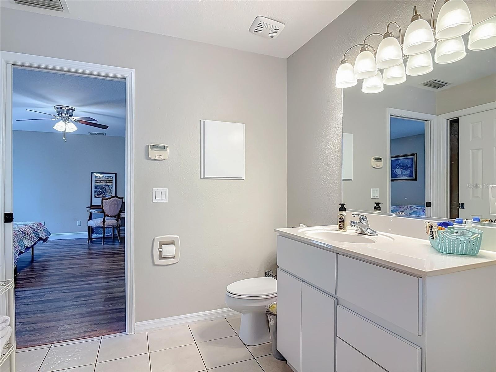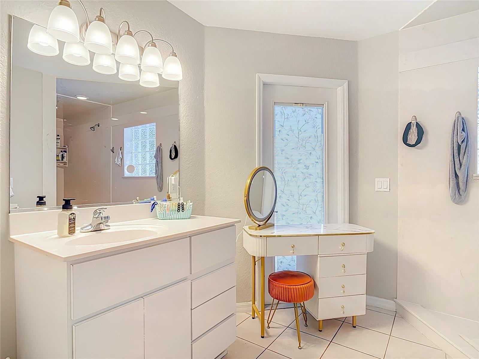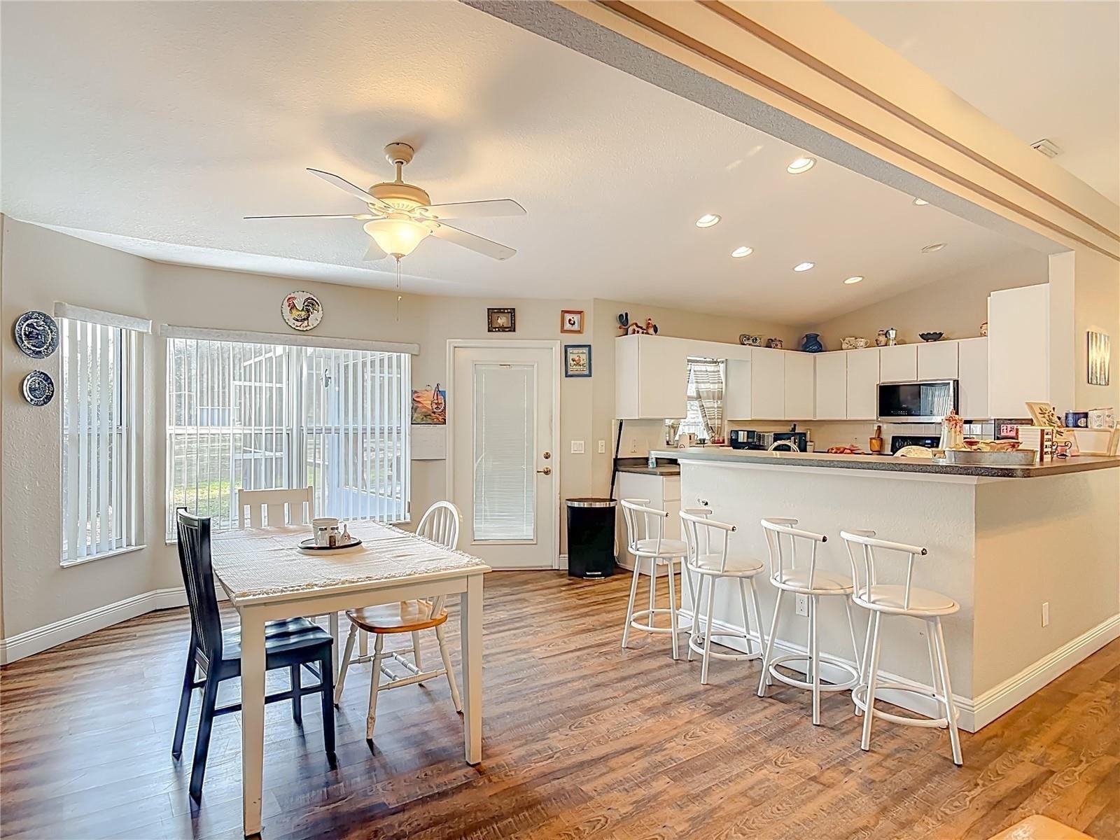 The kitchen offers ample cabinetry, bar seating, and an eat-in area, providing both functionality and workspace for everyday living or entertaining. The split-bedroom layout provides privacy, with the primary suite featuring a walk-in closet and walk-in shower, while two guest bedrooms and a hall bath are located on the opposite side of the home.