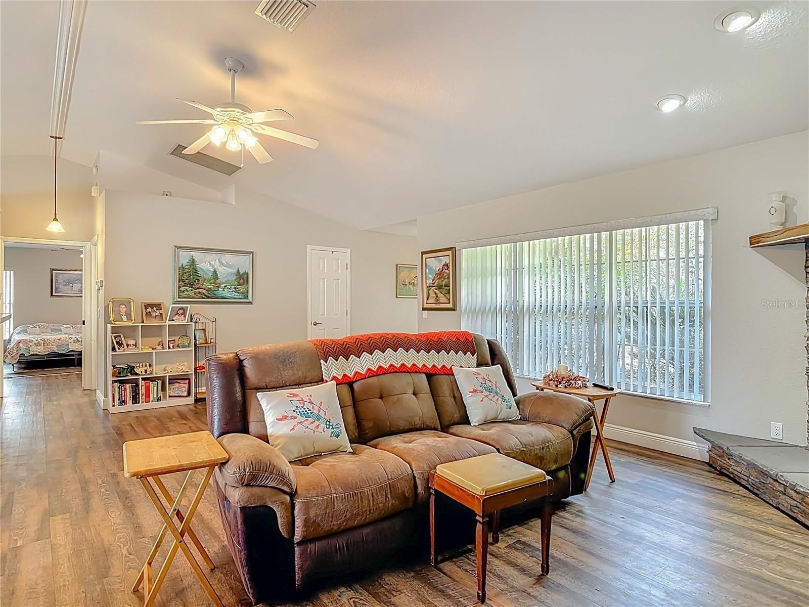 Inside, the home features abundant natural light, laminate flooring throughout the main living areas and bedrooms, and tile flooring in the bathrooms. The living room centers around a cozy wood-burning fireplace, creating a warm gathering space. Ceiling fans are installed in the living room, all bedrooms, kitchen, and dining area, enhancing comfort year-round.