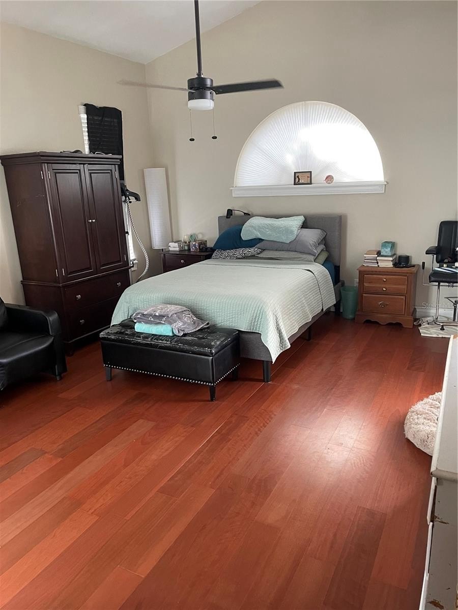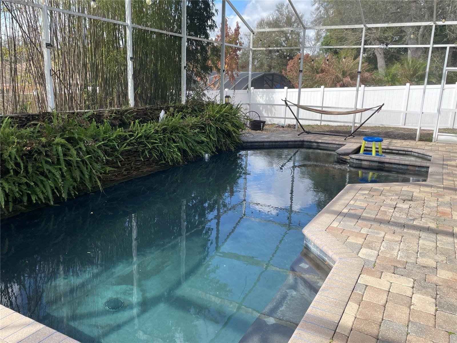 Step outside to your private backyard oasis featuring a heated pool with spa, perfect for enjoying Florida living year-round. The fully fenced backyard provides privacy, while tall bamboo trees create a lush, tropical setting ideal for relaxing or entertaining.