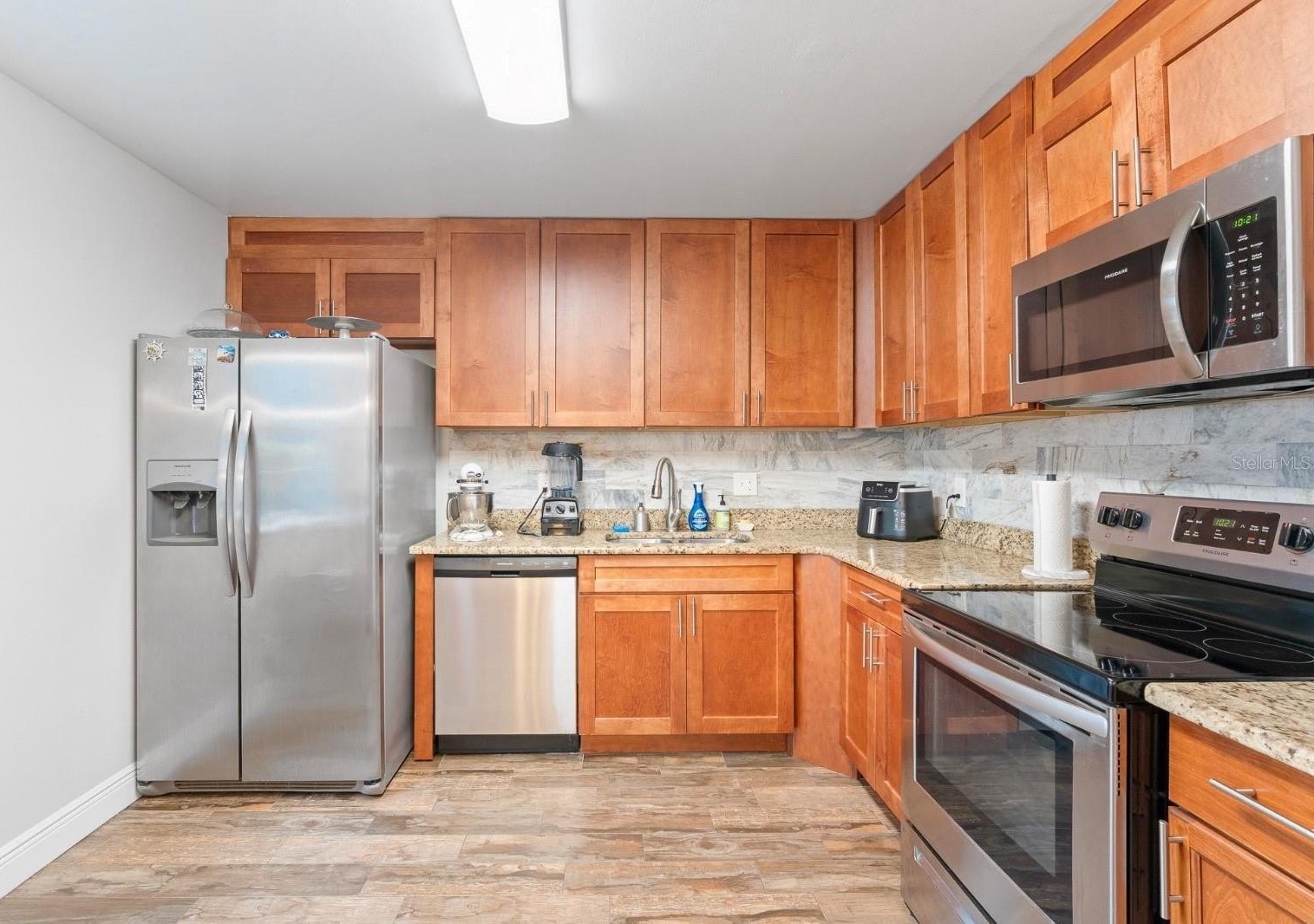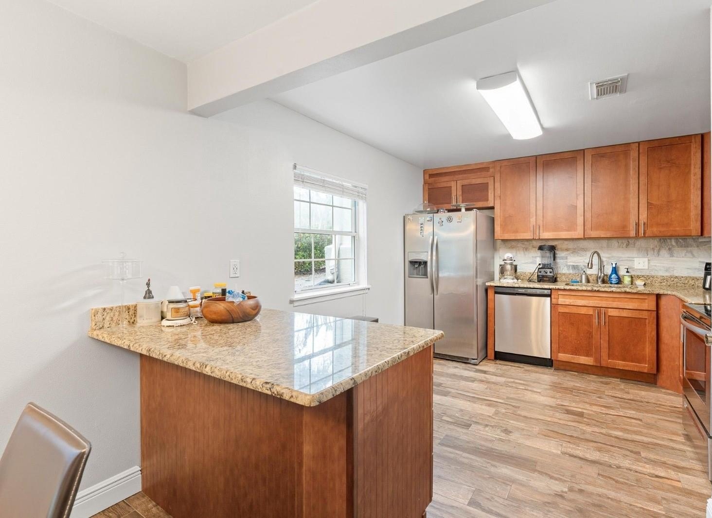 The kitchen is functional and well-equipped, with wooden cabinets, granite countertops, stainless steel appliances, and a pantry, offering ample storage space. At the rear, a private balcony provides a perfect space to relax and enjoy quiet moments outdoors.