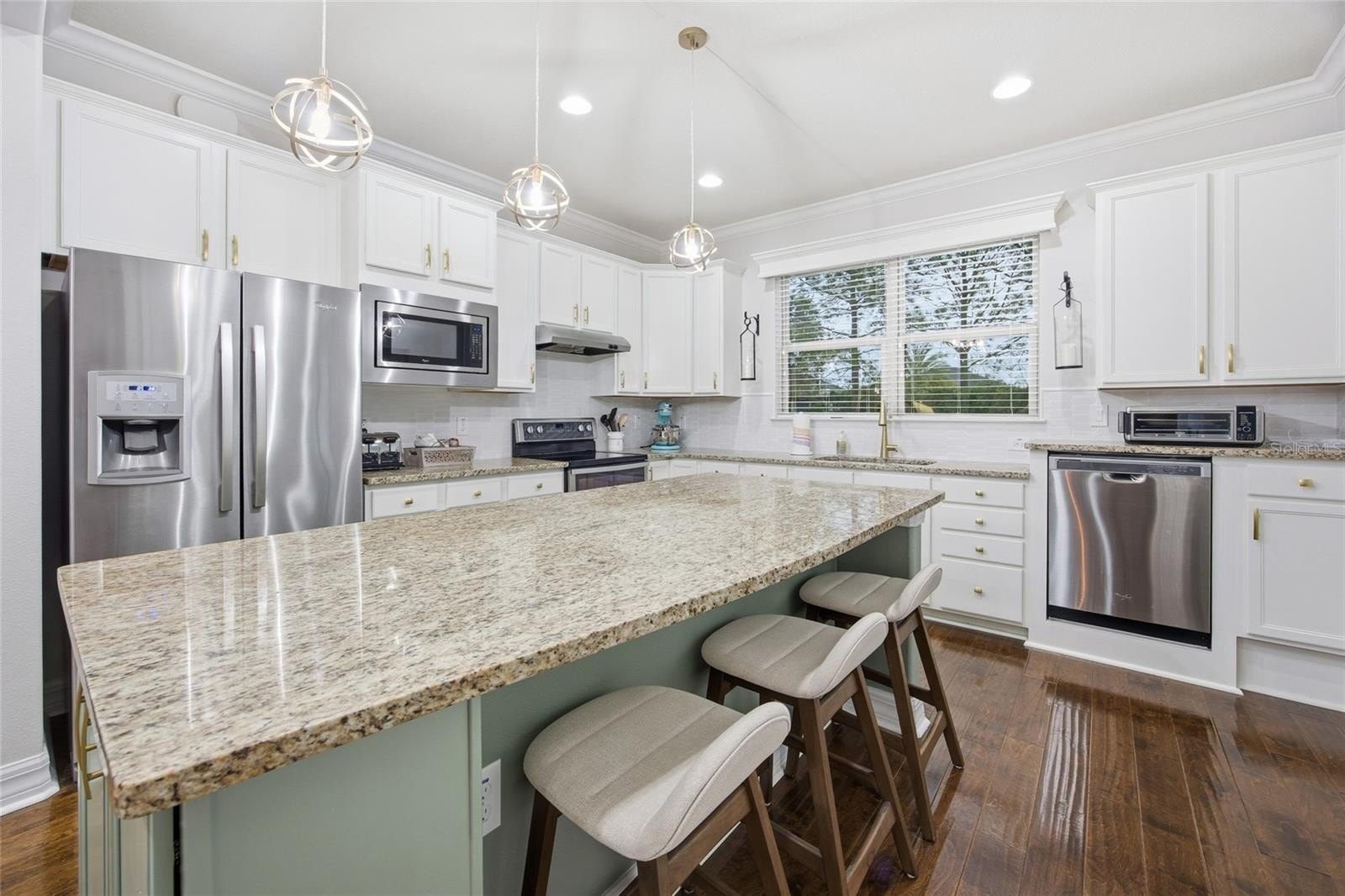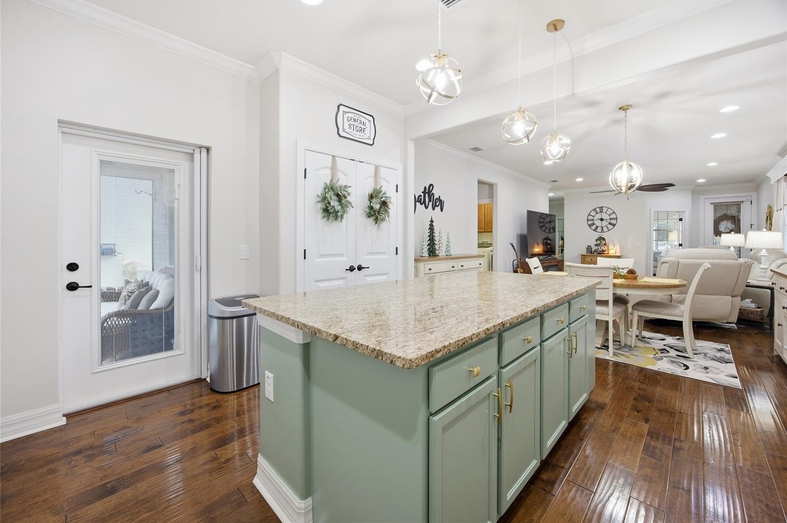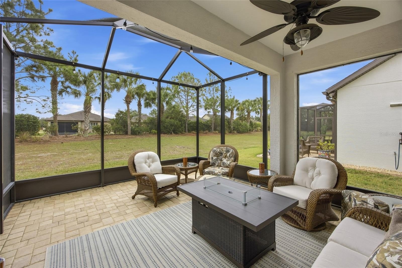 One or more photo(s) has been virtually staged. Discover this Taft Street,1432 sq ft, Garden Home, nestled in the premier gated 55+ community of Del Webb Stone Creek. In this outstanding, 2/2 with flex room home, you will step through a beautiful glass entry door into an inviting, open floor plan, where engineered hardwood floors, large baseboards, and modern lighting set the stage for comfort and elegance. The gourmet kitchen, a true chef’s delight, features premium granite countertops, a custom tile backsplash, Whirlpool stainless steel appliances, and a central island that makes entertaining a pleasure. Retreat to your private outdoor oasis, complete with extended paver patio and screened birdcage—the perfect backdrop for morning coffee or sunset barbecues. Bedrooms feature enhanced closets, and the adaptable flex room serves perfectly as an office, hobby space, or private getaway. Sophisticated Crown molding and elegant treatments above and below every window create a refined ambiance. The Dream garage is ready for your next project, boasting an extended 2-car garage with finished floors, roll-up garage screen door, a built-in workbench, custom cabinets, and tool racks. Other hidden gems include: recent interior and exterior paint, paver driveway, paver front porch, retractable screens on all doors leading to the outside, water softener, lifted dishwasher, designer kitchen cabinets, smart thermostat and more. The HOA fees include Lawn Care, Internet, 24-hour guard gate, pools, fitness center, and much more. This home has every detail meticulously upgraded for a luxurious, maintenance-free Florida lifestyle. Life in Stone Creek means access to resort-style pools, an 18-hole championship golf course, pickleball courts, on-site dining, and a vibrant social calendar. Located just minutes from the World Equestrian Center, State Parks, world-class shopping, and medical facilities. Do not miss your opportunity to own a home that is truly better than new.