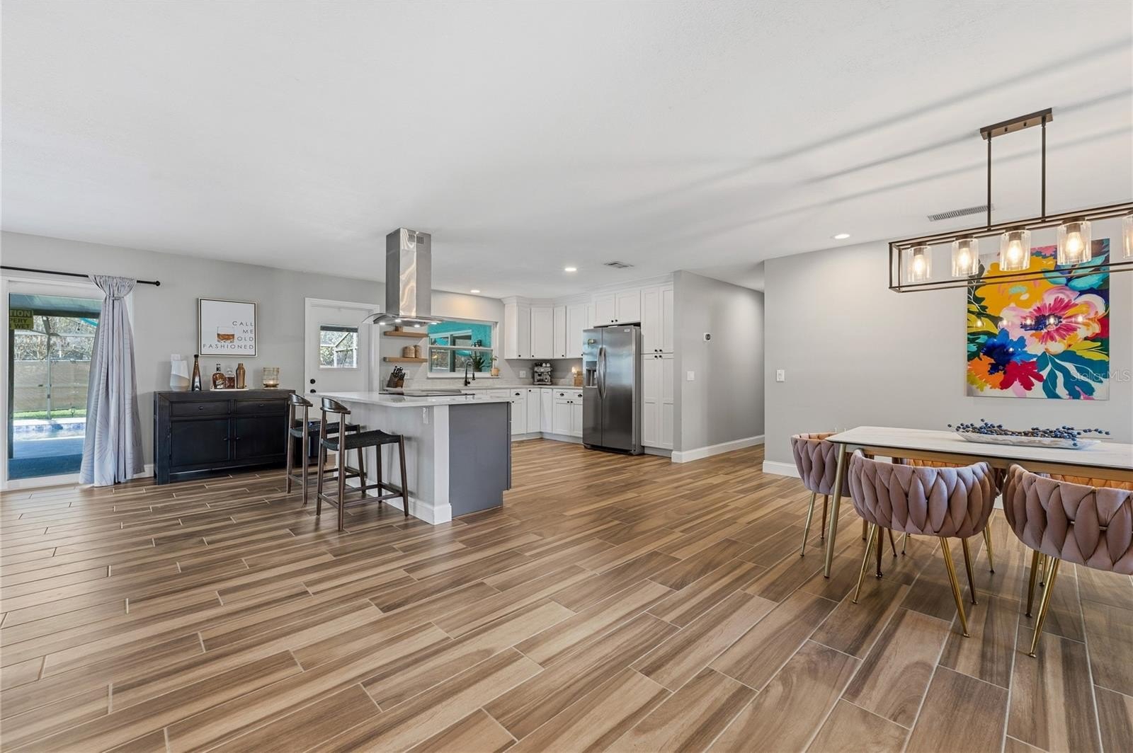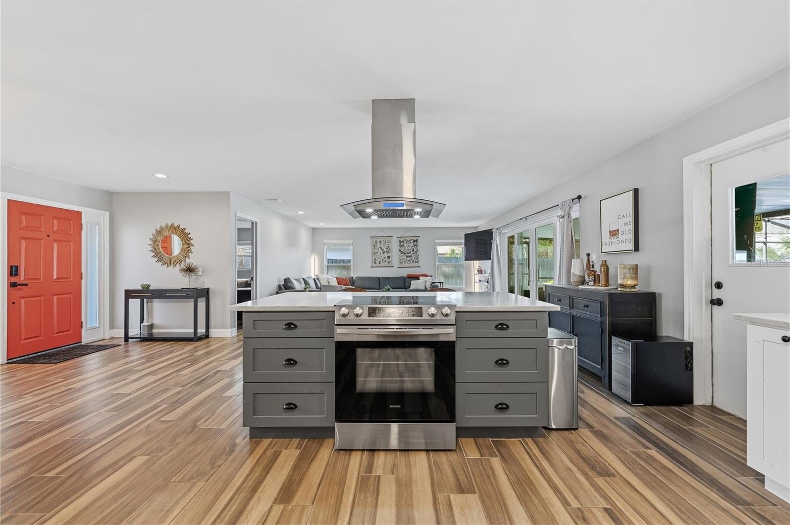 This open-concept layout creates an effortless flow between the kitchen, dining, and living spaces--ideal for entertaining and everyday living. It also offers beautiful views of the newly resurfaced screened-in pool and exquisitely landscaped, fenced backyard. The redesigned kitchen features new wood cabinetry with soft-close drawers, quartz countertops, a large cooking island, brand-new appliances, and a convenient pass-through window to the covered patio!