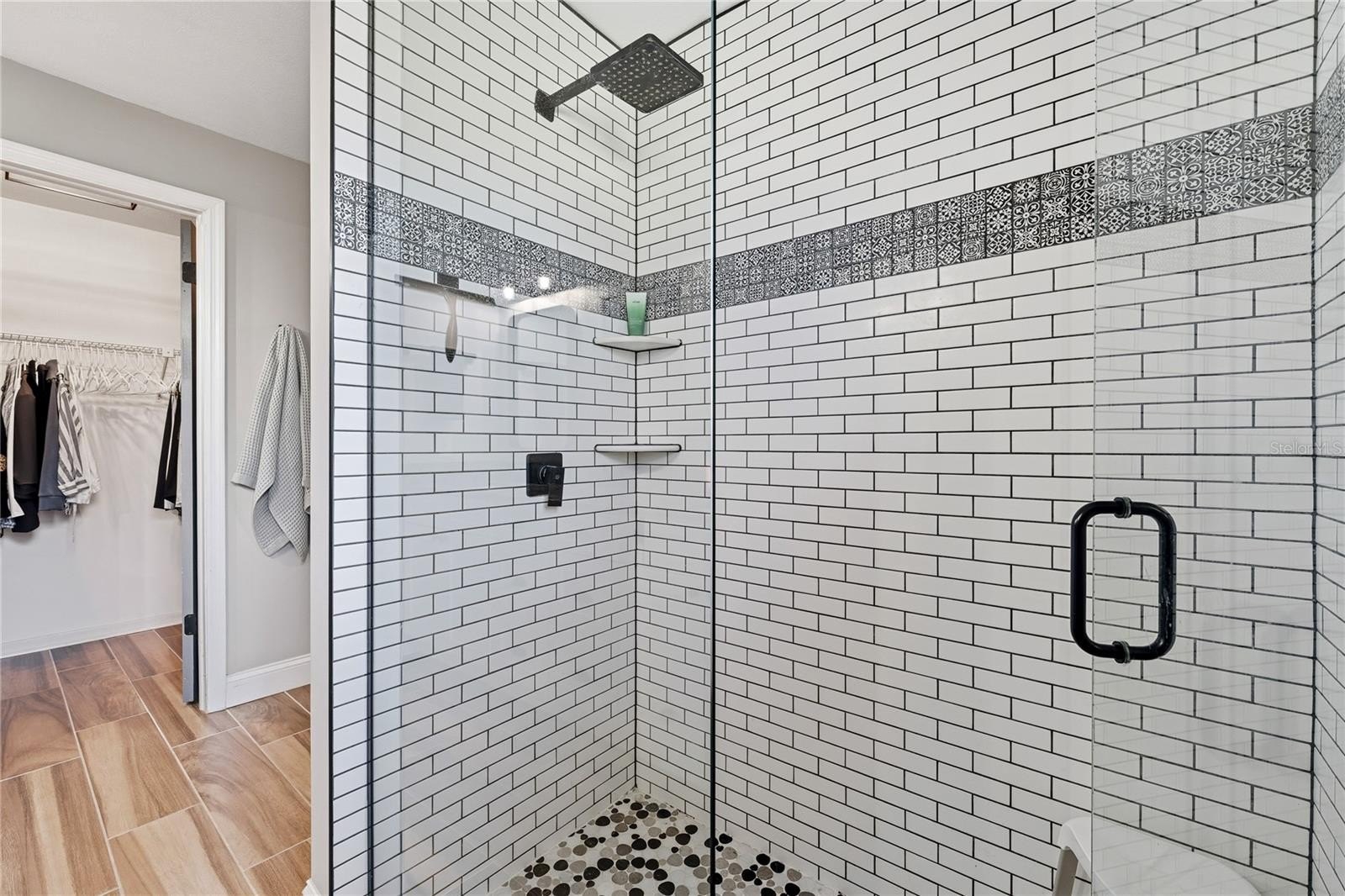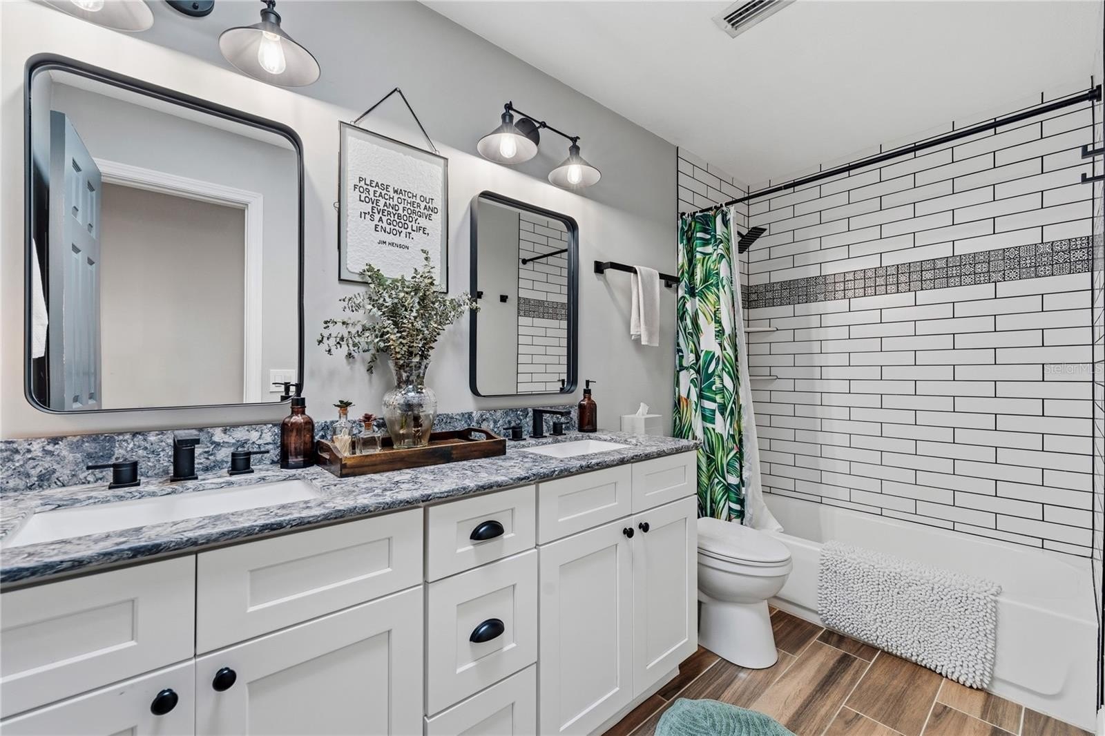 The private primary suite includes a walk-in closet, dual-sink vanity, walk-in shower, and stylish barn doors. Three additional bedrooms are located on the opposite side of the home along with an updated second bath featuring dual sinks and a skylight.
