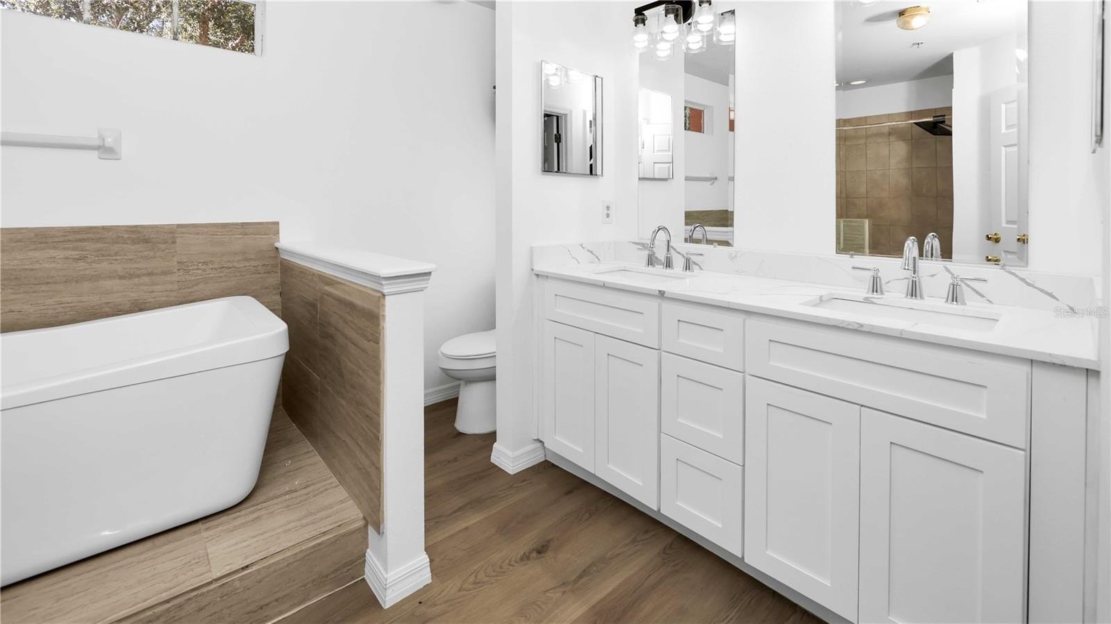• Gorgeous Re-Modeled MASTER BATH Upstairs with Free-Standing Tub AND a Large Walk-In Shower and a Brand-New Vanity!