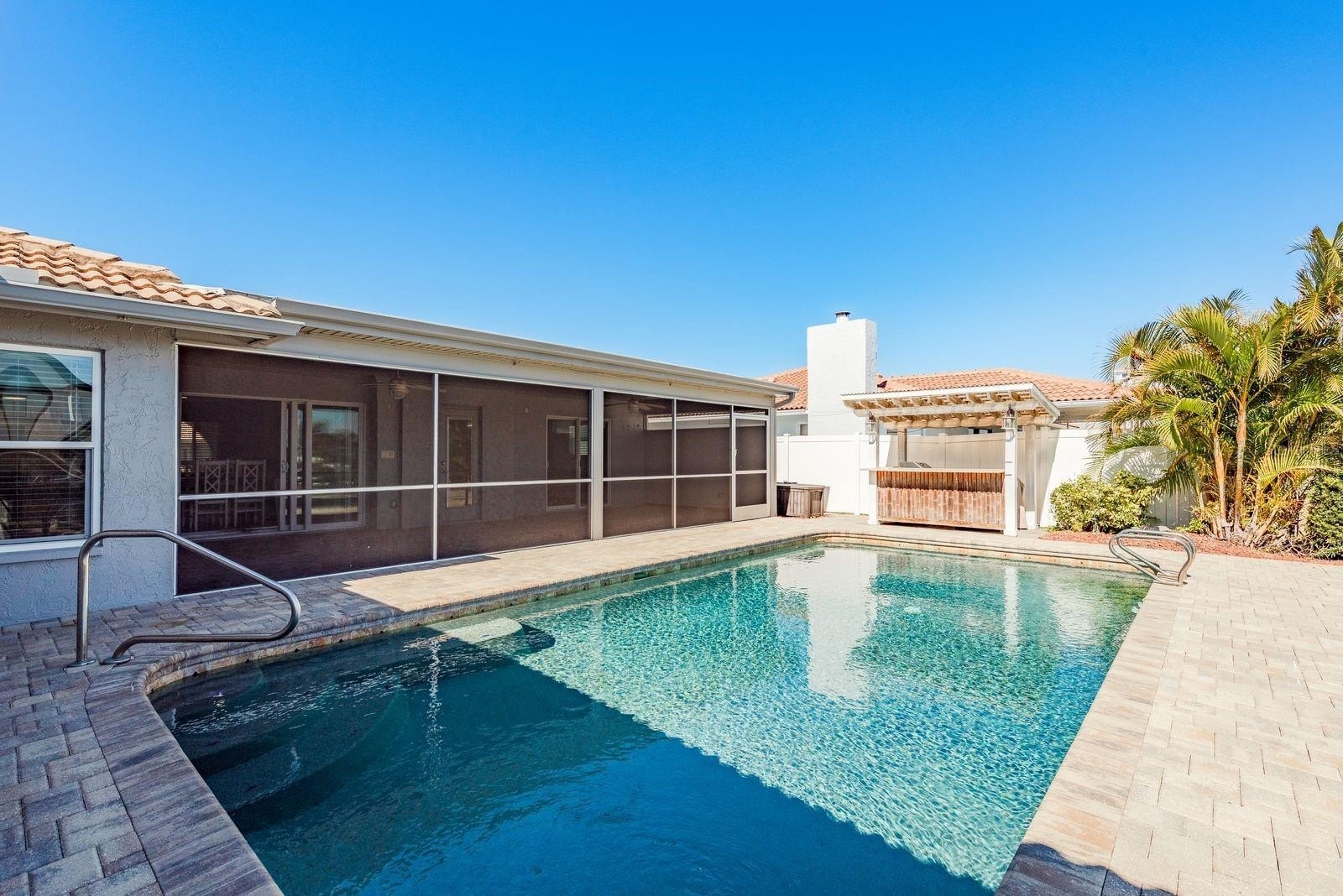 One or more photo(s) has been virtually staged. Welcome home to this beautifully remodeled waterfront retreat, set on a wide, deep-water canal with quick access to open Gulf waters, perfect for large boats and sailboats alike. A striking circular paver driveway sets the tone as you arrive at this 3-bedroom, 3-bath residence with a 2-car attached garage. Inside, the open concept living, dining, and family rooms are finished with tile flooring and flow seamlessly into a stunning kitchen featuring a large quartz peninsula breakfast bar, gas stove, and stainless-steel appliances. All three bathrooms have been tastefully remodeled with glass-enclosed showers, rain showerheads, and new vanities topped with quartz counters. Wood-plank tile flooring extends through all bedrooms and baths. Impact-rated windows and doors provide peace of mind, and the entire home has been thoughtfully updated throughout. Step outside to the expansive screened lanai overlooking the heated Pebble Tec pool, waterfront, and beautifully landscaped grounds, complete with an outdoor bar—ideal for entertaining. Boaters will appreciate the dock with a 10,000-lb lift plus a floating dock. Enjoy watching dolphins and local wildlife, or head out for fishing, watersports, and island hopping just minutes from your backyard. The Gulf Harbors community offers a private beach with cabanas and grills, enhancing the true Florida lifestyle at its best! Conveniently located near major roads, shopping, dining, medical facilities, airports, golf, and renowned beaches. Schedule your private showing today and experience waterfront living at its finest.