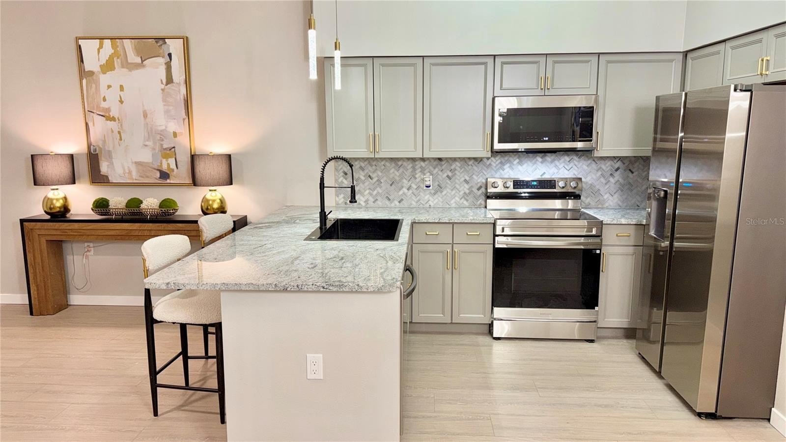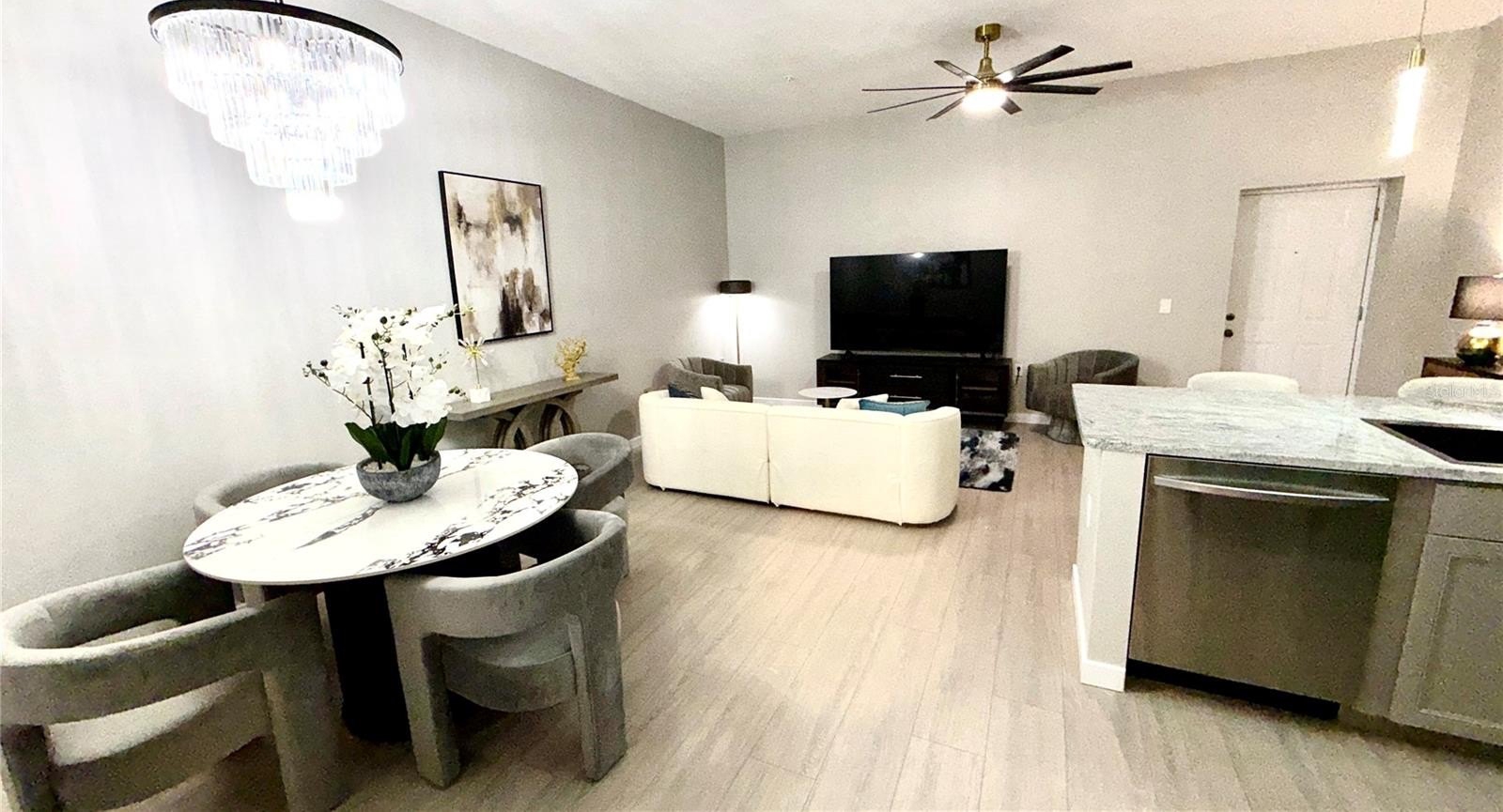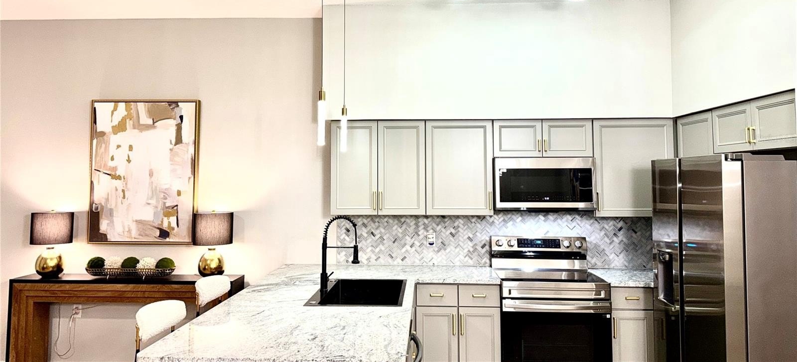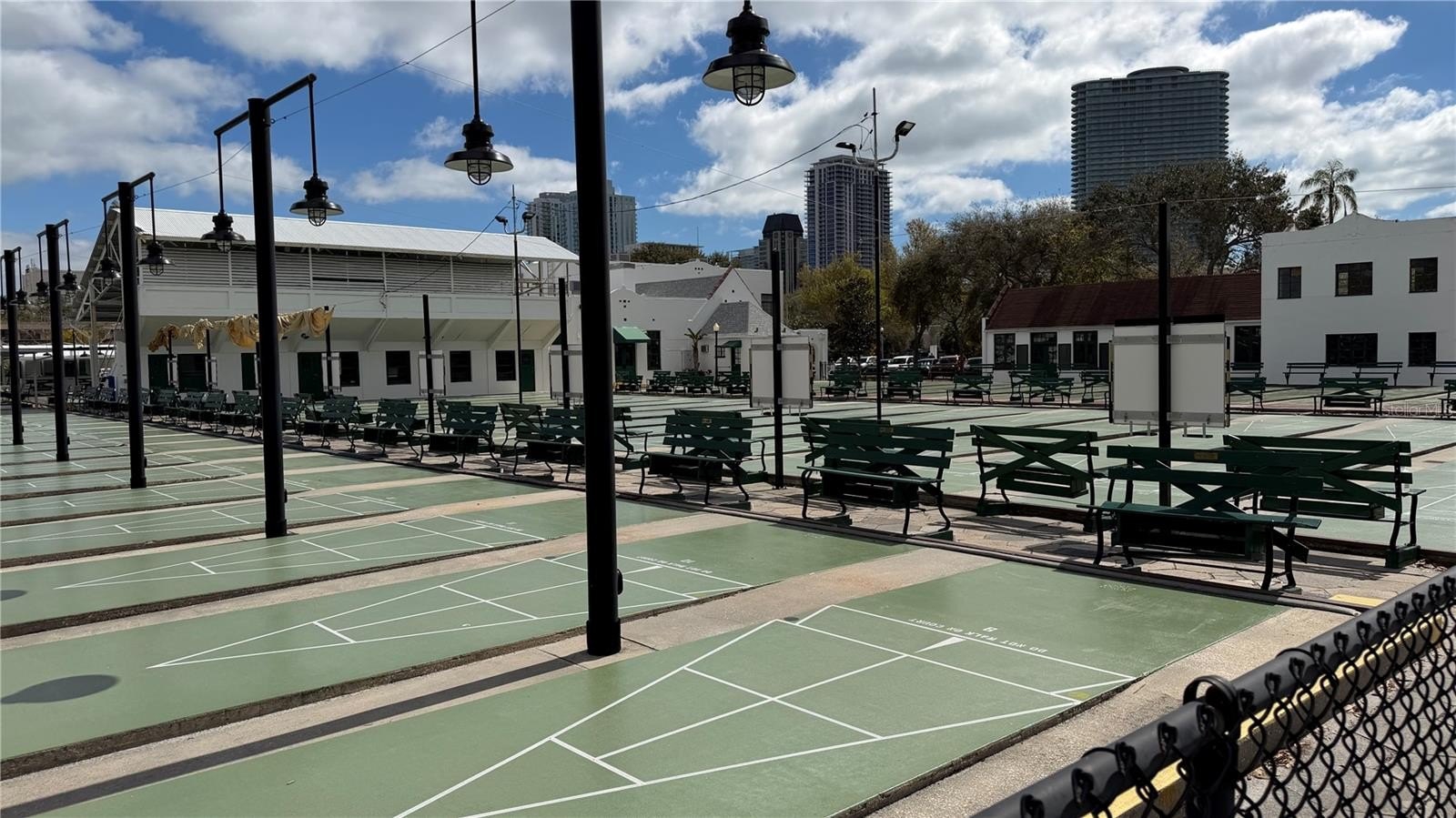 This spacious 875-square-foot condo, one of the larger units, features soaring ceilings and a complete renovation blending modern luxury with historic charm. Nestled in the iconic 1915 St. Petersburg High School building, this Mirror Lake gem boasts brand-new Samsung appliances, a GE washer/dryer, elegant new cabinets, granite counters, and a striking chevron marble backsplash. Both bathrooms have gleaming new cabinets, granite countertops, and fresh marble flooring, complemented by new bathtub tiles. Luxury vinyl floors, crisp paint, and all-new fixtures, blinds, chandeliers, fans, and trim complete the transformation. Just steps from downtown St. Pete, relish easy access to restaurants, USF, museums, theatres, and more. The community also offers a pool and library, where history and modern comfort truly come together. Mirror Lake is out front, with the neighbouring historic Coliseum and the St Petersburg Shuffleboard Club.