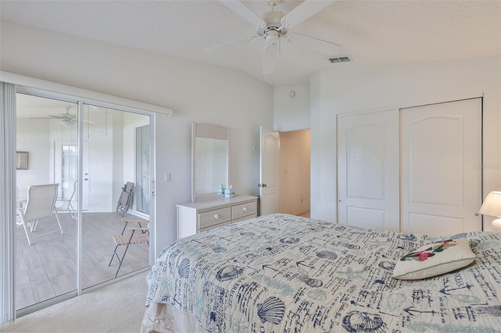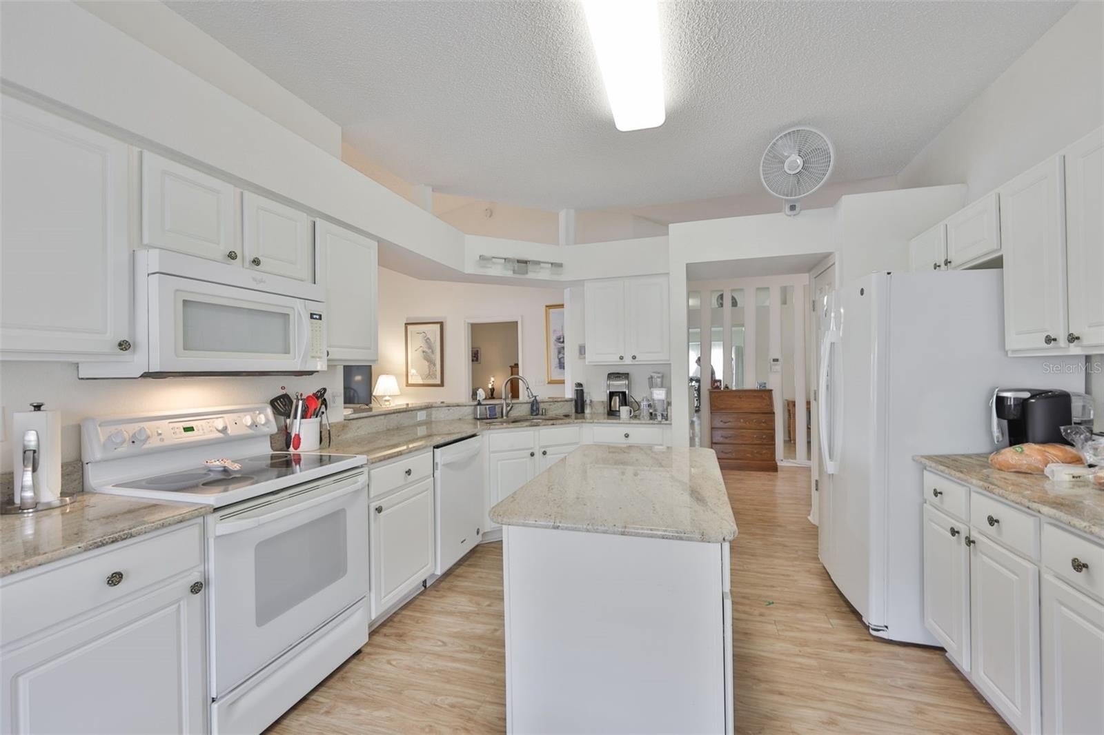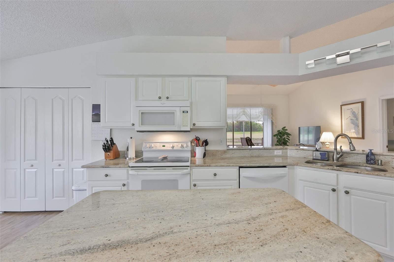 Inside, the home offers a bright and functional island kitchen with granite countertops, light cabinetry, and a charming bay-window breakfast area that fills the space with natural light. A newer washer and dryer are conveniently located indoors near the dinette area. The central living room features sliding glass doors that open to the lanai, seamlessly blending indoor and outdoor living and showcasing the breathtaking view.