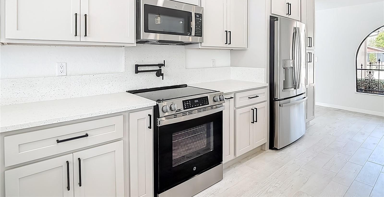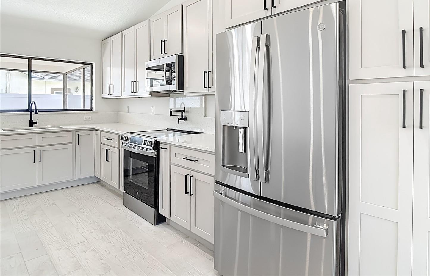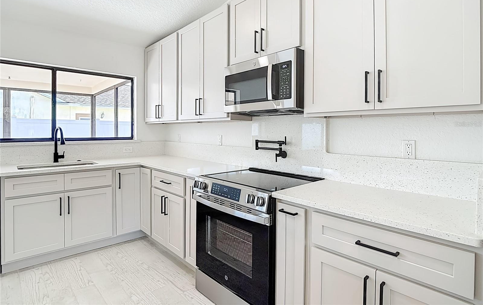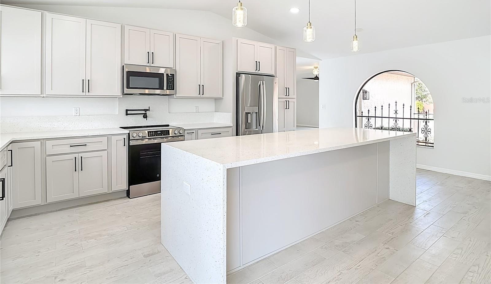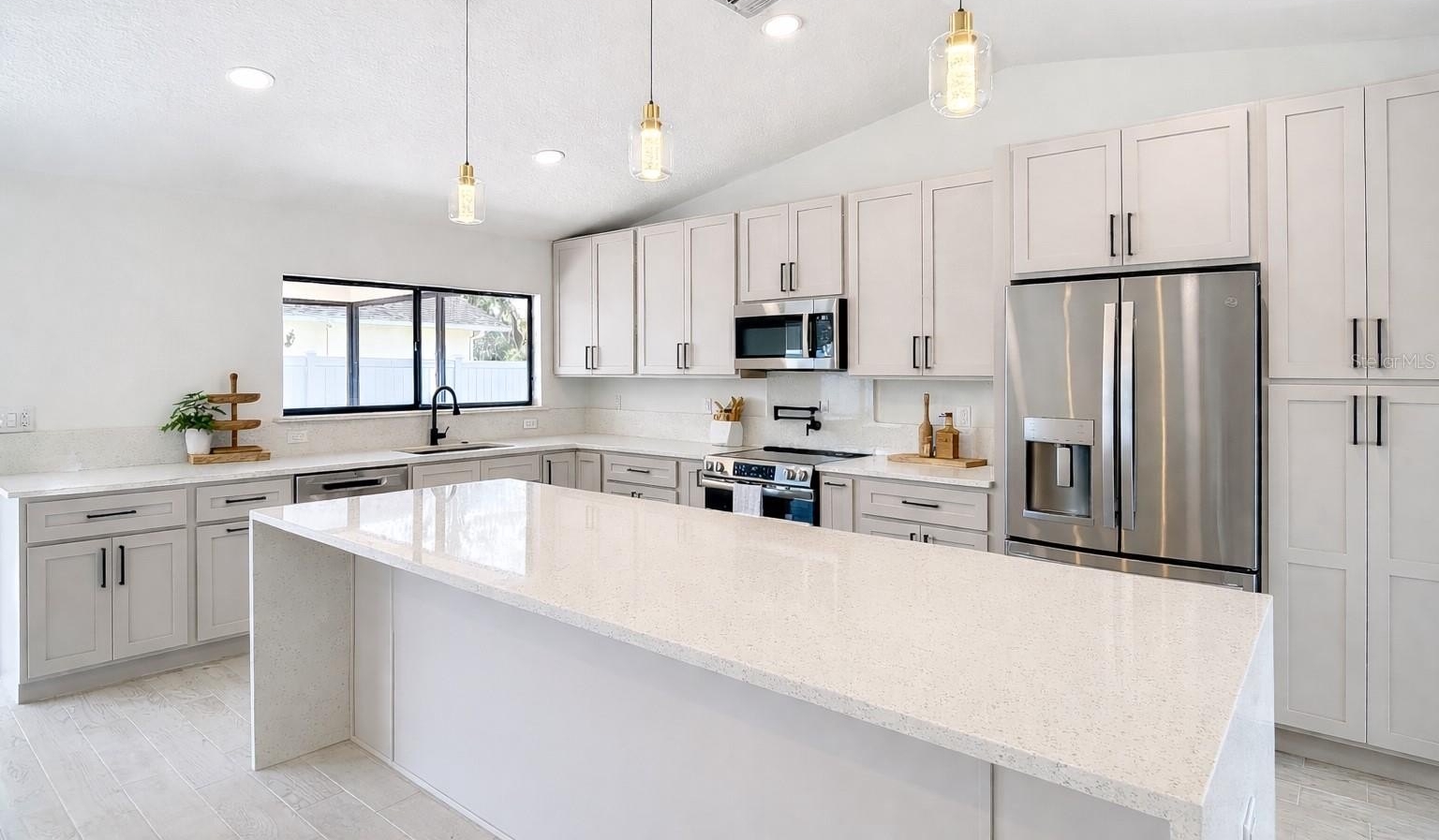 ONE OR MORE PHOTOS ARE VIRTUALLY STAGED. Welcome to this meticulously updated home, sitting on a corner .28 acre and where every detail has been thoughtfully considered for comfort and style. Step inside to find a bright, open floor plan enhanced by modern lighting and fresh neutral paint that complements the elegant porcelain tile flooring. The inviting entryway leads to spacious living and entertaining areas, perfect for both relaxing and hosting guests. This house has been 100% renovated using the highest quality materials and fixtures. Stunning eat-in kitchen features quartz counters with elegant waterfall center island with quart counters, lots of soft-closed cabinets with pull out drawers, pantry 42” upper cabinets and a built-in spice rack. New stainless-steel appliances, including a range featuring an air-fryer and convection oven, as well as a convenient pot filler, make cooking a delight. The kitchen layout is perfect for both family meals and entertaining, offering seamless access to the dining area. The spacious family room features vaulted ceilings with wood burning fireplace with gorgeous tile surround. The primary suite features a walk-in closet features built-ins for your delicate items. The primary bathroom is absolutely stunning with dual sinks with a quartz countertop, soft-closed cabinets! The beautiful tile shower is a his and hers shower with dual controls and dual shower heads. 2nd & 3rd bedrooms are generous in size and share the 2nd bathroom. The second bathroom also features a quartz countertop, soft-closed cabinets, and new fixtures. Large hall closets give plenty of storage. Laundry room has a very useful sink, and more beautiful cabinets with washer and dryer. Outside you have a huge, covered patio for enjoying the cooler weather. Backyard is fully fenced with vinyl fencing! Additional upgrades include new plumbing, updated outlets and switches, new water heater, all new interior doors, hardware, baseboards, trim, lighting, and remote-control fans, new interior and exterior paint. This home harmonizes thoughtful upgrades with classic charm—ready for you to move in and make it your own. LOW HOA, NO FLOOD INSURANCE. Lots of shopping and favorite local dining options nearby. Minutes from the famous Weeki Wachee live mermaids, Pine Island Park and Roger’s Park for fun on the water. Close to the Suncoast parkway for quick access to the airport, Tampa, Clearwater and St. Pete Beaches (Ranked in the top 5 Beaches in the US), also close to the famous Tarpon Springs Sponge Docks. Enjoy everything Tampa Bay has to offer from the new Downtown Riverwalk, TOP US BEACHES, boating, fishing, golfing, cultural entertainment, and museums...and of course beautiful year-round weather! The $24 monthly HOA fee covers use of the Community Center which has the Library, Horseshoe Area, Shuffleboard Courts, Picnic Tables and BBQ Grills. Please put on shoe covers (supplied) to keep the floors clean.