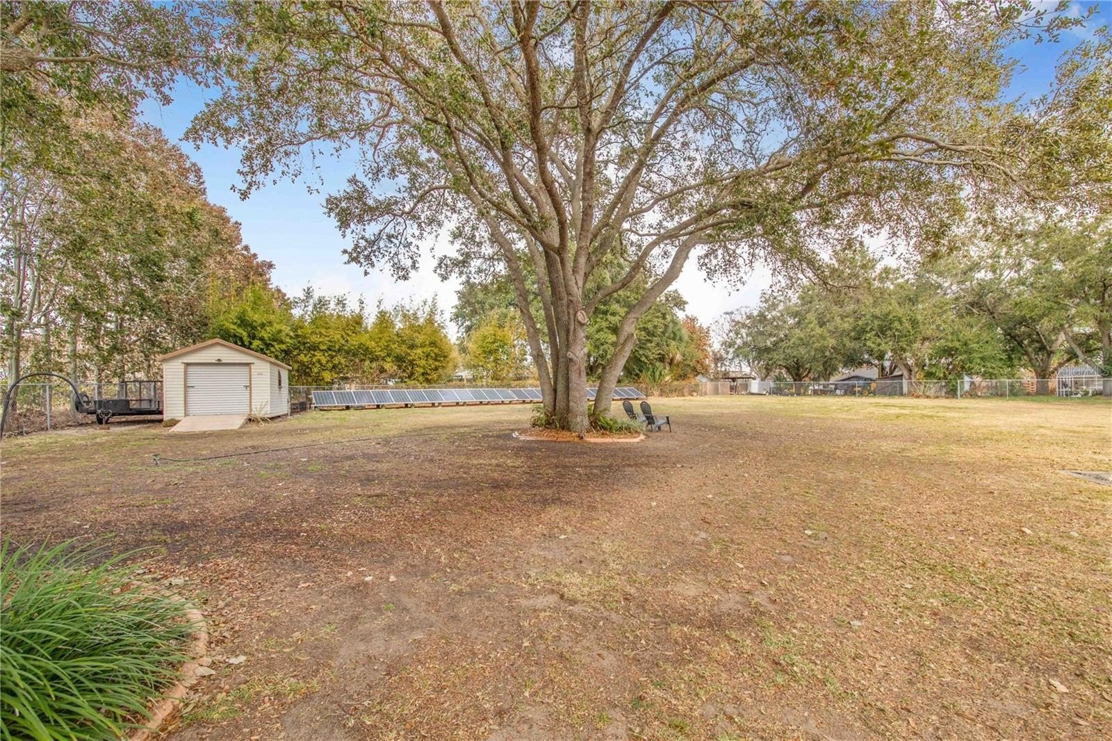 Enjoy this 3 bedroom 2 bath home located in Spring Pines West. This has been a desirable area in a country setting by many. Here you will find a beautiful home situated on a .71 acre lot with a fenced back yard, Key West Bermuda shutters, a workshop,shed,firepit and a green house! The home is complete with 24 solar panels that will keep you up and running during any power outage. These panels are owned so no need to finance a payment.A new roof was installed in 2024,the AC is 2 years old and the appliances were upgraded in 2025. There is a nice little courtyard area by the front door perfect for that morning coffee and watching the squirrels in the beautiful oak tree. Upon entering the home you will find a spacious living room complete with a wood burning fireplace. To your right will be a formal dining area perfect for gatherings. Here you will also have access to the kitchen that will overlook the living area. This kitchen has an abundance of cabinets,a closet pantry,granite counters,a built in desk area and a bar space to eat at! Everything you need for the family get together is right here! Next to the kitchen is also a dinette area with bay windows to see the backyard. The master bedroom is on this side of the home with a huge master bath complete with a jetted garden tub to soak in and a large glass enclosed shower area. On the opposite side of the home, you will find the other two spacious bedrooms as well as a large hall bathroom with shower. Off of the living room through the french doors is the enclosed rear patio/Florida room that offers vinyl windows that open to screens. Together with a ceiling fan and nice views, it is a perfect area to wind down after a day's work. In the back yard directly behind the home is a block and stucco workshop with shingle roof that matches the home. This building offers a side door and a roll up door and can accommodate a vehicle or your awesome toys. To the rear of the yard is a large shed that also has a roll up door with a ramp perfect for lawn equipment and more. Beyond the shed is a greenhouse to grow your own vegetables and plants. The backyard is fenced and safe for family to play and pets. This neighborhood is quiet and friendly set just outside of the city limits yet close to food,schools worship and more. It is centrally located to be able to access I-4 and surrounding amusement parks. Make your appointment today to view this lovely home.