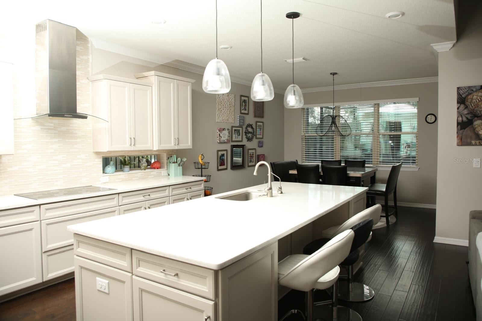 The light-filled interior boasts a chef’s kitchen with quartz countertops, hardwood floors, and custom blinds throughout. High-end upgrades abound, including a professional-grade home theater, custom-designed closets, and a whole-home Culligan water filtration system.