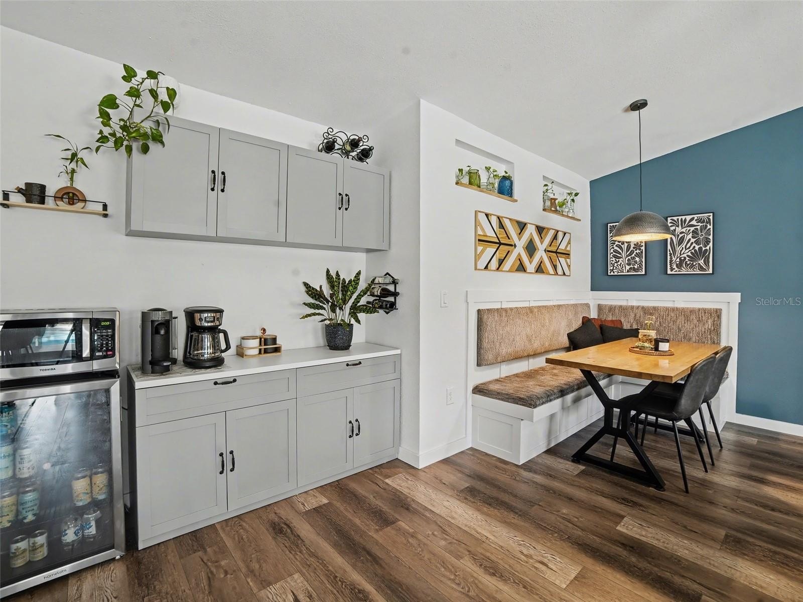 The dining area is enhanced by custom built-in bench seating, creating a stylish and inviting space for everyday meals or intimate gatherings, while an additional dinette area provides extra flexibility for casual dining.