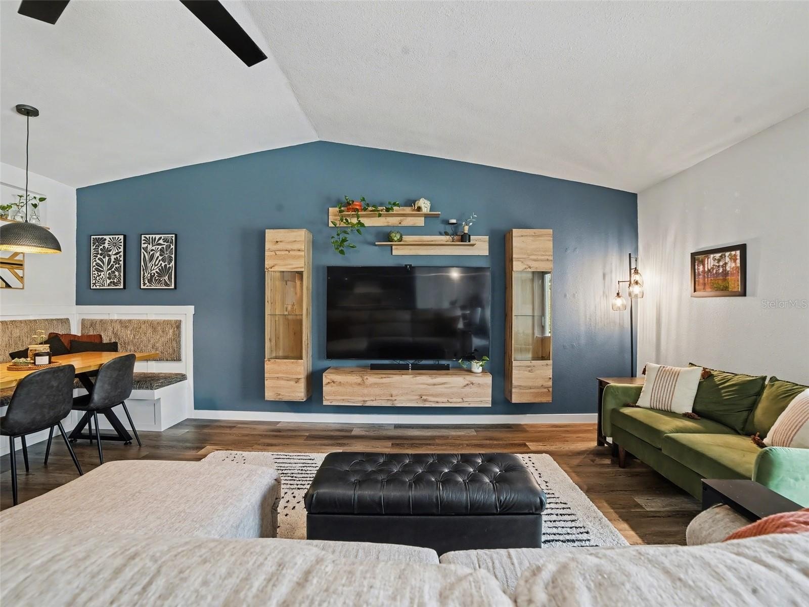 Flowing seamlessly from the kitchen, the expansive great room offers a warm and welcoming atmosphere highlighted by built-in shelving surrounding the TV area and oversized sliding glass doors that frame serene views of the screened pool and outdoor living space. Additional grey cabinetry with upper and lower storage creates the perfect coffee bar or beverage center, adding both functionality and a sophisticated entertaining feature.