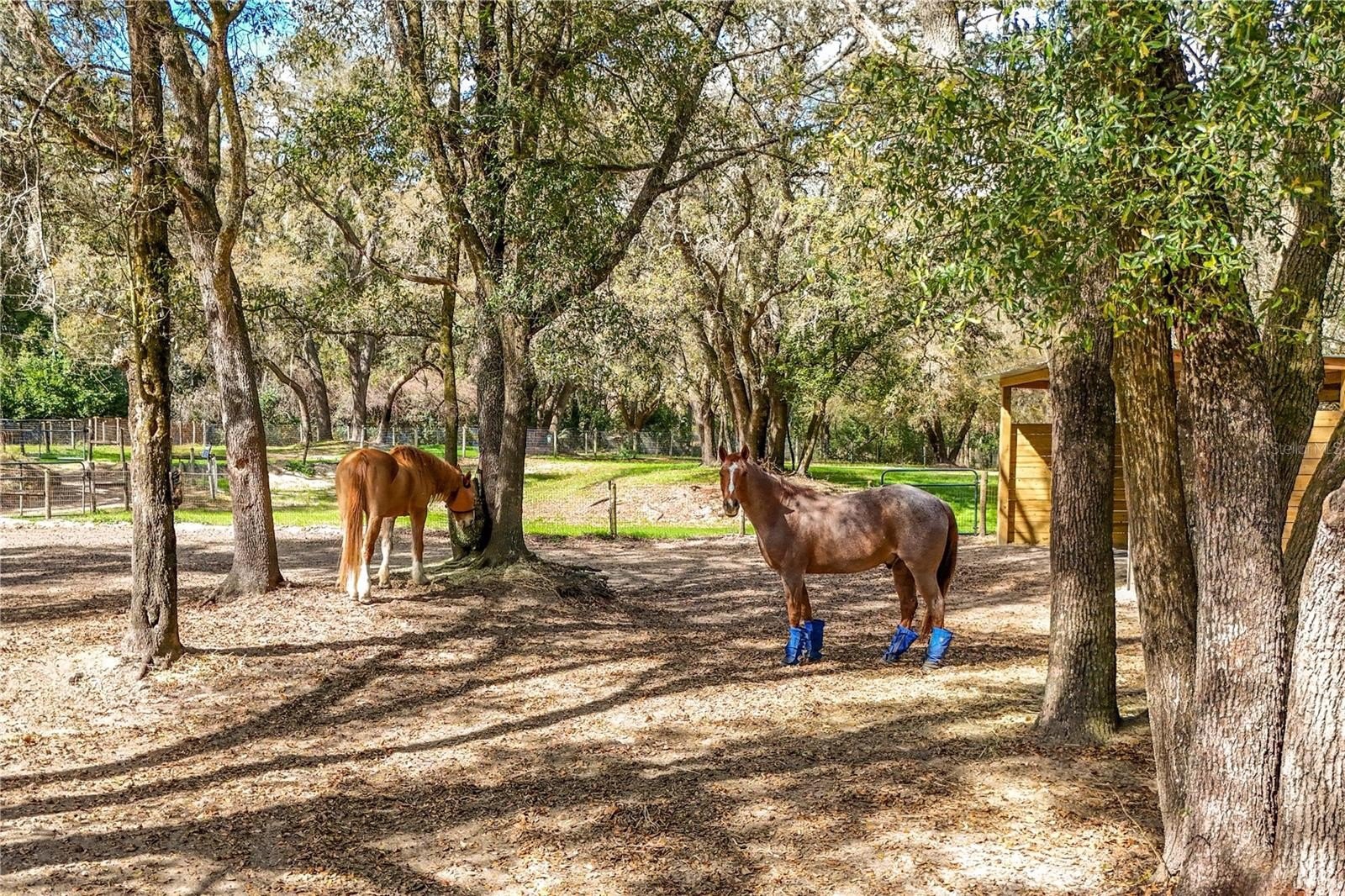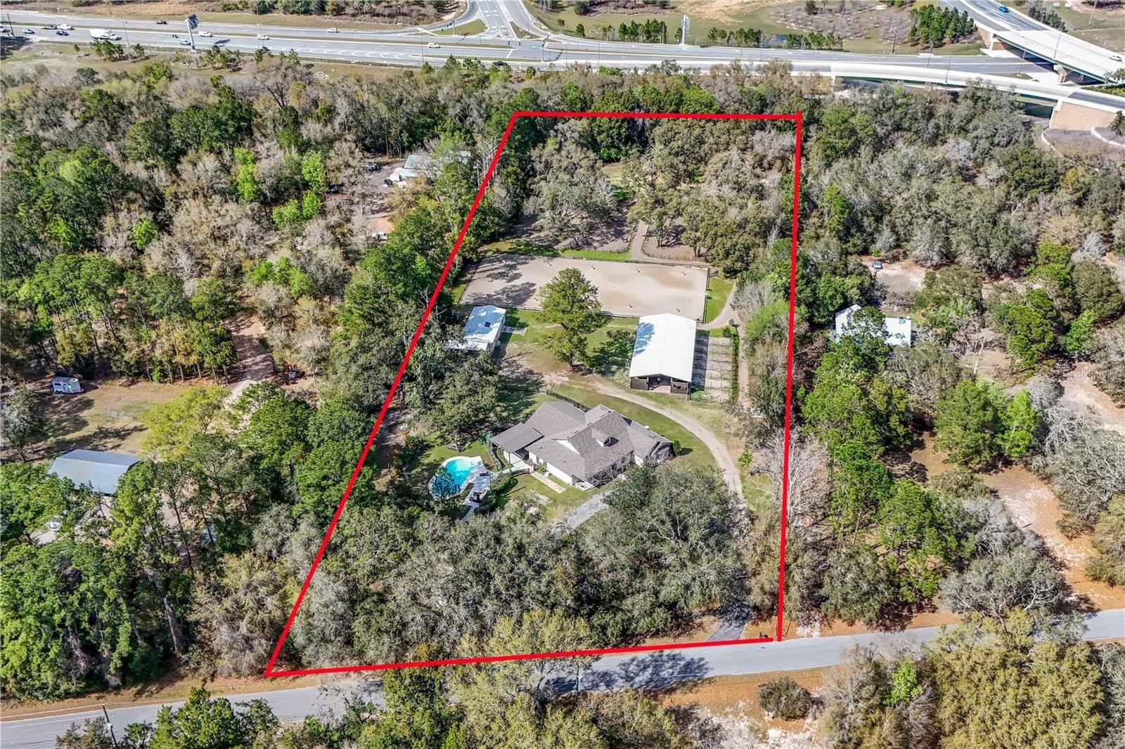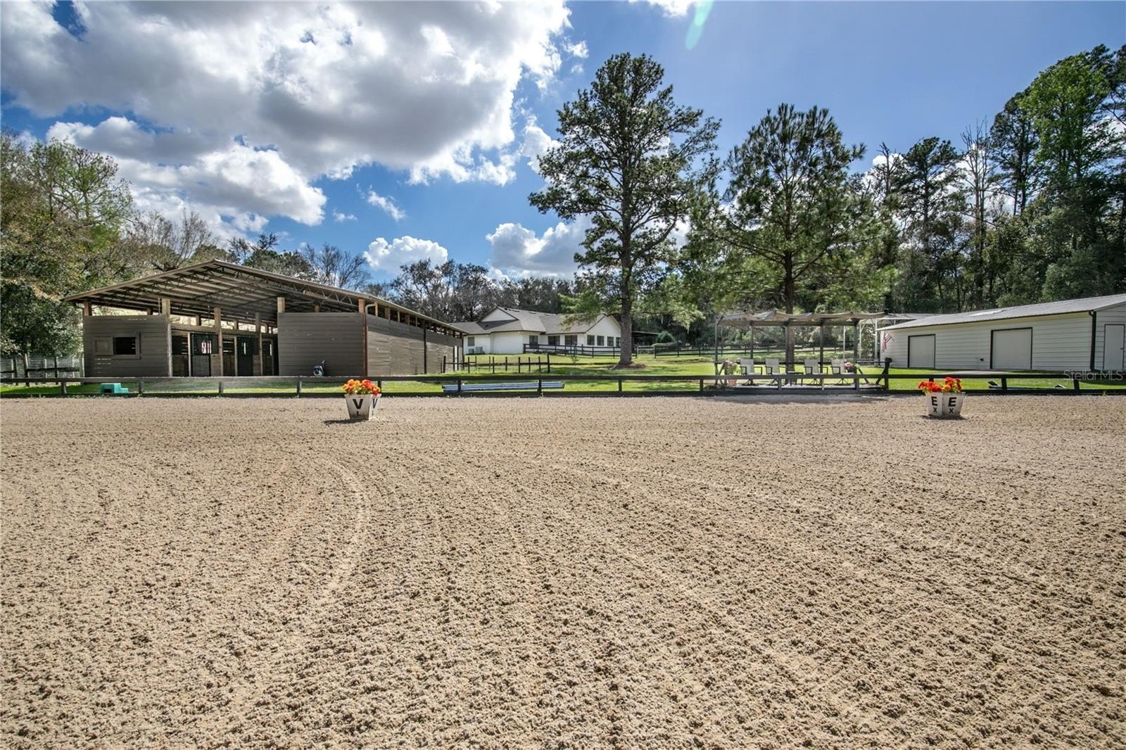 The riding facilities are equally impressive. A full-size 100' x 200' laser-leveled competition dressage arena with fiber footing and irrigation provides a consistent surface ideal for schooling and training. A viewing stand with additional deck space overlooks the arena, offering a comfortable place to observe riding activity. Five shady paddocks with irrigation and no-climb fencing provide generous turnout space. A small trail loop winds through the back of the property, and designated areas are in place for manure composting and disposal. Additional improvements include a pole barn with 14-foot ceilings and adjacent parking pad providing excellent space for trailers, tractors, or equipment. The detached 50' x 25' garage/workshop features two roll-up doors and multiple power options including 120V 30-amp, 240V 50-amp, and 125V 30-amp service. Accessed through two electric gates, the residence offers privacy and a welcoming sense of arrival. The main home features four bedrooms, three bathrooms, and a dedicated office, along with a private one-bedroom, one-bath in-law suite with separate entrance, living room, and kitchenette. Stamped concrete floors run throughout the main living areas and are complemented by abundant natural light. The living room features a gas fireplace that creates a warm focal point for gathering. A spacious family room with built-in bench storage offers flexible space ideal for a media room, exercise area, or additional living space. The primary suite includes a walk-in closet and ensuite bath with garden tub. Bedrooms two and three share a Jack-and-Jill bathroom, while bedroom four is located near an additional full hallway bath. Outdoor living spaces include a raised garden area and a covered patio overlooking a tranquil goldfish pond that leads to the swimming pool, creating a peaceful setting for relaxing or entertaining. Located in an area known for its equestrian lifestyle, the property offers convenient access to riding trails in nearby Seminole State Forest and Ocala National Forest. It is also within comfortable driving distance of popular show grounds including Clarcona Horse Park, Grand Oaks, and the Florida Horse Park. Shopping, dining, and everyday conveniences are just minutes away, while Ocala, Orlando, area airports, and Florida’s east coast beaches remain easily accessible.