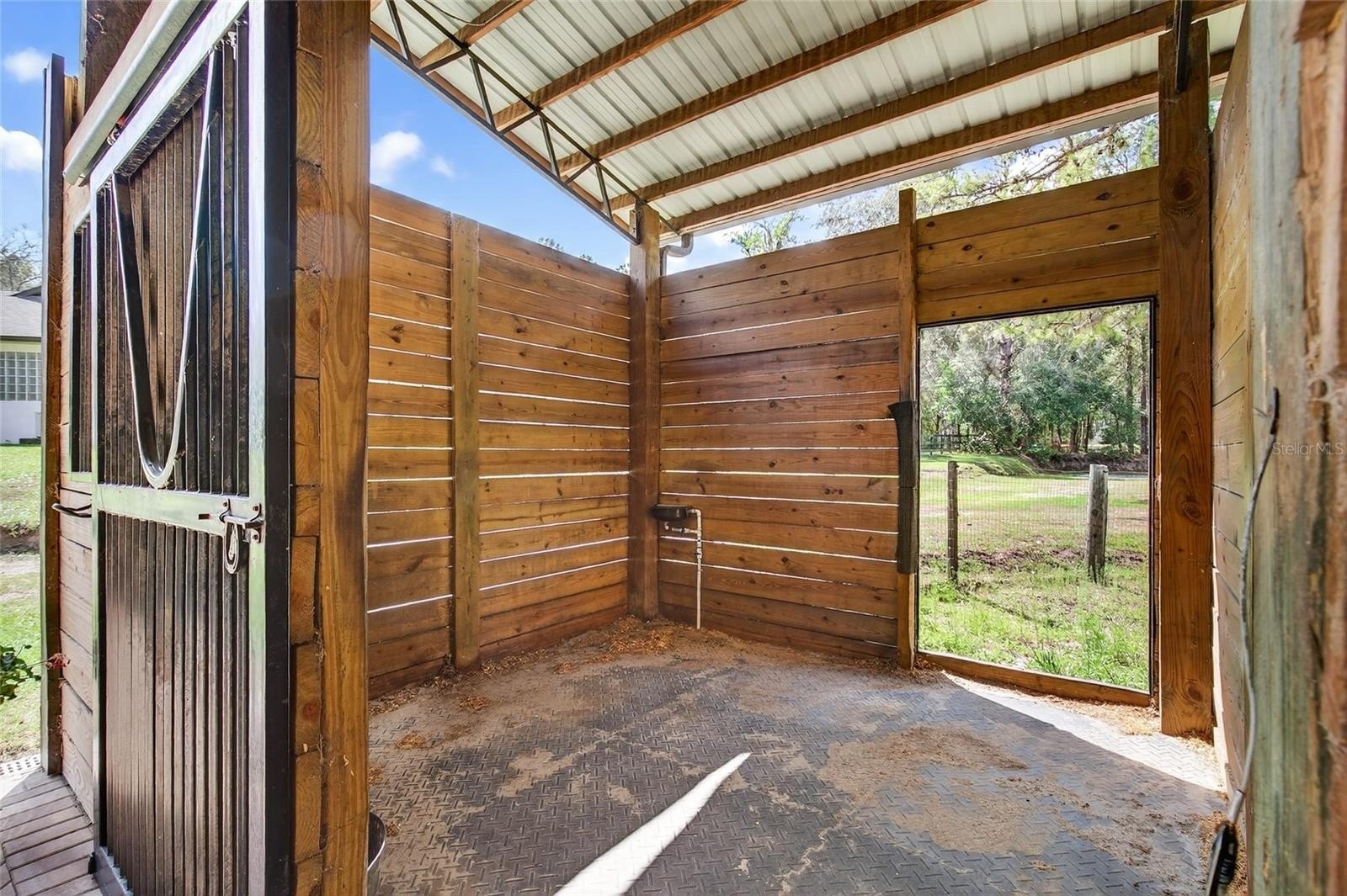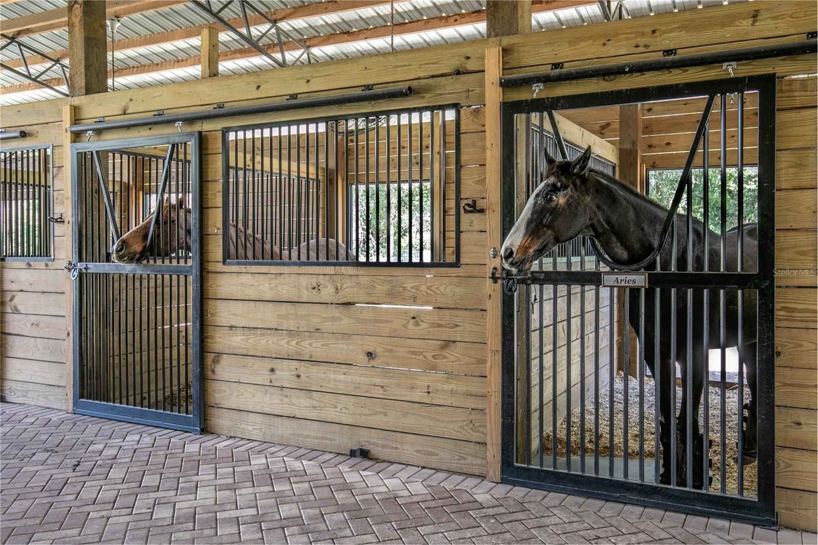 Exceptional design and thoughtful planning define this beautifully appointed equestrian property where well-equipped horse facilities and comfortable living spaces come together to create a truly turnkey horse estate. At the center of the property is a thoughtfully designed main barn built with both functionality and airflow in mind. A striking 16-foot pavered center aisle leads to eight spacious 12' x 12' stalls, each with attached run-ins that provide flexibility and excellent ventilation. The barn is equipped with oversized aisleway fans, automatic waterers, lighting and electrical outlets in every stall, two 12' x 12' wash racks, a feed room, and eight walk-in tack lockers for organized storage. An air-conditioned kitchenette with hot and cold water adds convenience for daily barn operations. The layout also allows the option to add an additional stall or expand hay and feed storage if desired. An additional two-stall barn with wash rack is located within one of the paddocks.
