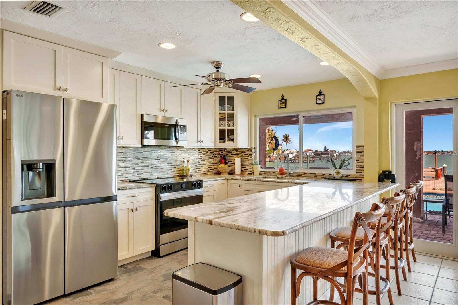 Wide open water views set the stage for this coastal Mediterranean waterfront pool home on St. Pete Beach with excellent boating access to the Gulf of Mexico. Situated on an impressive 80 x 120 waterfront lot, a grand entry and soaring cathedral ceilings welcome you into the spacious main living areas where natural light and sparkling water views create a warm and inviting coastal atmosphere. The comfortable living room features a charming wood-burning fireplace and flows naturally into the dining and gathering areas, creating a welcoming space for everyday living and entertaining. The kitchen enjoys beautiful waterfront views and offers breakfast bar seating and stainless appliances, allowing the cook to remain connected to the living areas while enjoying the water backdrop. Easy access from the kitchen to the covered lanai makes outdoor dining and grilling convenient, allowing food and drinks to move effortlessly between the kitchen, pool area, and outdoor entertaining space. Upstairs, the primary suite serves as a peaceful private retreat featuring a spacious bedroom with balcony access overlooking the water, a large walk-in closet, and a generous bathroom with soaking tub, dual vanities, and a separate water closet. A second-floor landing currently serves as a home office area and provides flexible additional living space. Downstairs, the home offers three additional bedrooms including two waterfront bedrooms that capture beautiful open water views, a highly desirable and uncommon feature that allows guests or family members to enjoy the same stunning water setting found in the main living areas. Bedroom two is a particularly inviting space with its own sitting area, walk-in closet, and bathroom featuring a soaking tub, creating a comfortable private suite for guests or extended family, while bedroom three also enjoys waterfront views and features sliding doors that open directly to the backyard and waterfront setting. Outside, the tropical backyard creates the ideal Florida waterfront lifestyle with a private pool, paver pool deck, covered lanai, and lush landscaping overlooking the water. Boating enthusiasts will appreciate the private dock with open water views, 15,000 lb boat lift, durable steel seawall, and quick boating access to the Gulf of Mexico. Living on St. Pete Beach means embracing the coastal lifestyle where many residents enjoy using street-legal golf carts to visit favorite local restaurants, beach access points, and nearby waterfront spots. From this location you also enjoy easy access to downtown St. Petersburg, Tampa, and Sarasota, offering the perfect balance of beach living and city convenience. Experience wide open water views, exceptional boating, and the best of St. Pete Beach living—schedule your private showing today.
