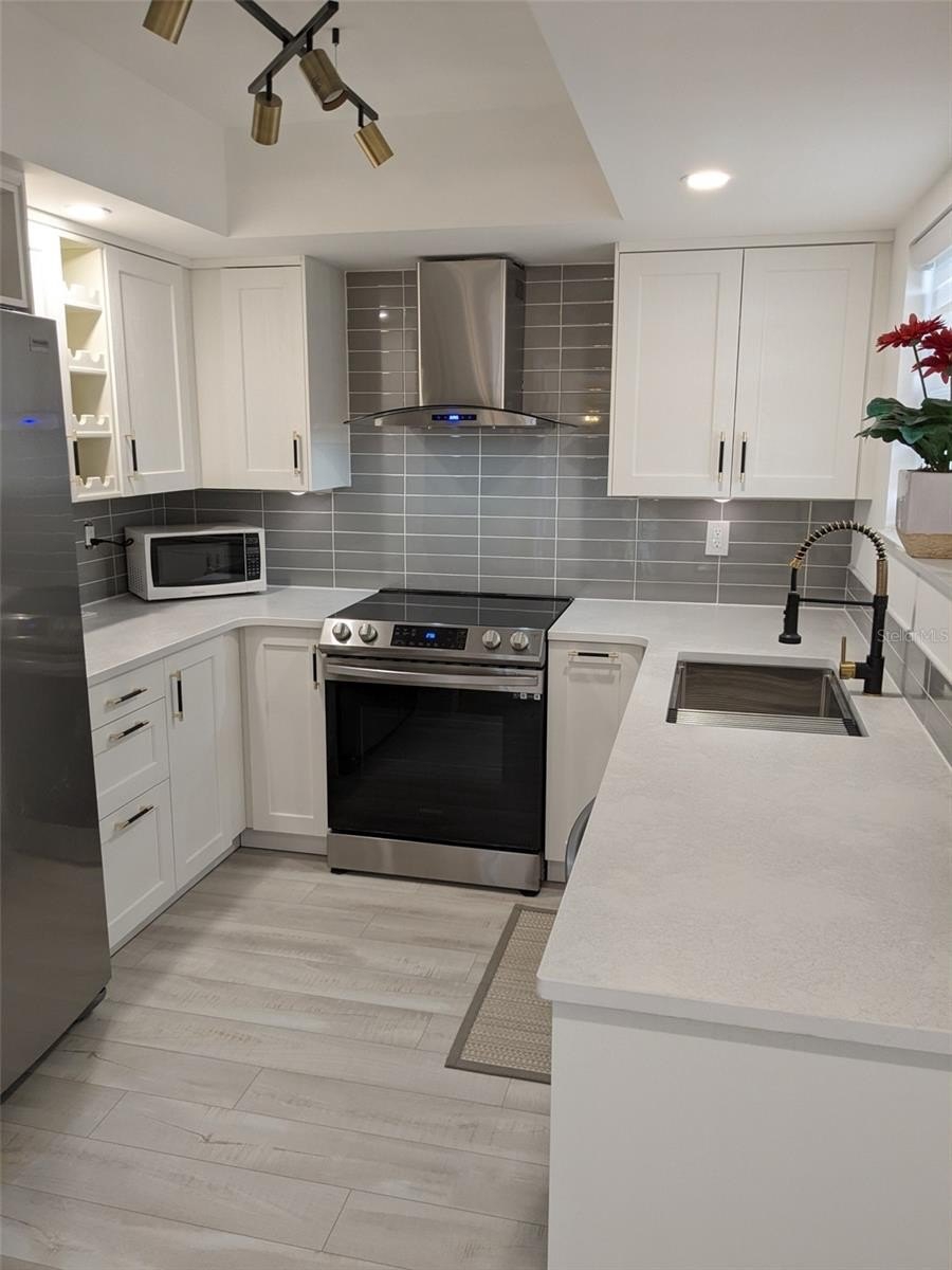 Welcome to this beautifully landscaped 55+ community. Move in ready south facing home with lots of bright sunlight and full privacy with no properties straight across from you looking in. Remodeled in 2024, kitchen has stainless steel appliances with low profile range, stainless hood and undermount kitchen sink, high-end quartz countertops with a ceramic backsplash. Led lighting throughout the home, luxury vinyl plank flooring and base moldings throughout the home. Spacious vaulted ceilings in the dining and living rooms. Large bedroom with lots of closet space. Large double glass patio sliders from living room to the air conditioned and window enclosed large lanai. Dedicated private covered parking spot also included. Community amenities include pool, ponds, fountain, tennis and pickleball courts, shuffleboard courts, a library, and a card room, ensuring there's always something to enjoy and all close to restaurants, beaches and amenities.