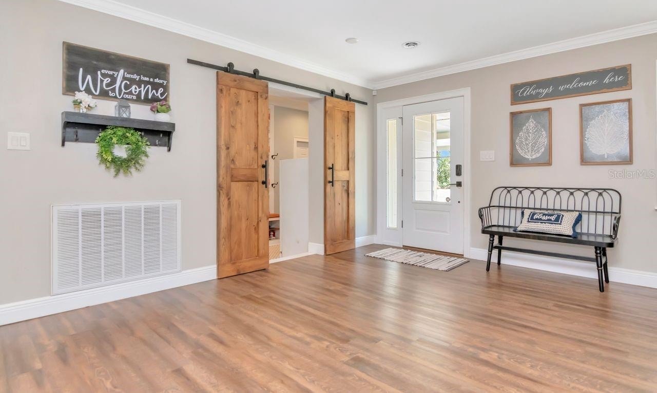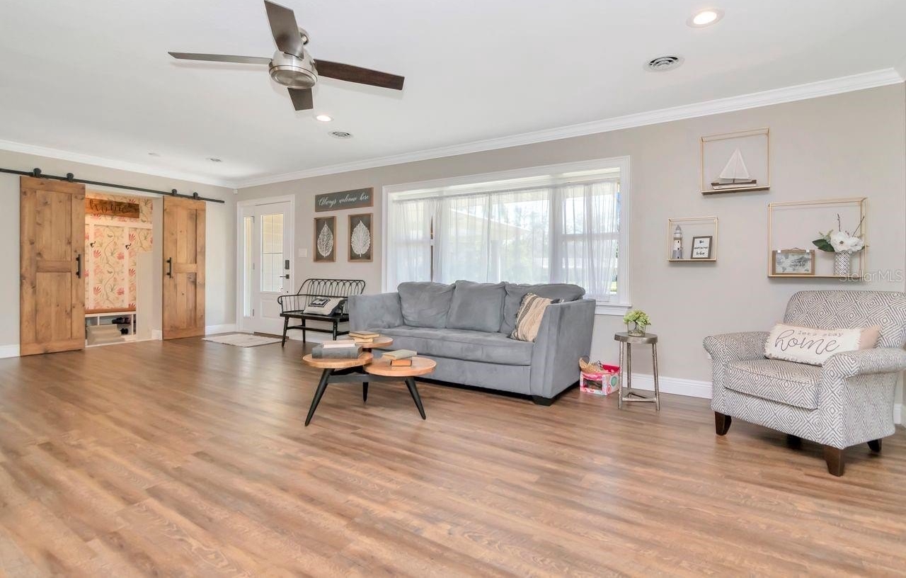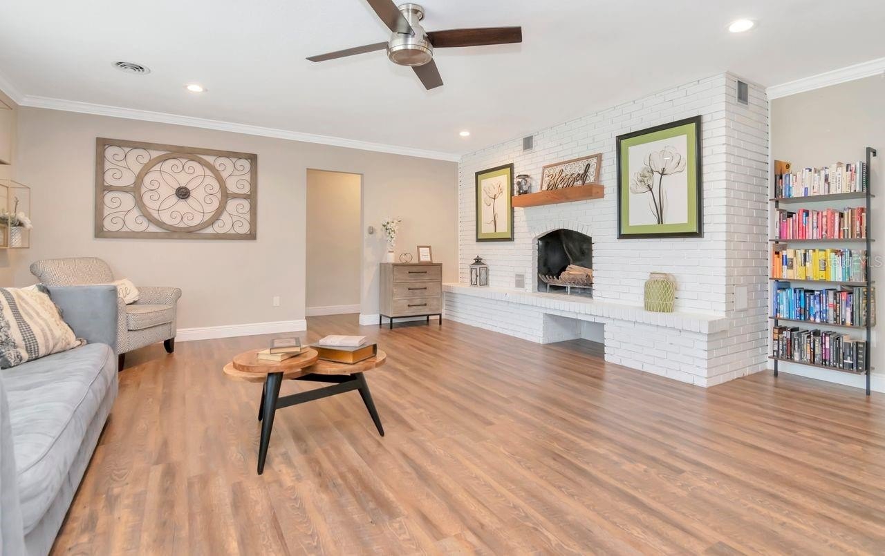 A rare opportunity to own nearly three-quarters of an acre with private pond views in the heart of Tampa. This fully renovated modern farmhouse ranch offers 2,966 square feet, four bedrooms, two and a half bathrooms, and sits on an expansive 0.67-acre homesite in Tampa’s historic North Side Country Club area with no HOA and no CDD. Originally built in 1961 and extensively updated with no carpet, this single-story home blends timeless ranch architecture with modern design upgraded fixtures & hardware throughout. The open-concept layout is flooded with natural light, includes two spacious living areas — a formal living room anchored by a wood-burning brick fireplace and a separate family room ideal for a media room, home office, or flexible gathering space. The redesigned kitchen serves as the centerpiece of the home, featuring an oversized quartz island with pendant lighting, storage and power, custom soft-close wood cabinetry, range hood, dual ovens, stainless steel appliances, and a farmhouse sink overlooking the backyard and pond. A built-in dining bench and French doors opening to the covered and screened lanai, creating seamless indoor-outdoor living. The primary suite is privately positioned at the rear of the home, offering tranquil pond views and a remodeled en-suite bath. Three additional bedrooms provide space for guests, workspace, or flexible use. Renovated full and half baths feature cohesive modern finishes.