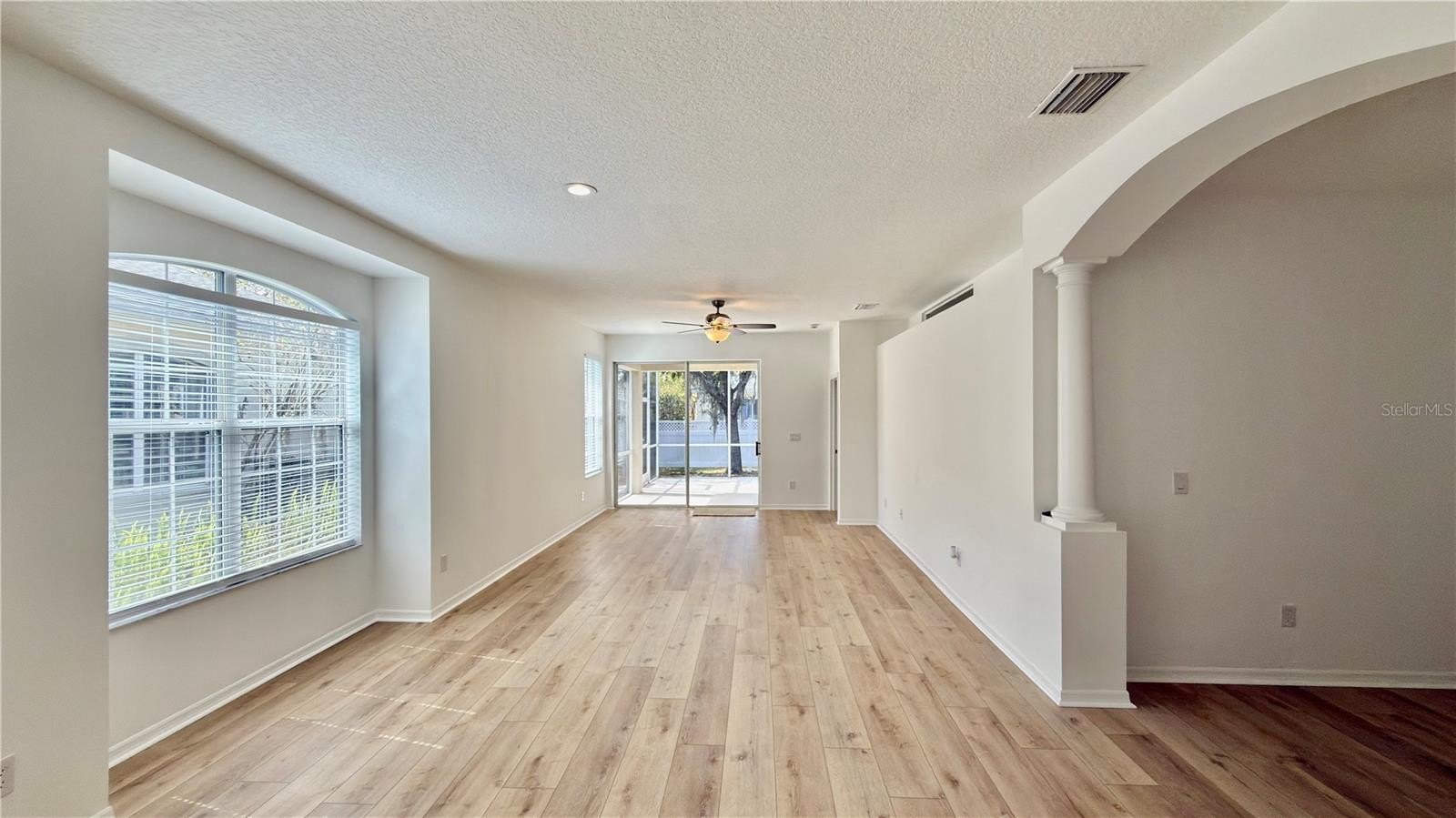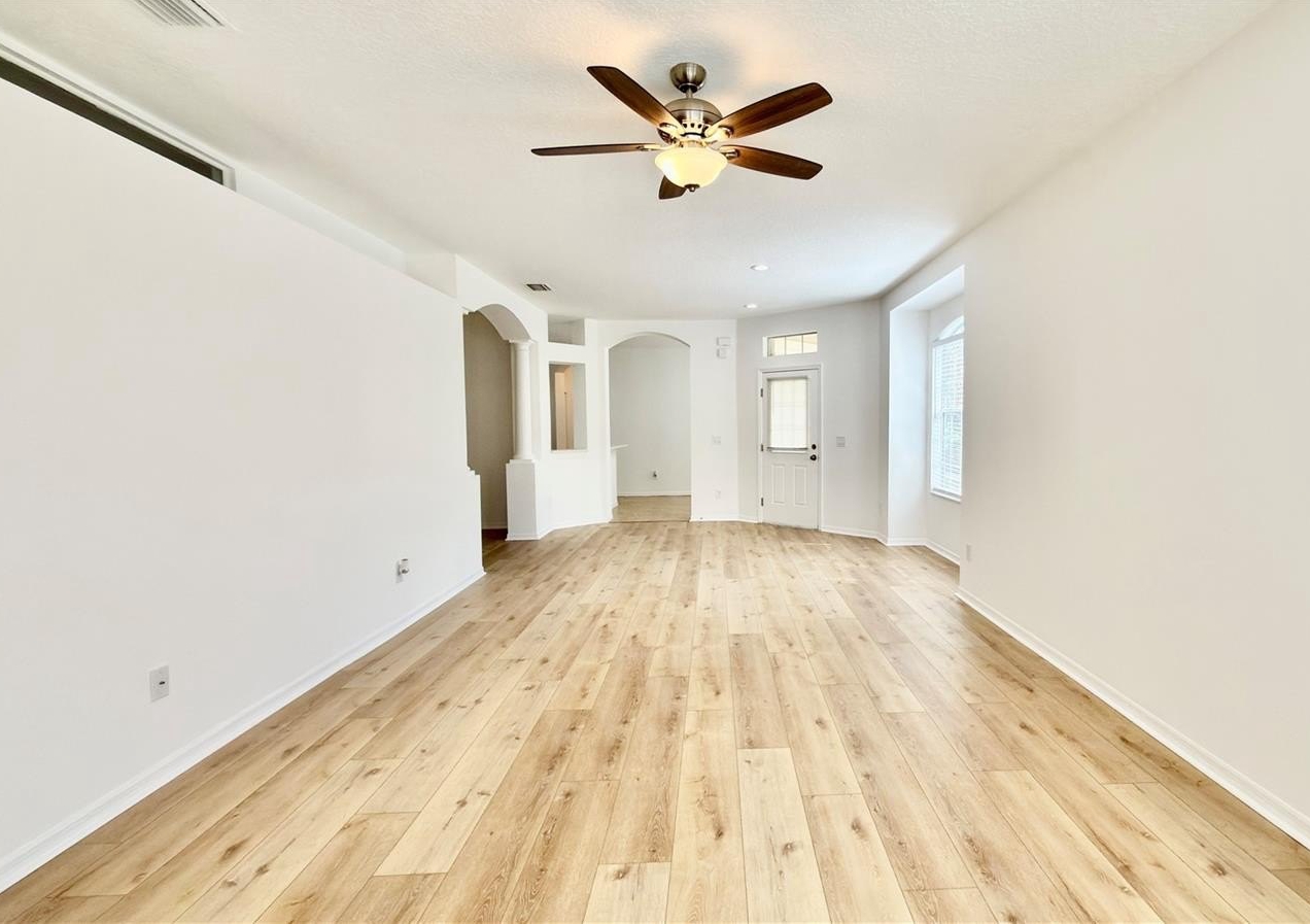 The home features a bright open-concept floor plan filled with natural light and designed for easy living and entertaining. Recent upgrades include luxury vinyl plank flooring throughout the main living areas, brand new carpet in the guest bedroom, and fresh interior paint throughout the entire home.