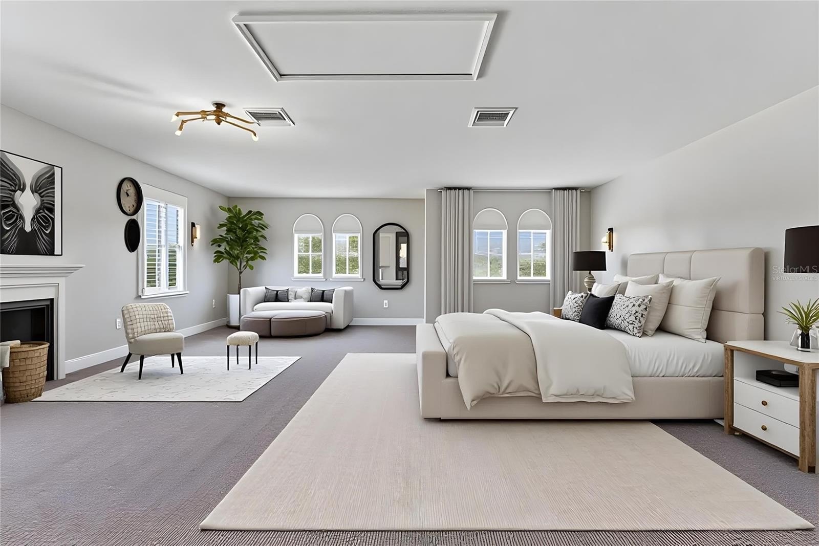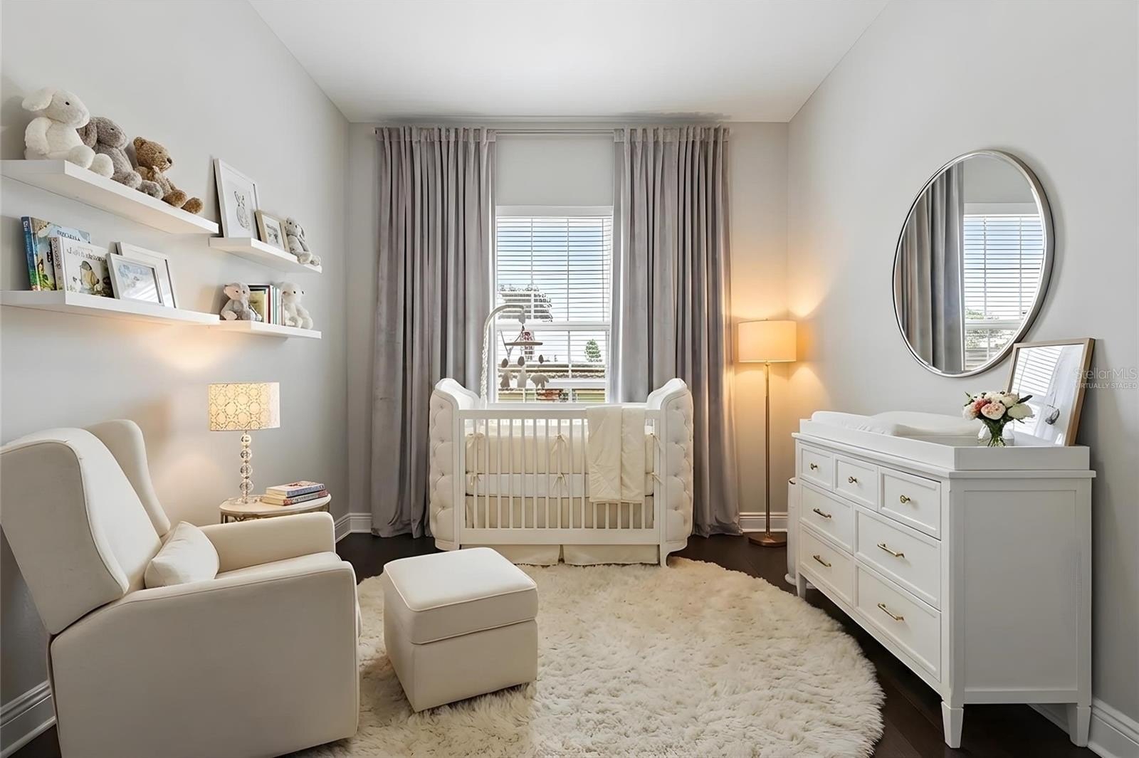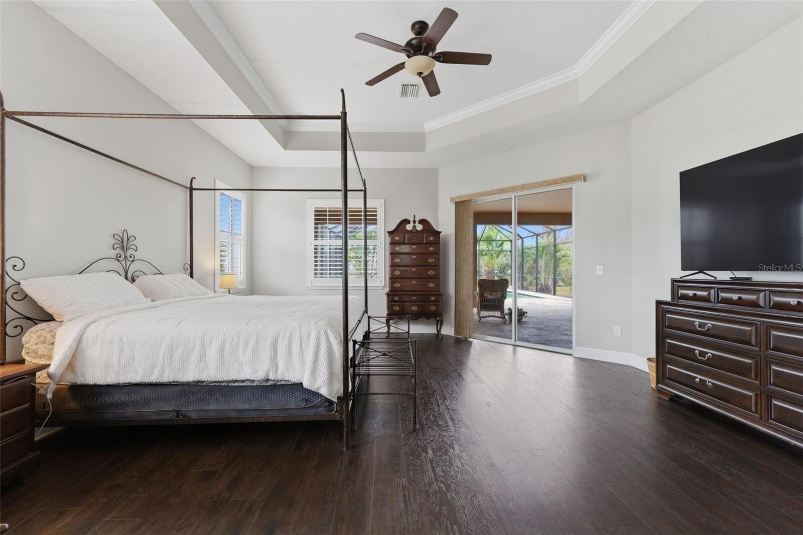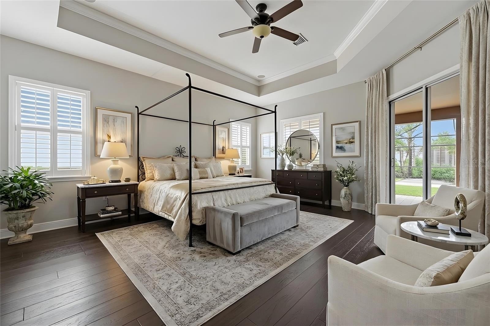 At the opposite side of the main living spaces, a more private hallway transitions you into the owner’s wing. Just before the primary suite, a flexible room works beautifully as a nursery, office, sitting room, dressing room, or creative studio space. The primary bedroom is spacious and serene, and opens to the lanai and pool, allowing you to enjoy the water and waterfall feature. The primary bath offers a spa-like experience with a large walk-in shower, separate soaking tub, dual vanities, private water closet, and a generously sized walk-in closet.