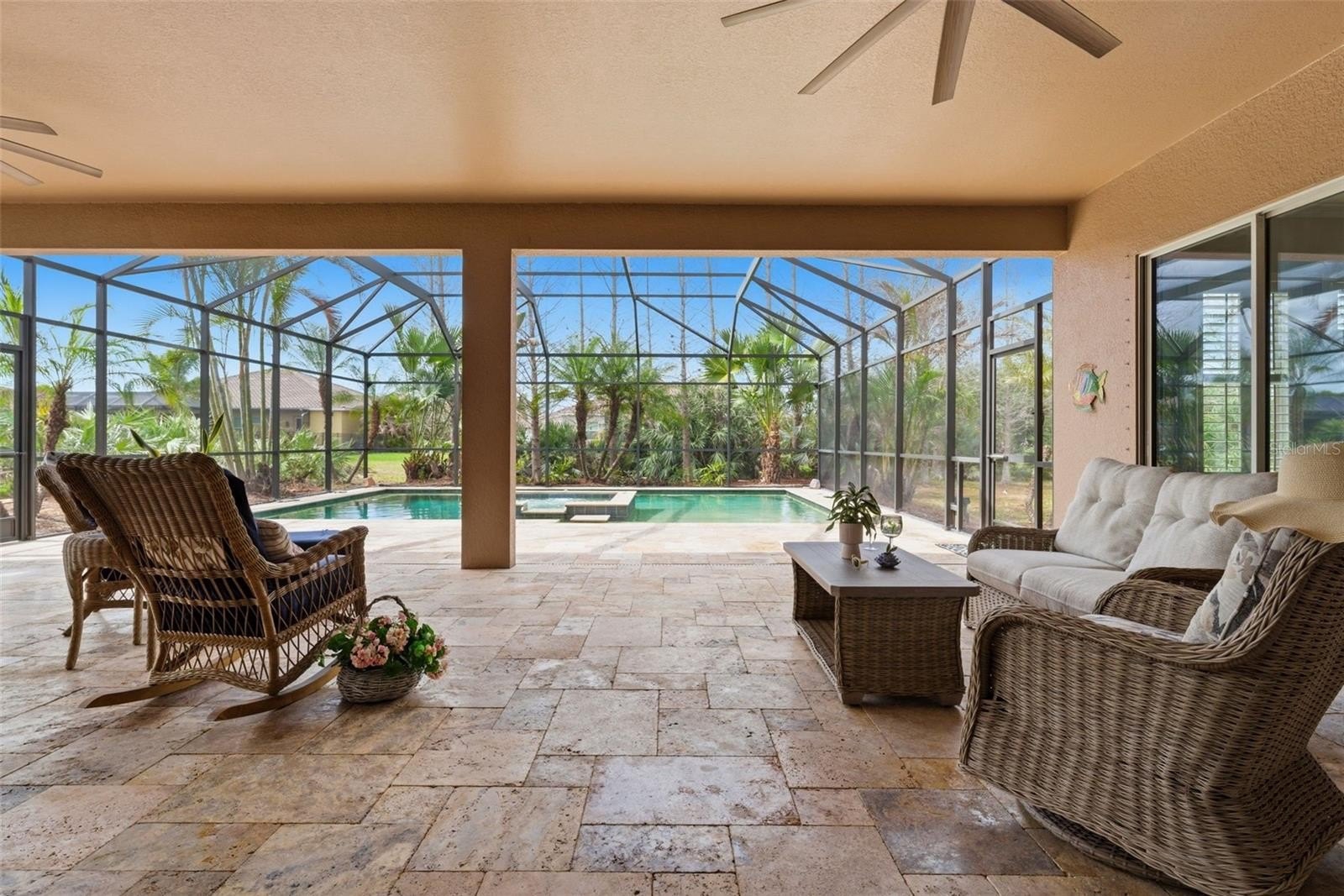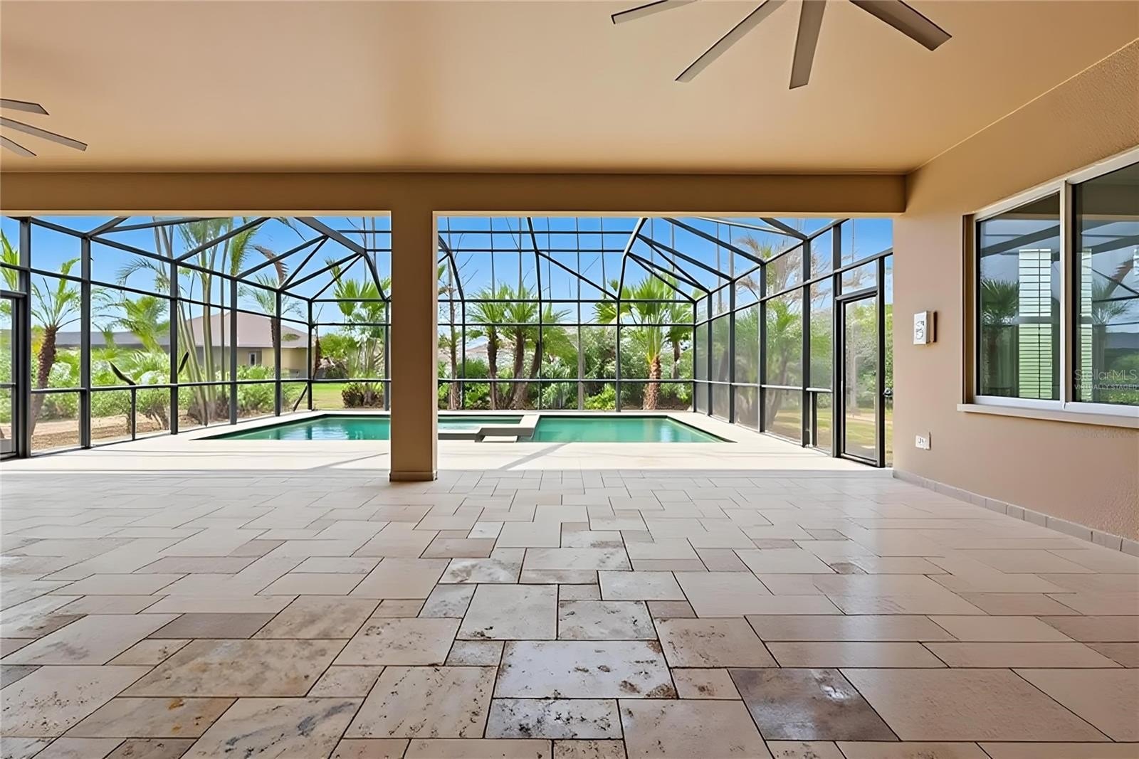 The pool has with a gentle beach-entry design that offers a gradual slope into the water and a spa with a waterfall feature that enhances the soothing atmosphere. The expansive, travertine-tiled lanai provides abundant room for lounging, dining, and entertaining, making it an ideal place for everyday relaxation as well as gatherings.