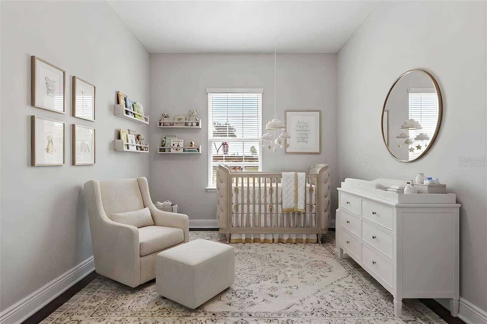 A practical first-floor layout places two secondary bedrooms just off the kitchen, with a well-situated bathroom between them—perfect for morning routines or guest use.