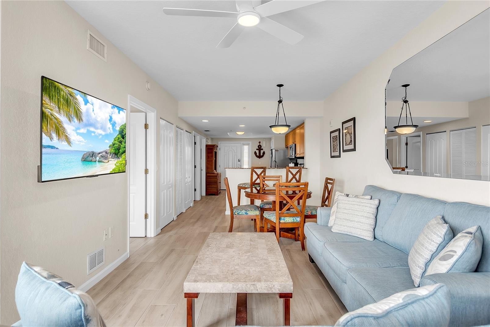 Experience beachfront ownership at Sunset Vistas Beachfront Resort with this beautifully updated third-floor two-bedroom, two-bath residence located on the desirable south side of the building. Unit 304S enjoys attractive Gulf views and a bright coastal exposure, where the southern orientation captures warm winter sunshine while remaining comfortable through the summer months. This fully furnished condominium is offered turnkey and rental ready, presenting an excellent investment opportunity within one of Treasure Island’s most popular beachfront condo-hotel communities. The residence has demonstrated solid rental performance with income of $61,342 in 2022, $64,860 in 2023, $58,705 in 2024, and $45,759 in 2025, a year that included temporary closures as the resort completed storm recovery work, refreshed hallways, and repainted the building. With the property now restored and looking beautiful again, the unit is positioned well for future rental activity. Inside, the open floor plan features beautiful tile plank flooring throughout and a full kitchen with granite countertops, breakfast bar seating, dining area, and GE slate stainless steel appliances. The comfortable living area offers ample seating, a sofa sleeper for additional guests, and a wall-mounted television, creating a welcoming space for relaxing after a day on the beach. Sliding glass doors lead to the private balcony where Adirondack chairs provide the perfect place to enjoy Gulf breezes and coastal sunsets. The primary suite also opens directly to the balcony, allowing owners and guests to wake up to the sights and sounds of the Gulf, while the guest bedroom features nautical-inspired décor and its own wall-mounted television. A washer and dryer are conveniently located inside the unit for owner and guest use. Sunset Vistas offers a full resort experience including a large beachfront pool and spa, a separate children’s pool with fountains, beachfront tiki bar, café, fitness center, and professional onsite management, with the flexibility to utilize offsite management or self-manage if desired. Located directly on the sugar sand beaches of Treasure Island and just minutes from the dining, shopping, and entertainment of John’s Pass Village, this property blends lifestyle and income potential in one compelling opportunity. An assigned parking space conveys with the unit. Schedule your private showing today and discover the benefits of owning a beachfront income-producing property at Sunset Vistas.