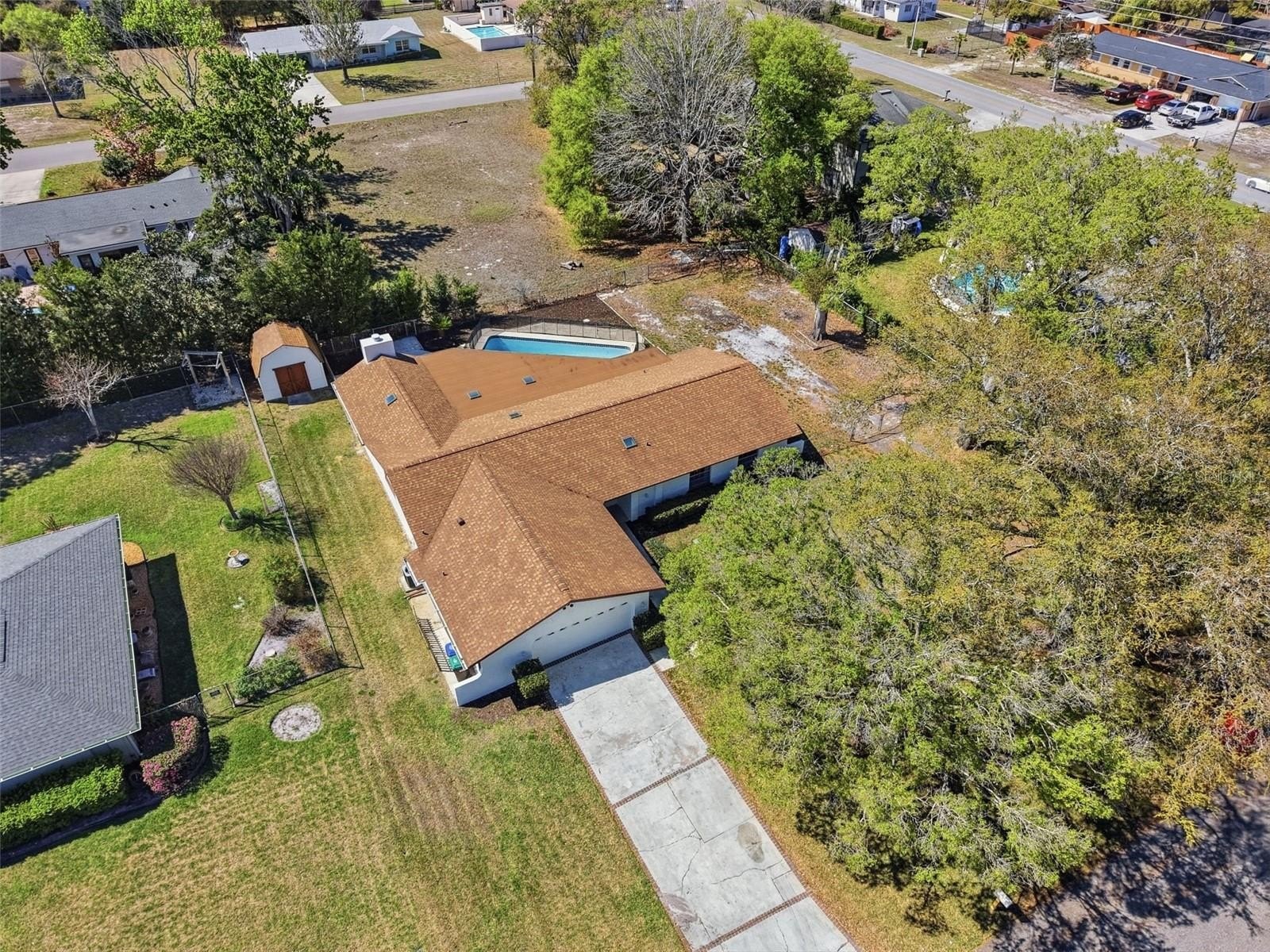 Step outside to enjoy the fenced backyard featuring a refreshing pool, oversized screened patio, and an outbuilding ideal for additional storage, hobbies, or workshop space. A two-car garage provides ample parking and storage.