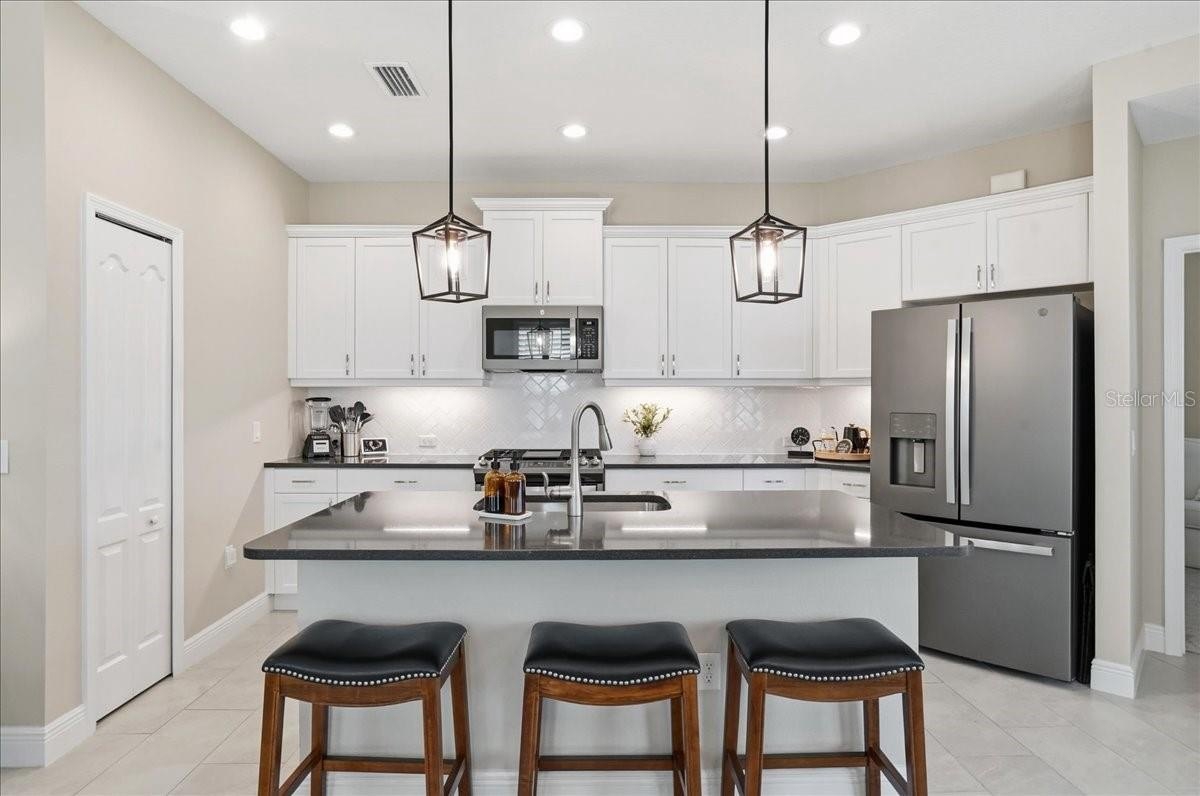 Plantation shutters and hurricane-impact windows add charm and peace of mind throughout. The gourmet kitchen is the heart of the home, featuring stainless steel appliances, gas stove, custom island, and an open layout that keeps the chef connected while entertaining. The spacious primary suite includes a walk-in closet, dual sinks, and an oversized walk-in shower. The interior was recently professionally painted, and bedroom carpeting has been replaced.