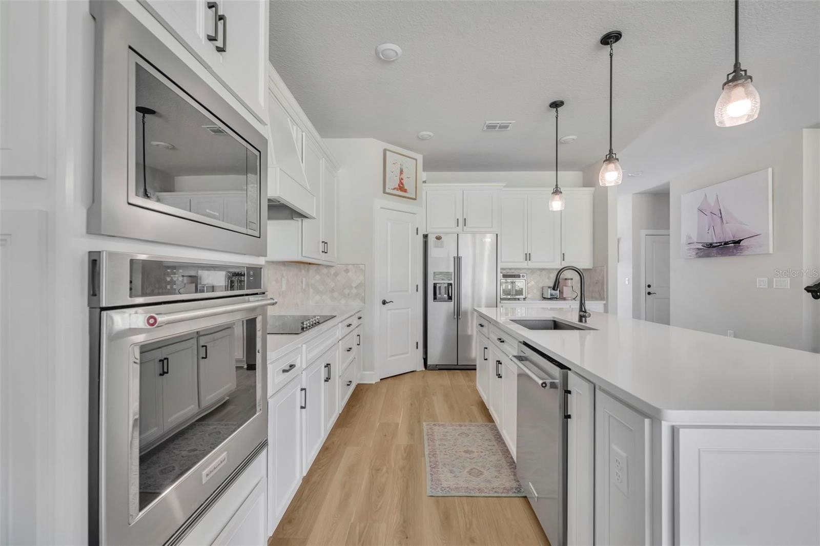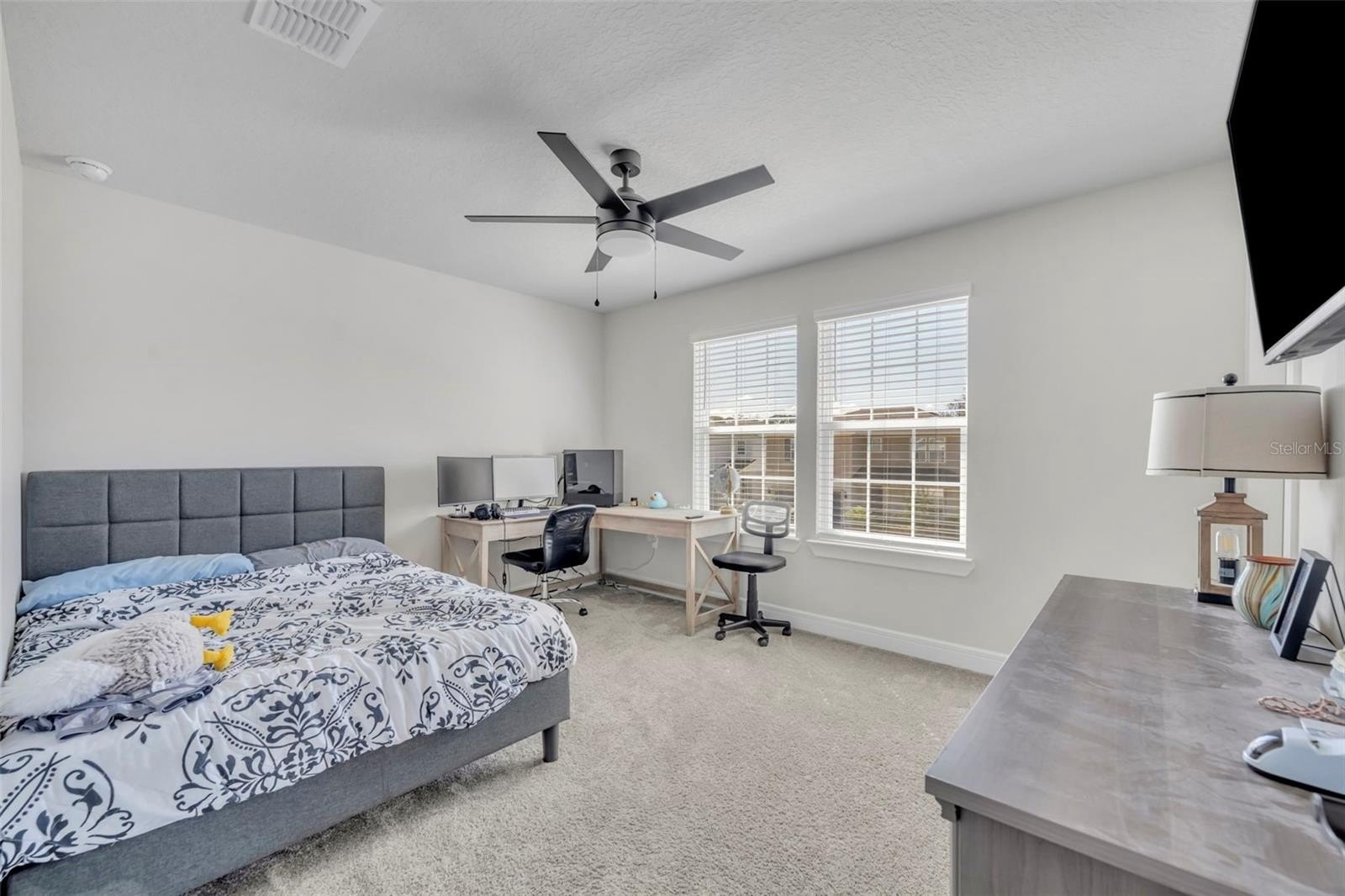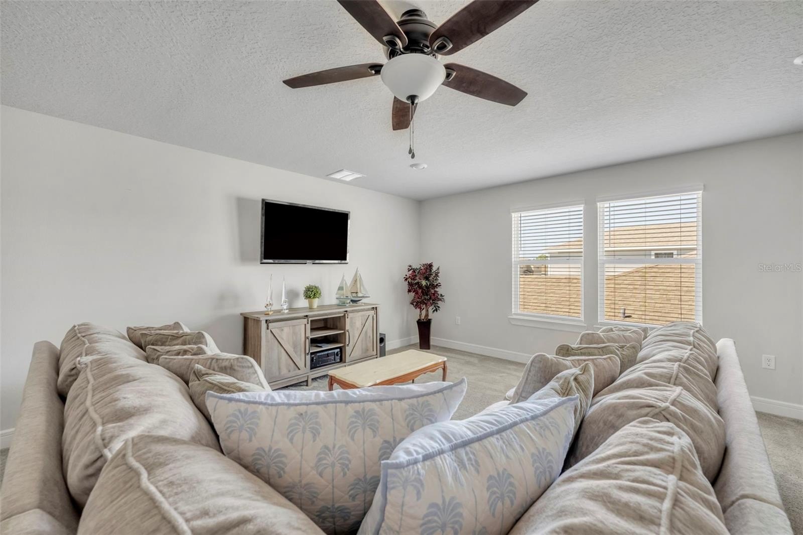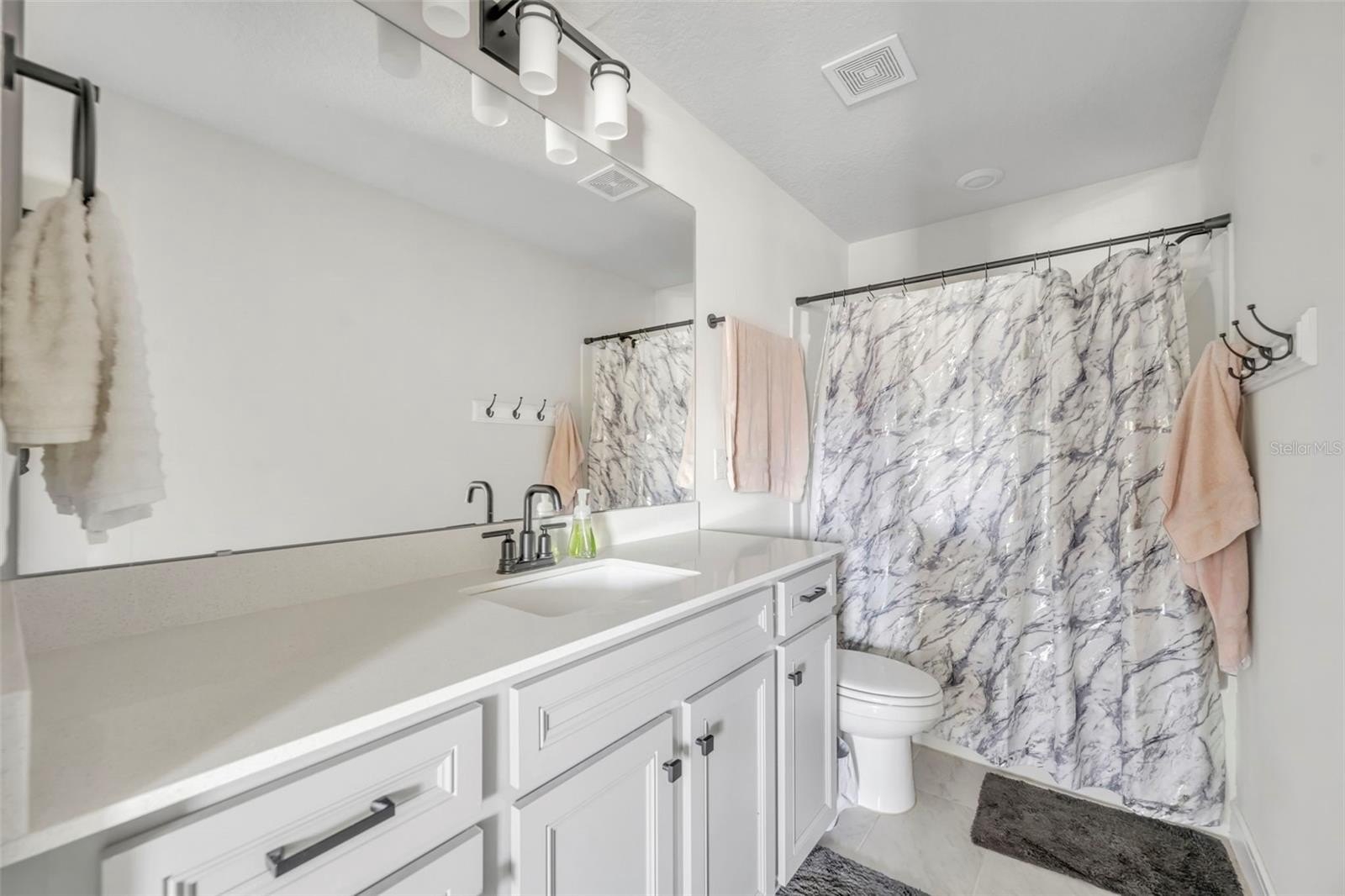 The open-concept kitchen is a chef’s dream, showcasing top-of-the-line quartz countertops, a stylish backsplash, 42” cabinets, stainless steel appliances, and a large island with seating for four, highlighted by modern farmhouse pendant lighting. The main living area flows seamlessly, providing the perfect setting for entertaining friends and family. The first-floor Master Suite offers a serene retreat, featuring a glarge shower, walk-in closet, and double vanity. Upstairs, the spacious loft is ideal for a home theater and game room combination, while three additional bedrooms provide ample space for family and guests. One bedroom includes a full en-suite bath, and the remaining two share a modern guest bathroom with double vanity and tub/shower.
