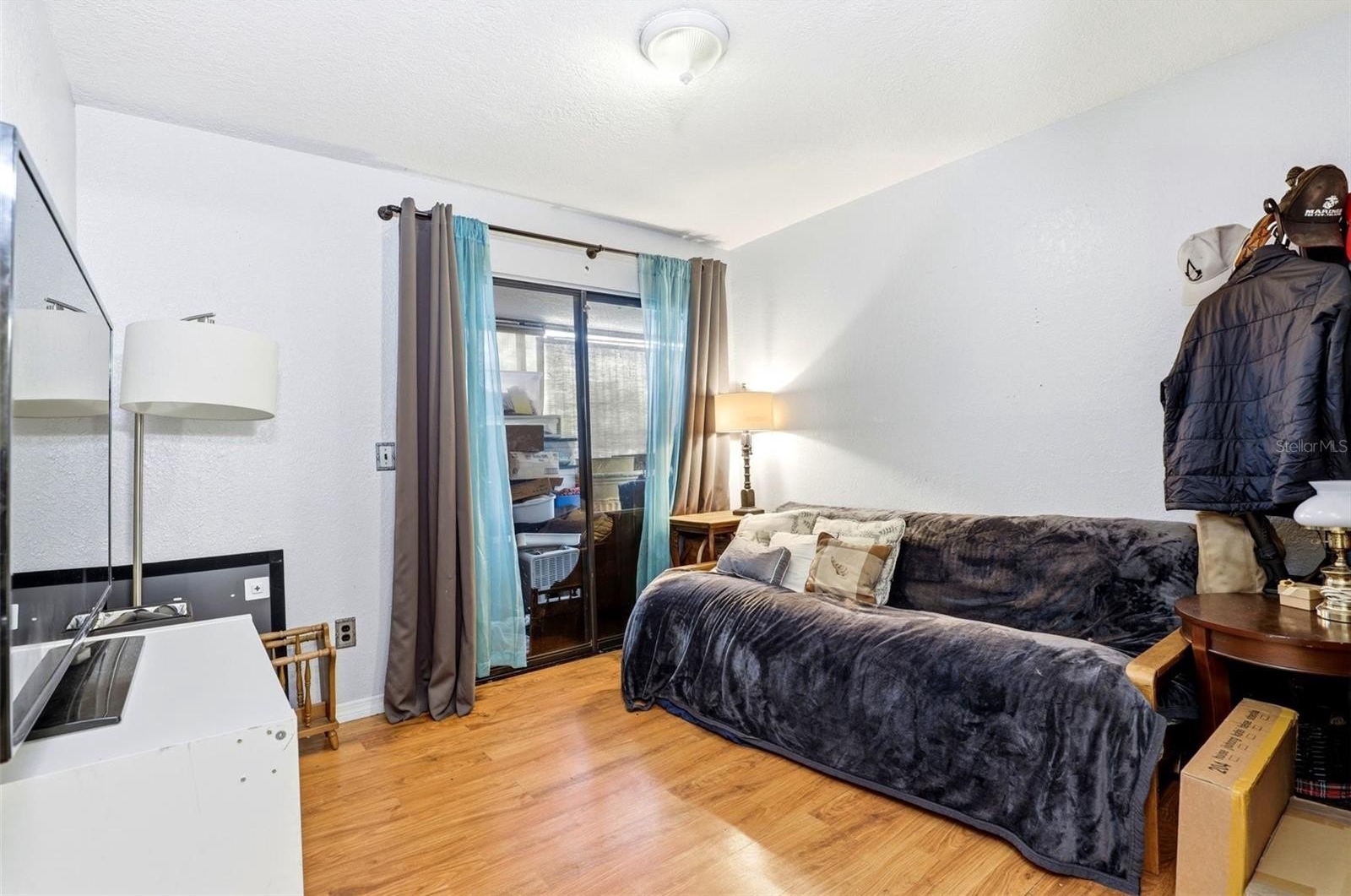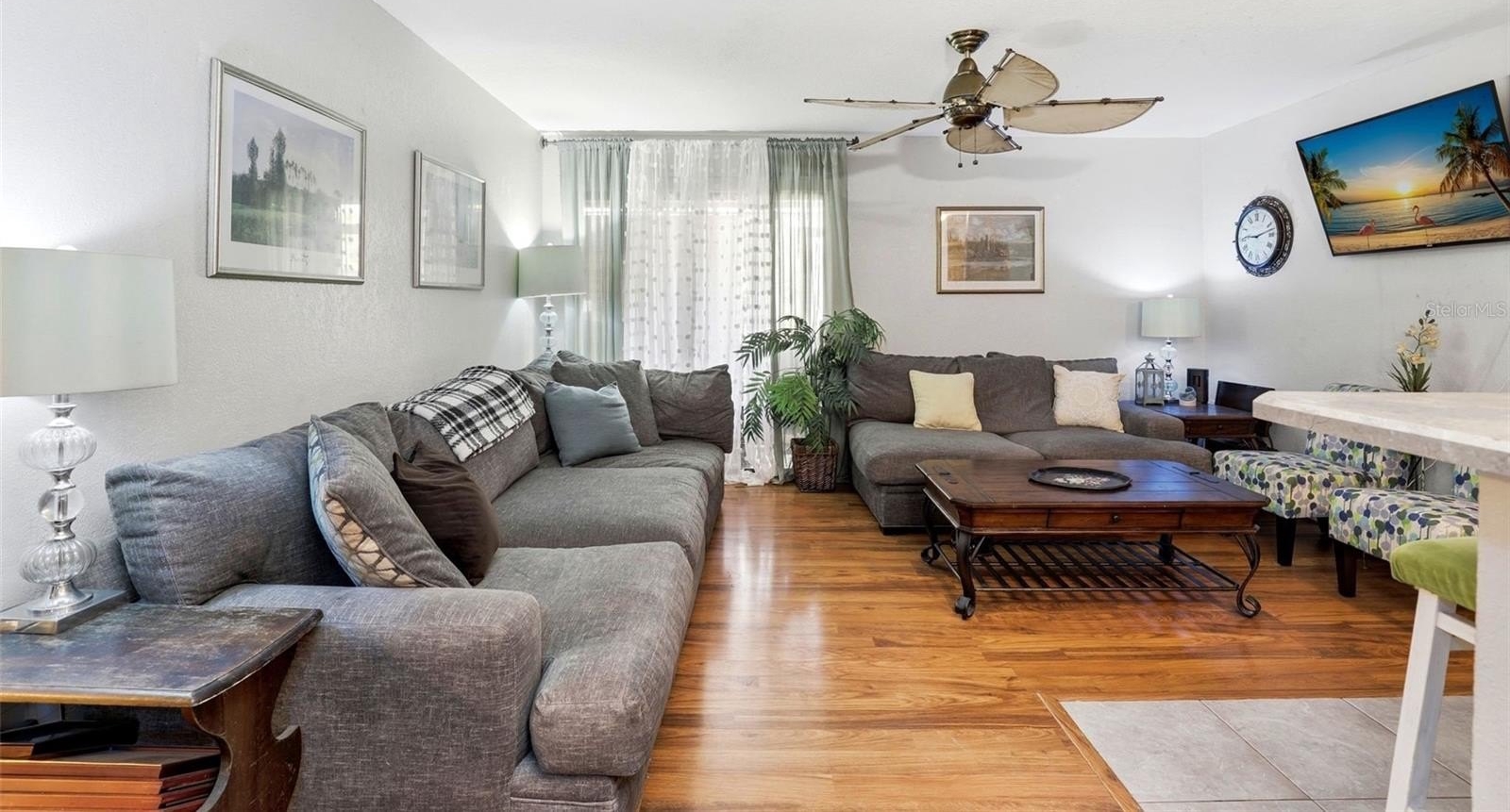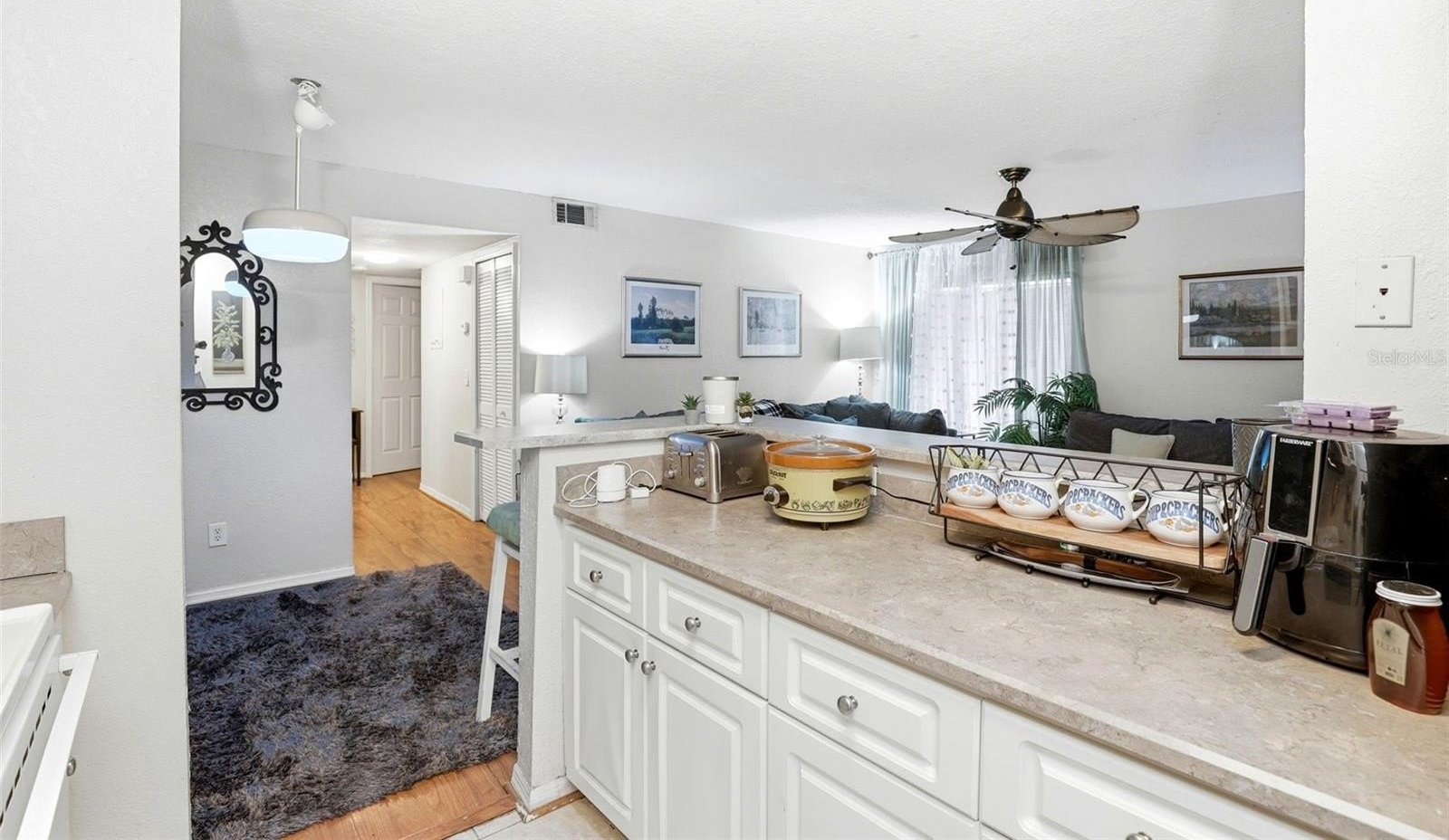 The living area opens to a screened porch, perfect for enjoying fresh air and relaxing outdoor space year-round. The two-bedroom floor plan offers flexibility for guests, roommates, or a home office.