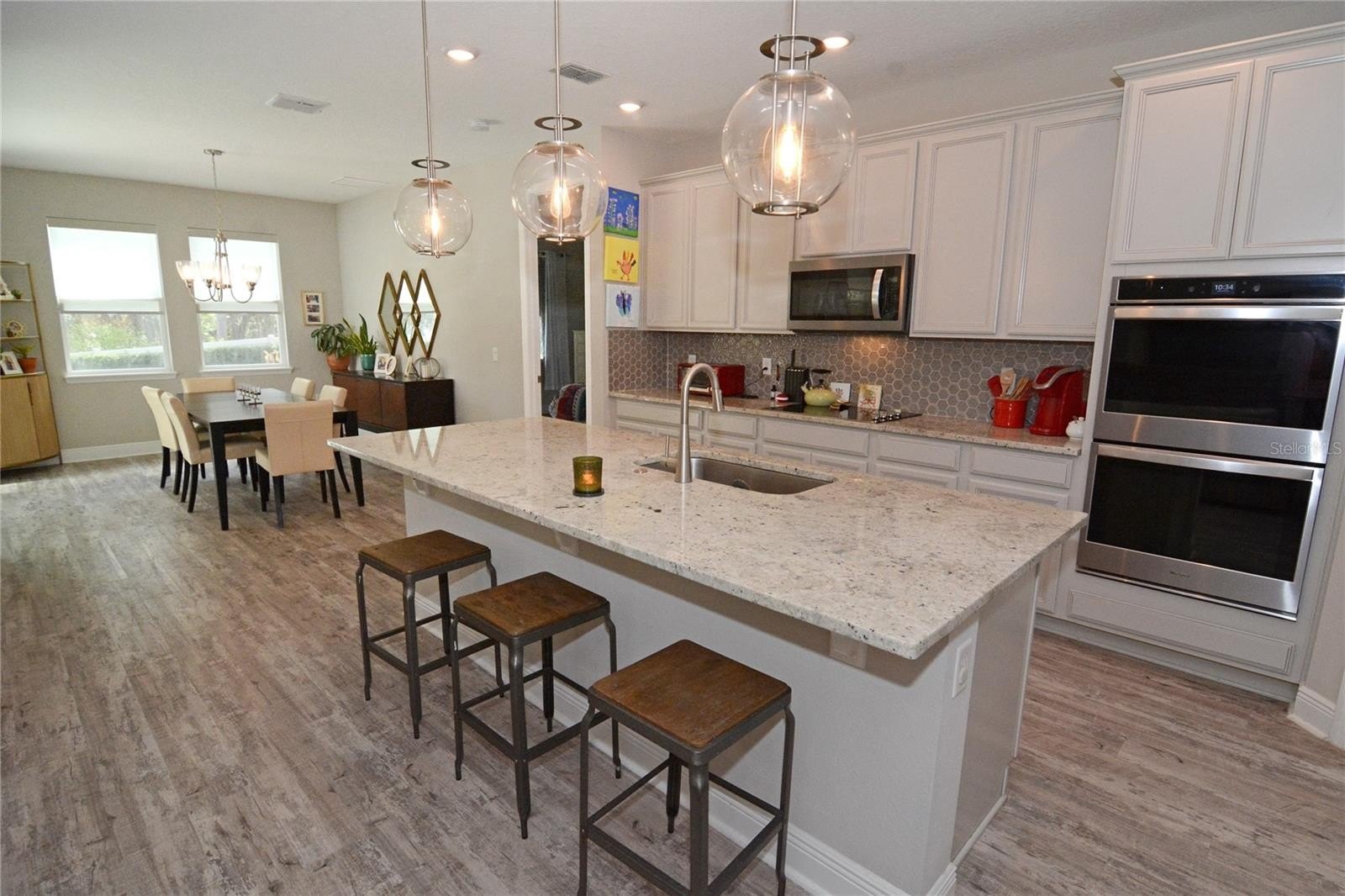 Inside, soaring 10-foot ceilings, 8-foot doors, and luxury vinyl flooring create a bright and expansive atmosphere. The heart of the home is the impressive island kitchen, designed for both entertaining and daily living, featuring quartz countertops, 42-inch cabinetry, a spacious walk-in pantry, and premium Whirlpool appliances including built-in double ovens and a sleek glass cooktop. The kitchen seamlessly opens to the great room and dining space, creating an inviting setting for gatherings.