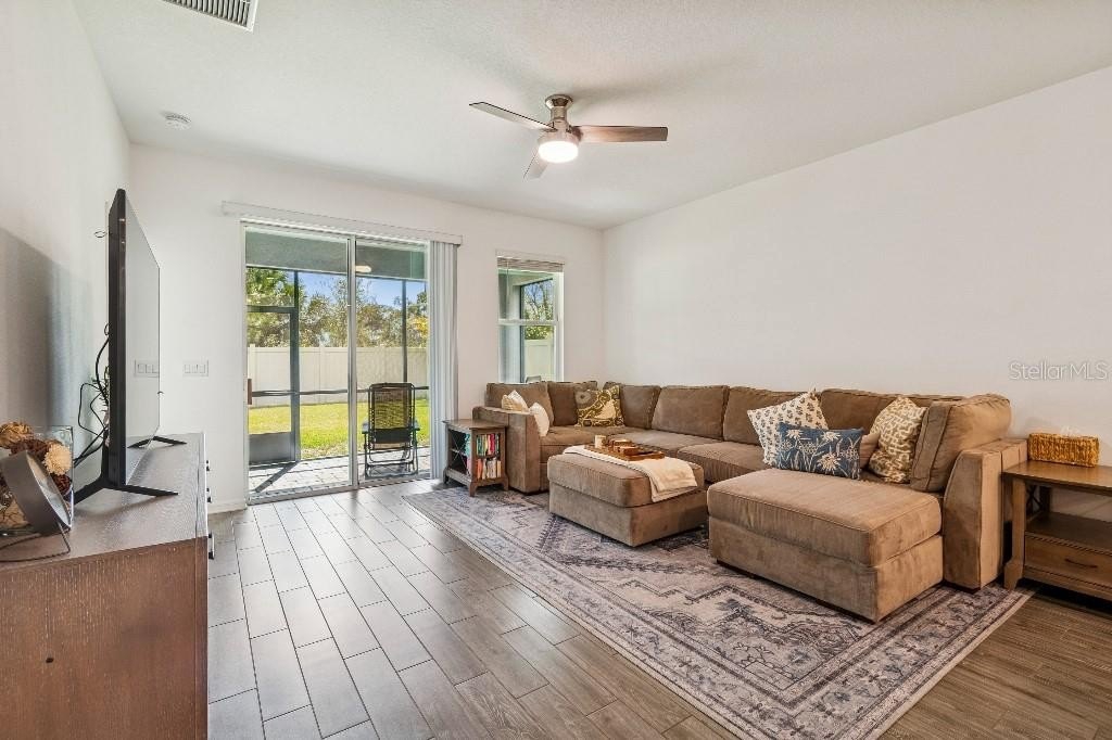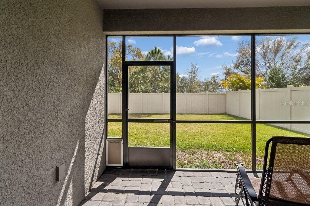 Enjoy Florida living year-round on the covered, screened lanai, overlooking a fully fenced backyard with no direct rear neighbors. The home backs to a tree-lined view, providing added privacy.