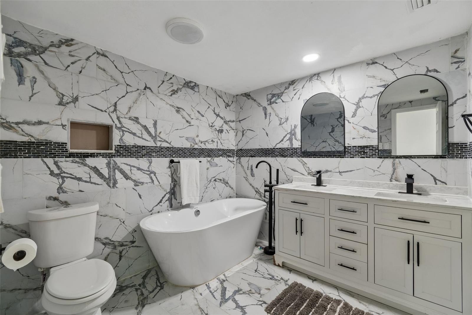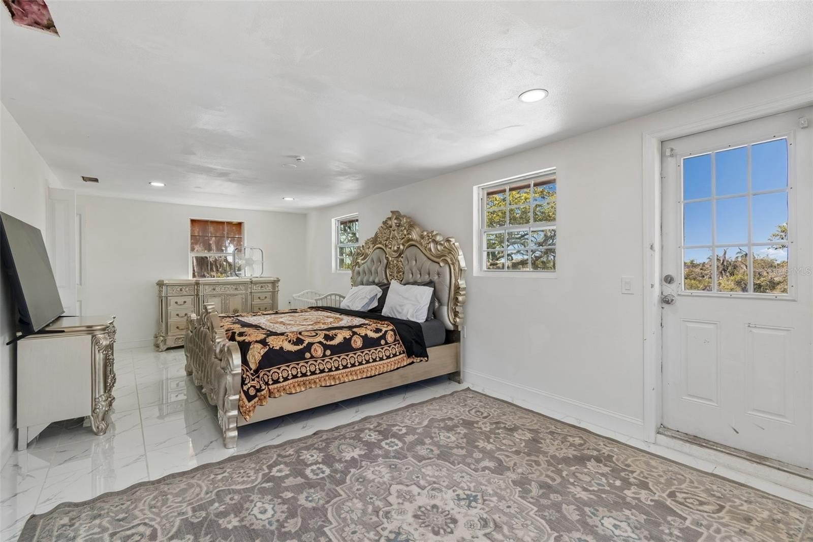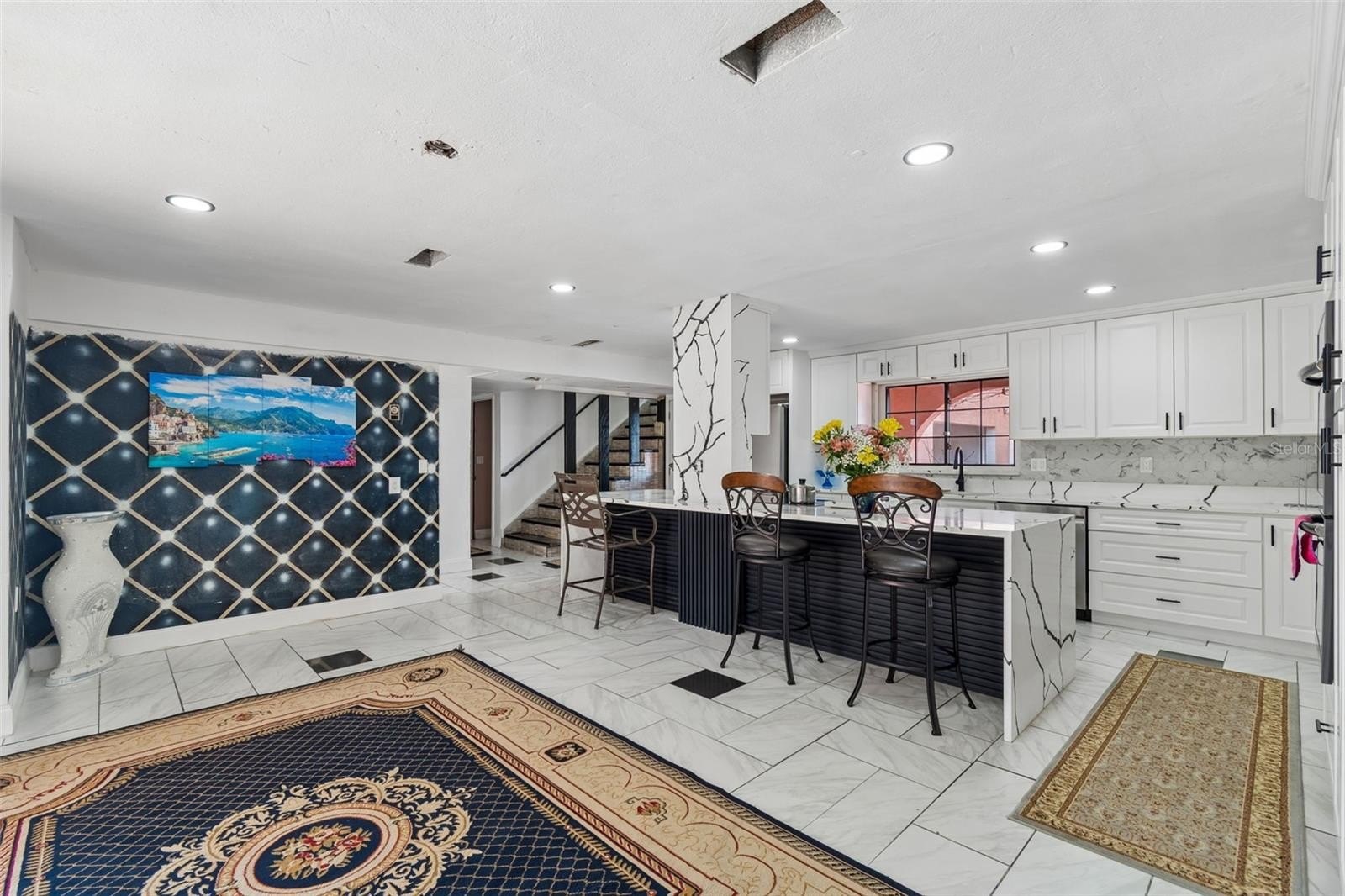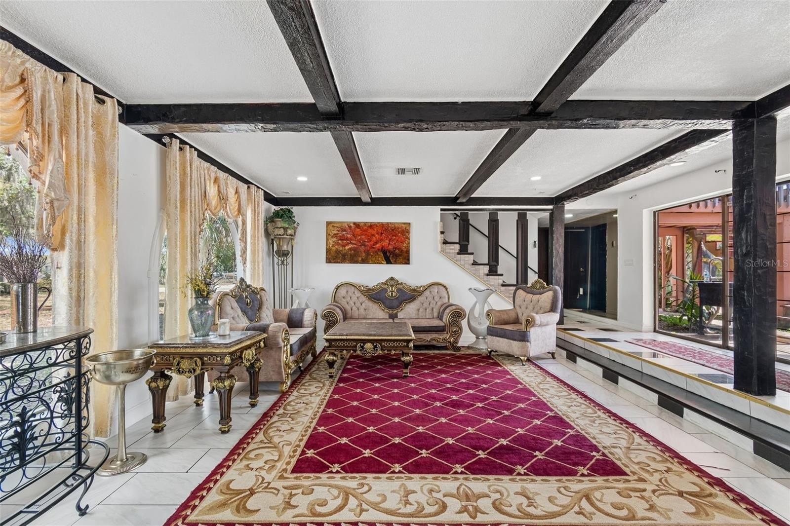 Welcome to this one-of-a-kind exclusive waterfront home in Holiday, set on 1.18 acres at the end of a quiet cul-de-sac on the Anclote River, with water on three sides and approximately 630 feet of waterfront. Surrounded by beautiful moss-draped oak trees, the property offers a private and scenic setting with incredible potential. Featuring Spanish and Mediterranean-inspired architecture, the home showcases arched openings, beamed ceilings, and stone and wood accents throughout. The spacious floor plan includes a sunken formal living room, family room, dining room, office/den and an updated kitchen with a large island, waterfall countertop, range, double oven, and walk-in refrigerator. A flex space with a wet bar and fireplace adds versatility, while the ground floor bath includes dual sinks, sauna with Jacuzzi tub and walk in shower. Two private primary suites, each with separate staircase access, offers comfort and privacy, and both feature private balconies with beautiful water views. Outdoor highlights include a covered deck, gazebo, lanai, oversized 3-car garage, and an expansive yard with room for boat or RV parking and possible tennis court restoration. Buyers will appreciate the opportunity to add a dock and boat lift for easy access to the Gulf of America, perfect for boating, fishing, and enjoying the waterfront lifestyle. This exceptional property offers a rare setting and endless opportunity for updating and personalized touches to create a truly spectacular waterfront retreat. With no HOA and convenient access to Tarpon Springs, beaches, shopping, and dining, this is a rare chance to make it your own.