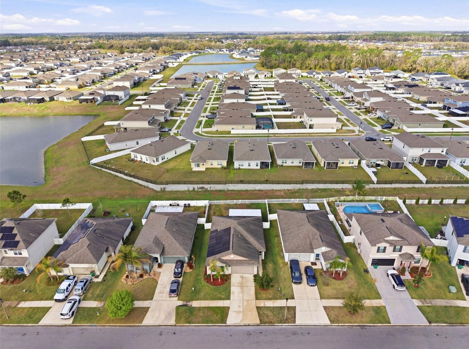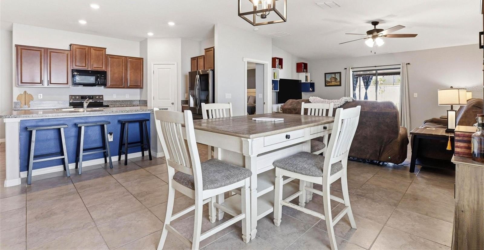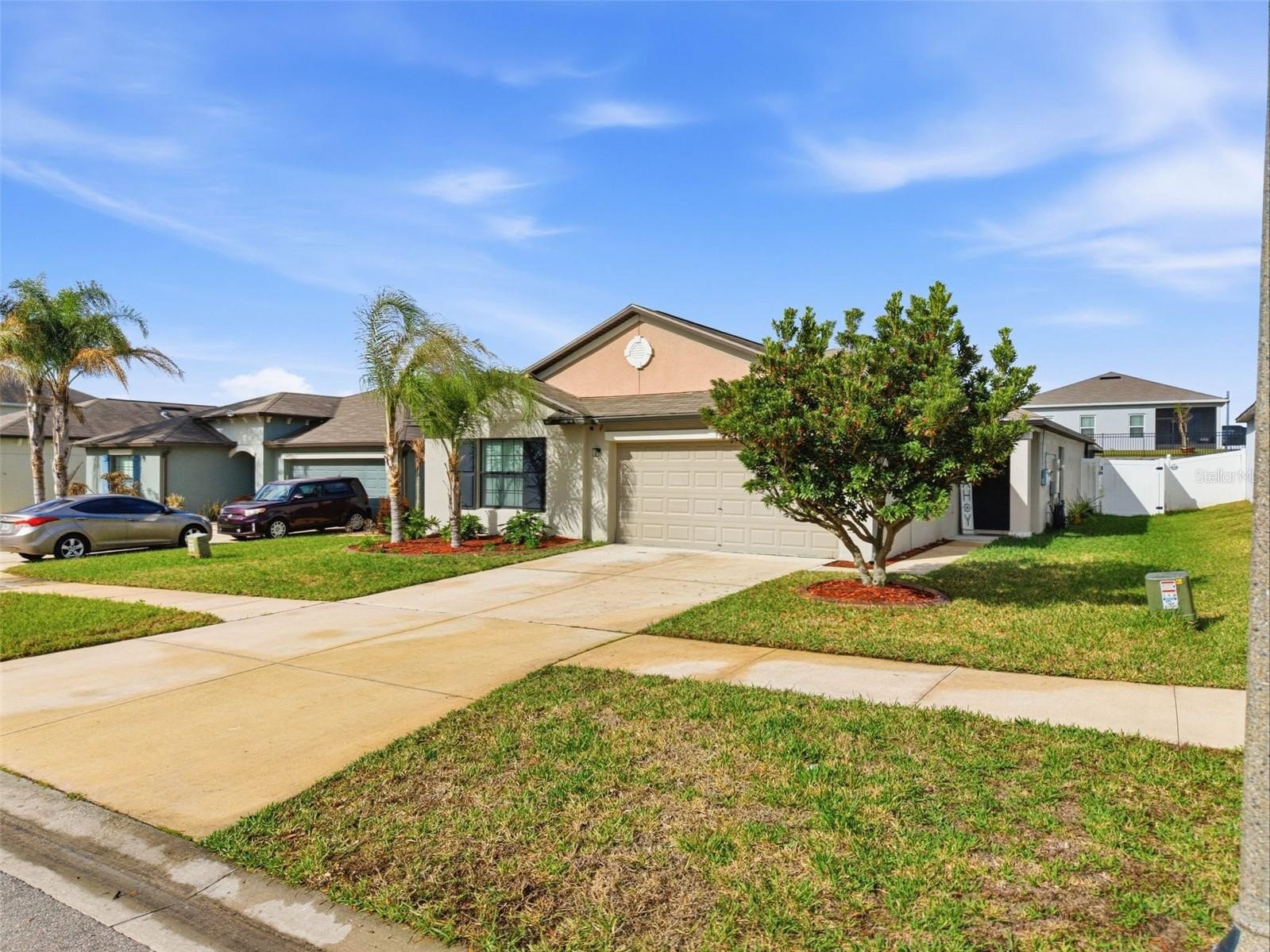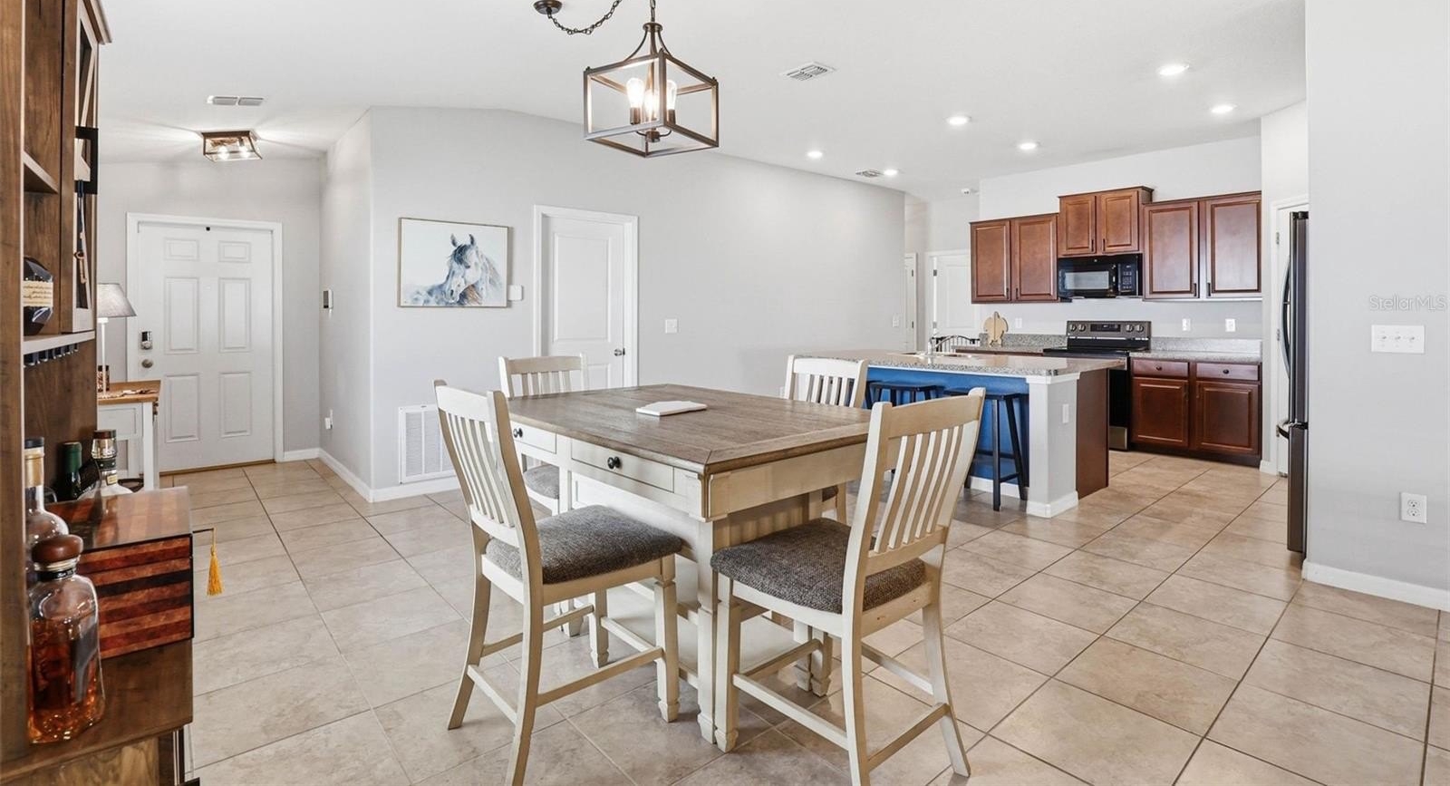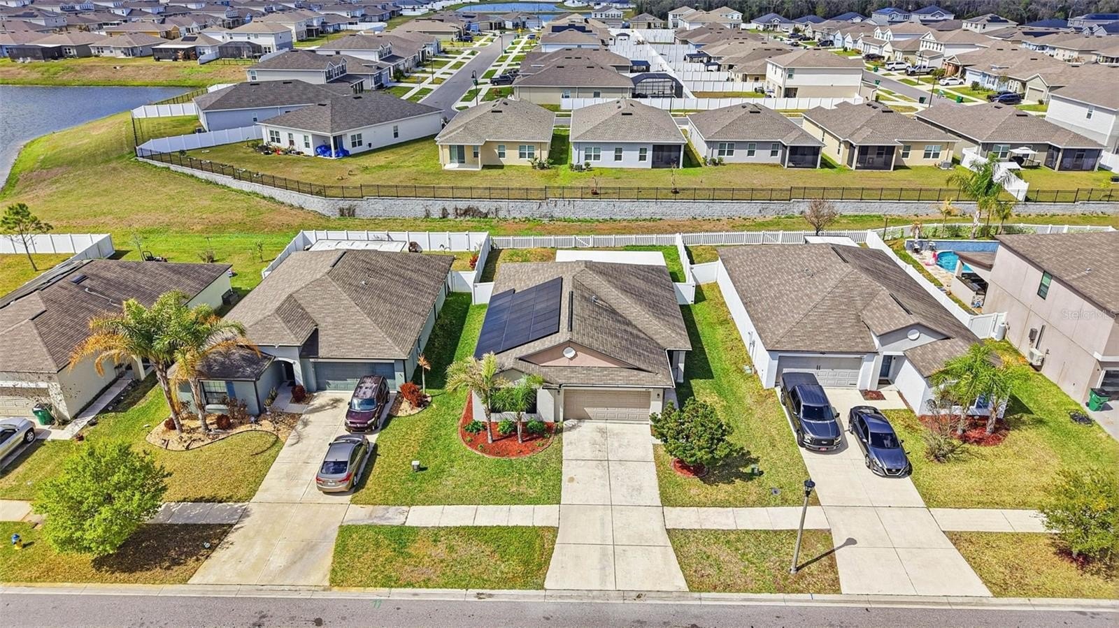 One or more photo(s) has been virtually staged. 6637 Wagon Trail Street, Zephyrhills, FL 33541 — Situated on a quiet cul-de-sac in the desirable Silverado Ranch community, this beautifully maintained Harrisburg model by Lennar offers 4 bedrooms, 2 bathrooms, 1,817 square feet of living space, a 2-car garage, and owned solar panels (2025) designed to help maximize energy efficiency. As you approach the residence, Florida-friendly landscaping, fresh mulch beds, and a six-zone irrigation system create a polished first impression. The driveway leads to a covered entryway accented with solar-powered lighting, setting the tone for the thoughtful details found throughout the home. Step inside to a welcoming foyer filled with natural light and enhanced by an updated lighting fixture. The foyer opens seamlessly into the dining room, where another updated fixture creates an inviting setting for gatherings and everyday meals. Designed with an open-concept layout, the dining area flows effortlessly into the heart of the home, the kitchen. The kitchen is both stylish and functional, featuring recessed lighting, solid wood cabinetry, porcelain tile flooring, stainless steel appliances, and a large center island perfect for meal preparation or casual seating. An eat-in kitchen space provides additional room for everyday dining and entertaining. Just off the kitchen is a conveniently located laundry room equipped with a 2024 washer and dryer and upper shelving for added storage and organization. Adjacent to the laundry room are three spacious secondary bedrooms, each offering expansive closets and flexible space for family, guests, or a home office. A full bathroom serves this wing of the home and includes an updated lighting fixture. On the opposite side of the residence, the living room provides a comfortable space for relaxation and entertaining. Sliding glass doors fill the room with natural light and provide direct access to the outdoor living area. Tucked just off the living room is the expansive primary suite, designed as a private retreat with views of the backyard. The suite features a large walk-in closet complete with a custom closet system and a built-in Liberty Safe. Rated for 1200 degrees for 60 minutes, EMP-resistant elec. lock, weighs 690 lbs empty, and measures 60.5"x42"x27.5". The primary ensuite bath offers recessed lighting, updated fixtures, a dual-sink solid wood vanity, and a glass walk-in shower. Outdoor living continues on the covered and screened rear patio, creating the perfect space to enjoy Florida’s year-round sunshine. The fully fenced backyard with durable PVC fencing offers plenty of room for outdoor activities, gardening, pets, or future enhancements. Notable features and updates include: Roof (2018), HVAC (4 ton) (2024) with updated ductwork and infrared lighting installed, Water Heater (2018), Refrigerator (2024), Range (2024), Dishwasher (2024), Disposal (2018), Microwave (2018), Updated ceiling fans, Vivint Security System, app-controlled garage door system, and owned solar panels (2025). Residents of Silverado Ranch enjoy low quarterly HOA fees of $223, which include basic internet and cable, along with access to community amenities such as a pool, playground, dog park, and scenic walking trails. Conveniently located with quick access to I-75, this home is just minutes from Downtown Zephyrhills and Downtown Dade City, multiple fitness centers, and approximately 20 minutes from premier shopping and dining at The Shops at Wiregrass and Tampa Premium Outlets.