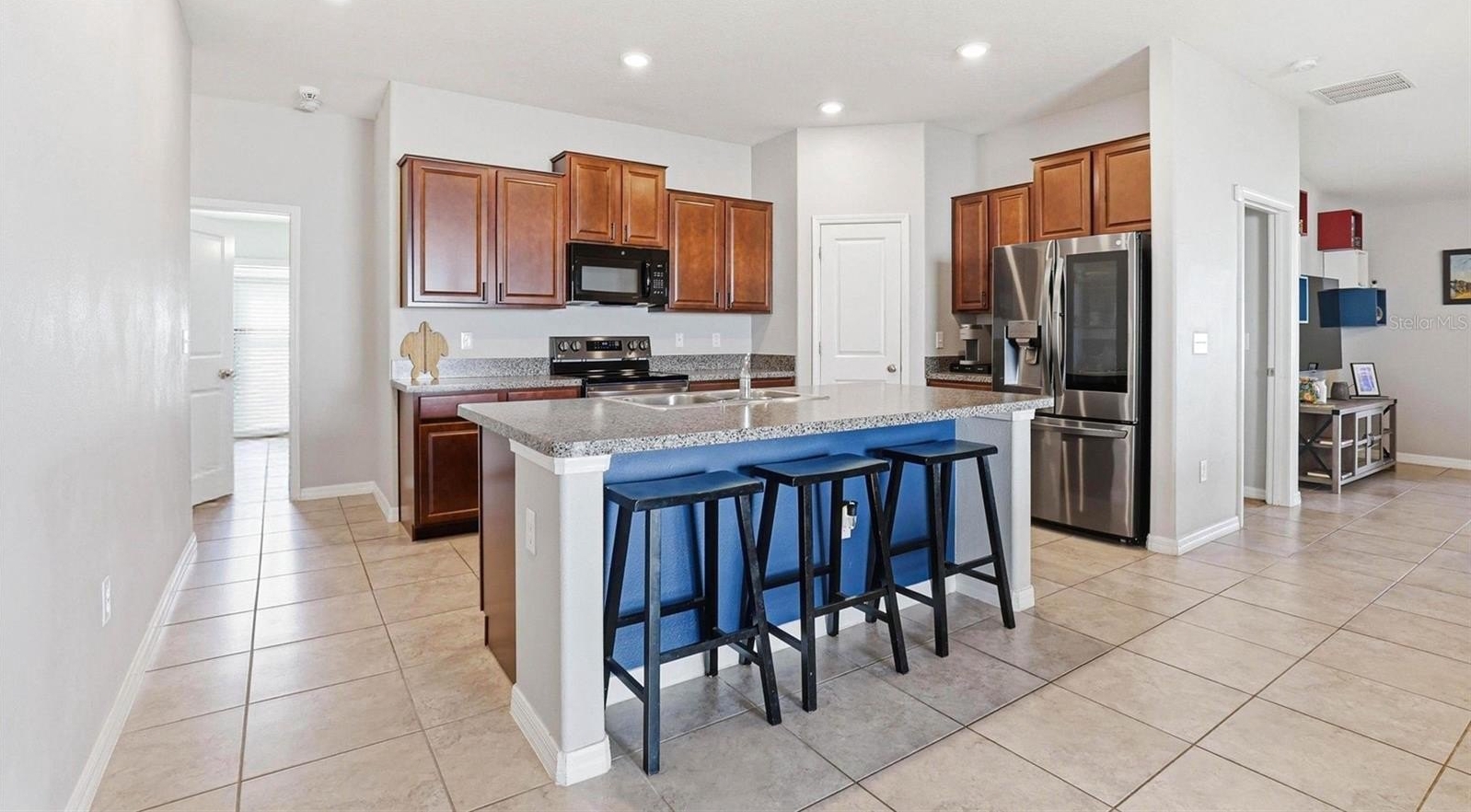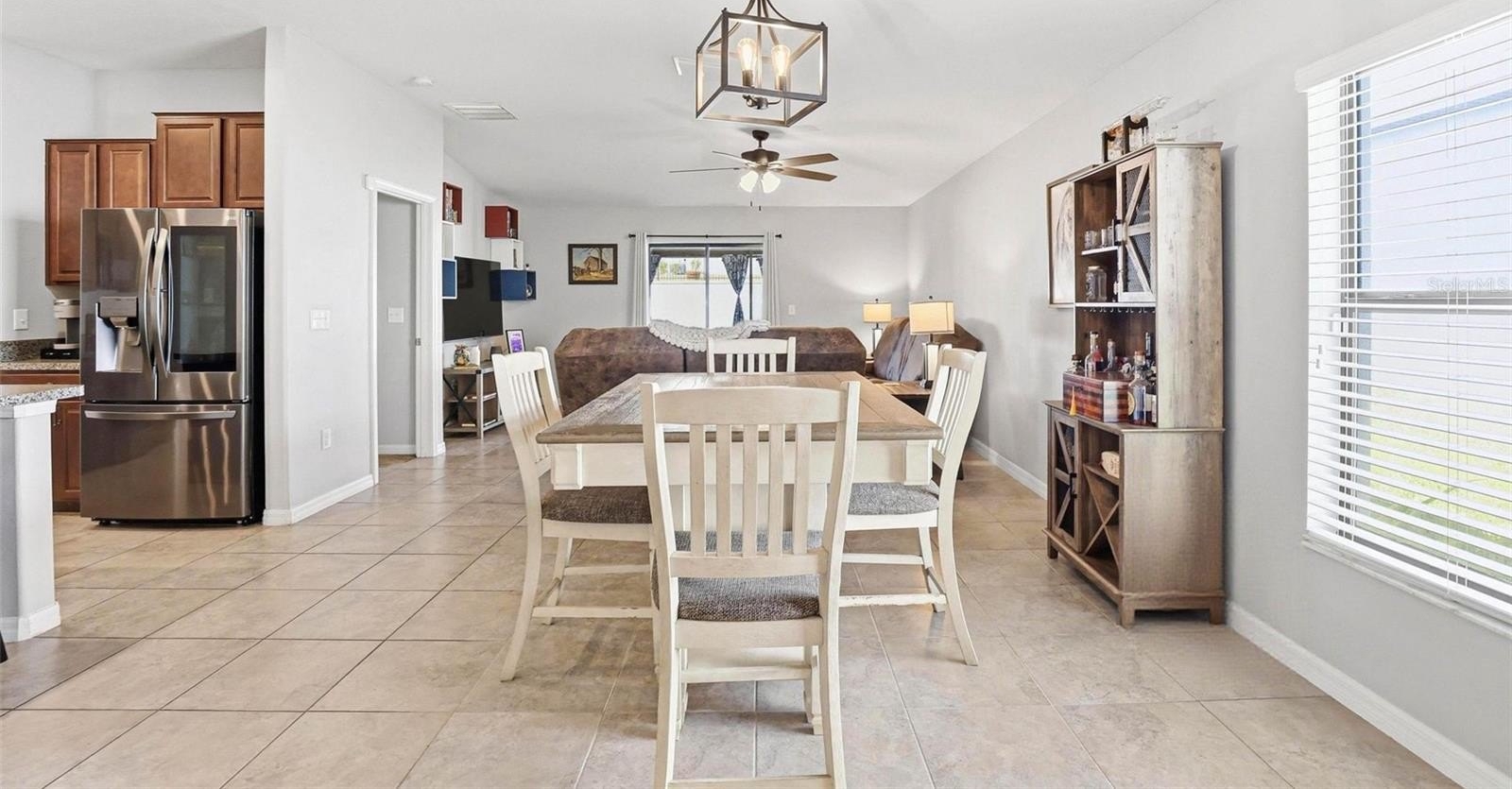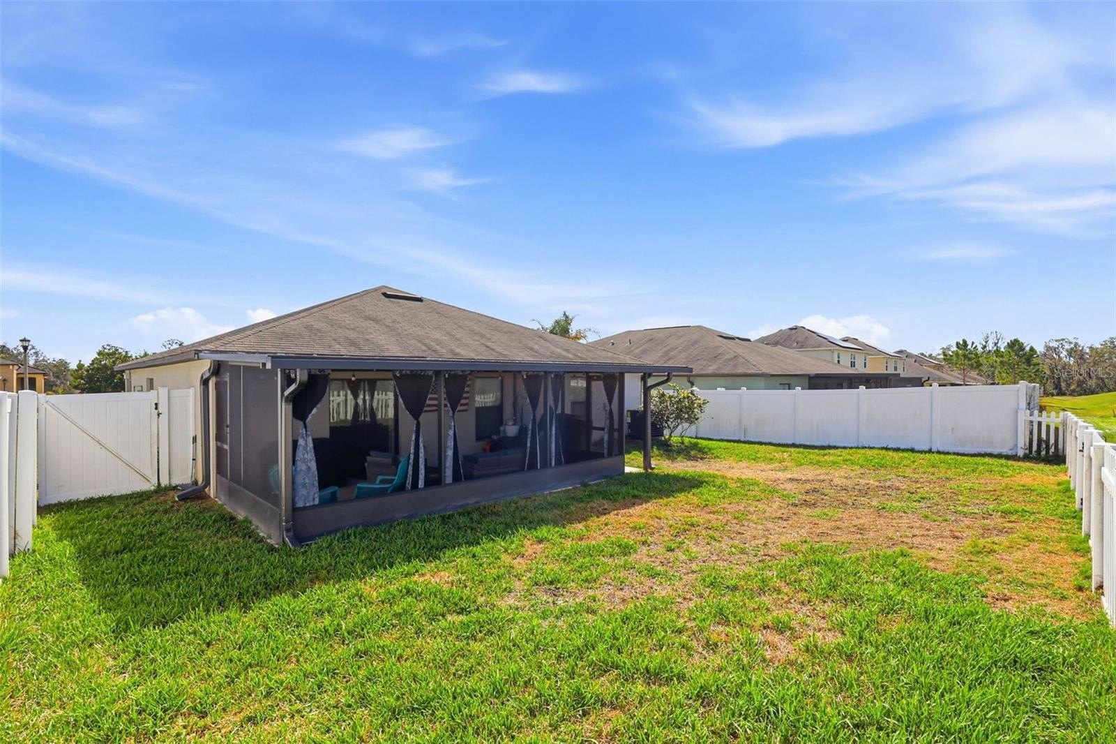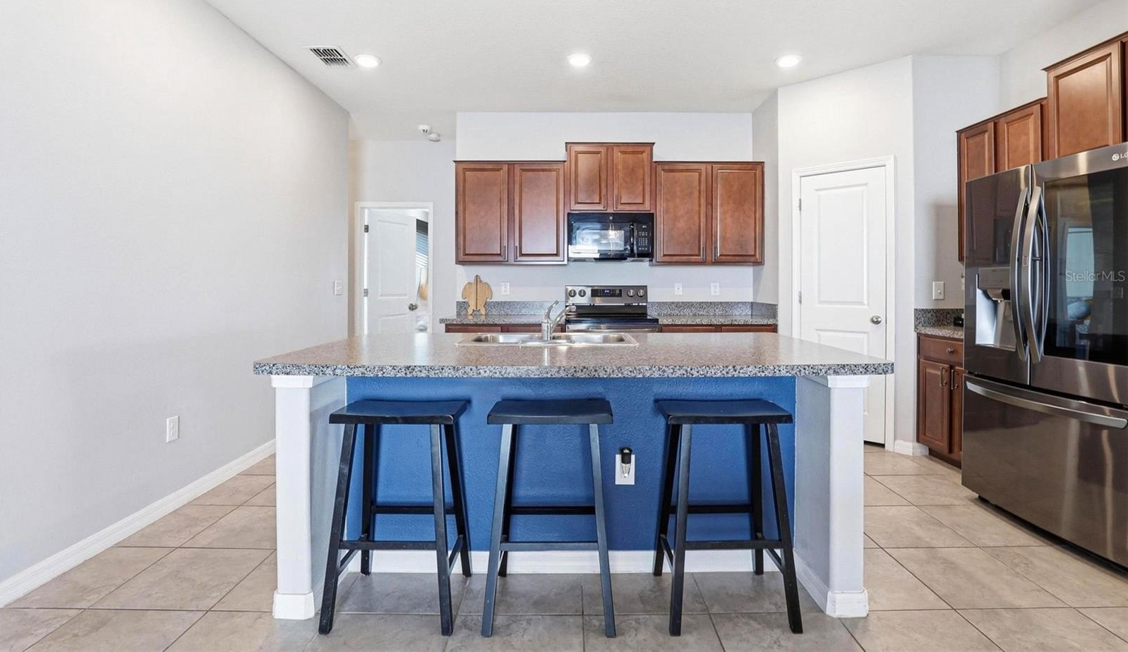 One or more photo(s) has been virtually staged. 6637 Wagon Trail Street, Zephyrhills, FL 33541 — Situated on a quiet cul-de-sac in the desirable Silverado Ranch community, this beautifully maintained Harrisburg model by Lennar offers 4 bedrooms, 2 bathrooms, 1,817 square feet of living space, a 2-car garage, and owned solar panels (2025) designed to help maximize energy efficiency. As you approach the residence, Florida-friendly landscaping, fresh mulch beds, and a six-zone irrigation system create a polished first impression. The driveway leads to a covered entryway accented with solar-powered lighting, setting the tone for the thoughtful details found throughout the home. Step inside to a welcoming foyer filled with natural light and enhanced by an updated lighting fixture. The foyer opens seamlessly into the dining room, where another updated fixture creates an inviting setting for gatherings and everyday meals. Designed with an open-concept layout, the dining area flows effortlessly into the heart of the home, the kitchen. The kitchen is both stylish and functional, featuring recessed lighting, solid wood cabinetry, porcelain tile flooring, stainless steel appliances, and a large center island perfect for meal preparation or casual seating. An eat-in kitchen space provides additional room for everyday dining and entertaining. Just off the kitchen is a conveniently located laundry room equipped with a 2024 washer and dryer and upper shelving for added storage and organization. Adjacent to the laundry room are three spacious secondary bedrooms, each offering expansive closets and flexible space for family, guests, or a home office. A full bathroom serves this wing of the home and includes an updated lighting fixture. On the opposite side of the residence, the living room provides a comfortable space for relaxation and entertaining. Sliding glass doors fill the room with natural light and provide direct access to the outdoor living area. Tucked just off the living room is the expansive primary suite, designed as a private retreat with views of the backyard. The suite features a large walk-in closet complete with a custom closet system and a built-in Liberty Safe. Rated for 1200 degrees for 60 minutes, EMP-resistant elec. lock, weighs 690 lbs empty, and measures 60.5"x42"x27.5". The primary ensuite bath offers recessed lighting, updated fixtures, a dual-sink solid wood vanity, and a glass walk-in shower. Outdoor living continues on the covered and screened rear patio, creating the perfect space to enjoy Florida’s year-round sunshine. The fully fenced backyard with durable PVC fencing offers plenty of room for outdoor activities, gardening, pets, or future enhancements. Notable features and updates include: Roof (2018), HVAC (4 ton) (2024) with updated ductwork and infrared lighting installed, Water Heater (2018), Refrigerator (2024), Range (2024), Dishwasher (2024), Disposal (2018), Microwave (2018), Updated ceiling fans, Vivint Security System, app-controlled garage door system, and owned solar panels (2025). Residents of Silverado Ranch enjoy low quarterly HOA fees of $223, which include basic internet and cable, along with access to community amenities such as a pool, playground, dog park, and scenic walking trails. Conveniently located with quick access to I-75, this home is just minutes from Downtown Zephyrhills and Downtown Dade City, multiple fitness centers, and approximately 20 minutes from premier shopping and dining at The Shops at Wiregrass and Tampa Premium Outlets.