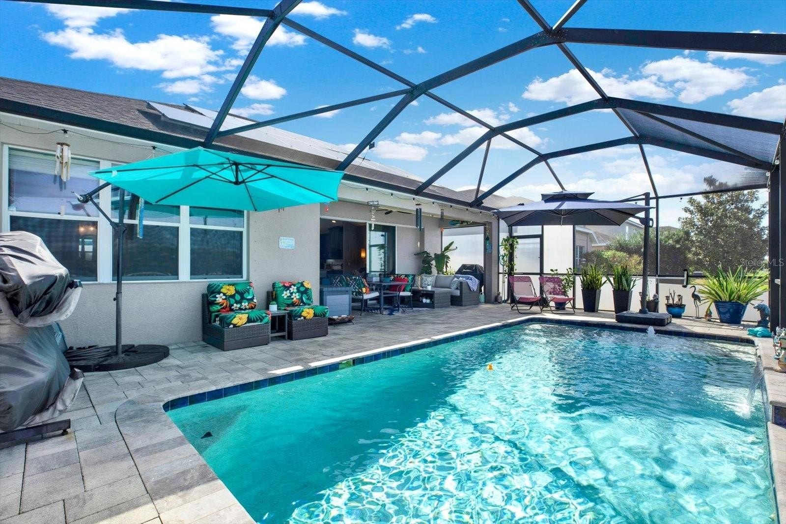 Step outside to your private backyard oasis with a pool overlooking a peaceful pond, where you can unwind and enjoy stunning Florida sunsets. The outdoor space also features a newly screened lanai, new pool equipment, fresh landscaping, and a new vinyl fence for added privacy. Additional highlights include a 2-car garage and solar panels that help keep energy costs low. A move-in-ready home with modern updates, natural light, and serene water views—perfect for easy Florida living.