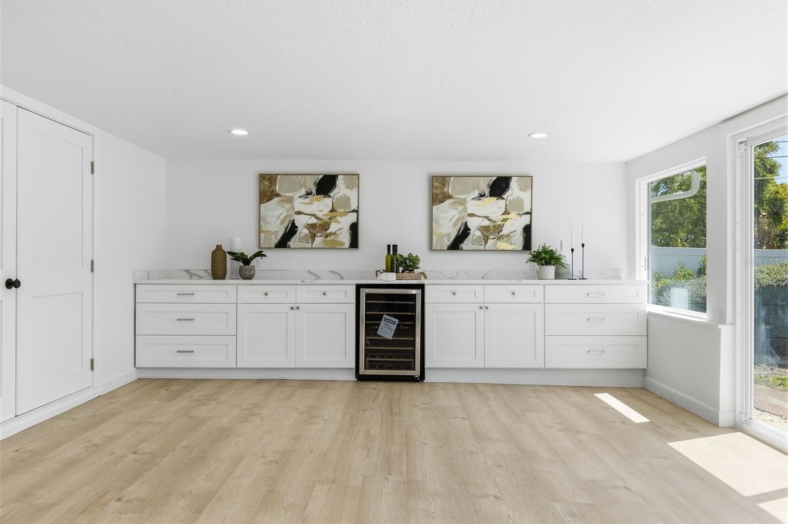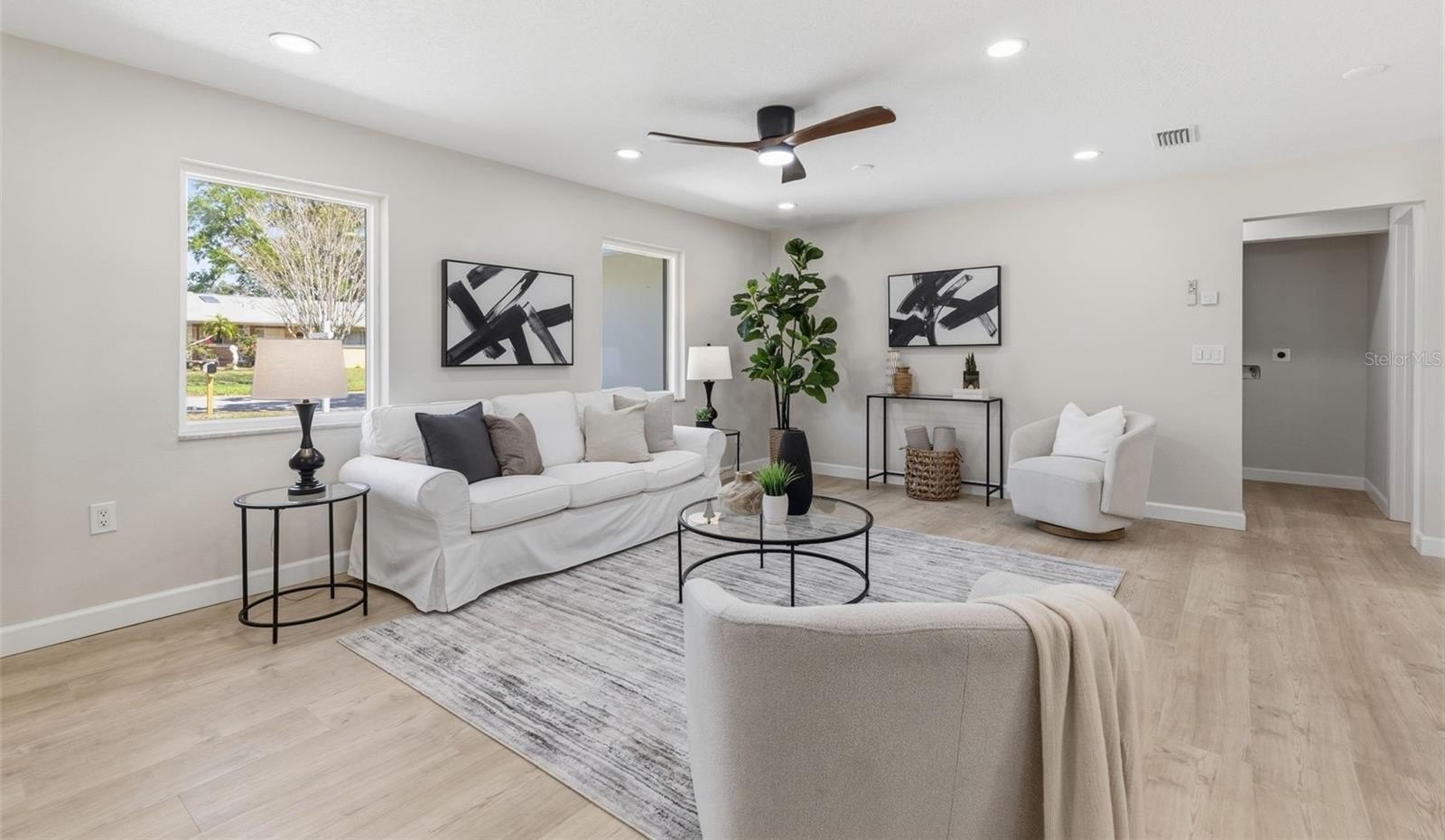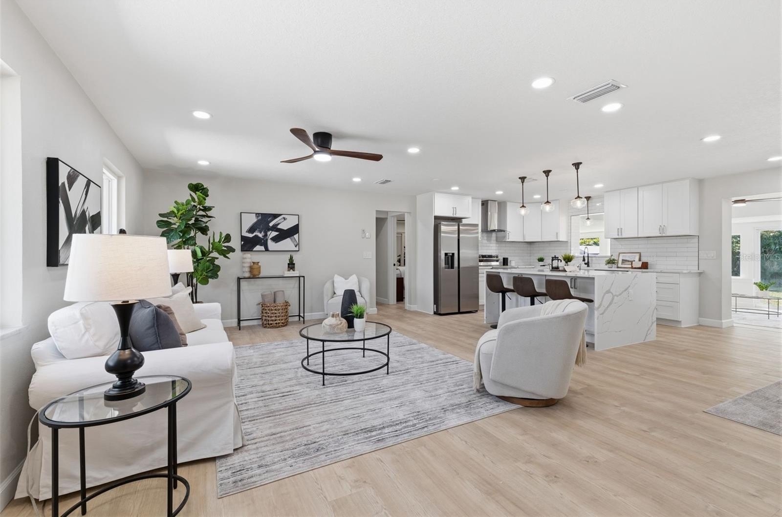 Welcome to this beautifully redone 4-bedroom, 2-bath home in the heart of coveted Morningside Meadows—one of the best neighborhoods Clearwater has to offer. As you enter, you're greeted by a true open-concept layout, creating the perfect space for entertaining or for a growing family. The kitchen has been thoughtfully updated with new stainless steel appliances, a classic subway tile backsplash, custom cabinetry, quartz countertops, and a stunning waterfall quartz island that serves as the centerpiece for gathering and entertaining. Every detail has been carefully redesigned to maximize both style and functionality. The primary bathroom is elegantly finished with tile extending to the ceilings and a luxurious three-way shower system featuring a rainfall option. Both bathrooms feature brushed nickel fixtures, custom cabinetry, quartz countertops, and large vanity mirrors. The second bathroom also offers a large soaking tub, creating a relaxing retreat. The back sunroom serves as an inviting communal space, complete with custom cabinetry and quartz surfaces that seamlessly match the kitchen and bathrooms, tying the home’s design together beautifully. Double sliding doors and abundant windows flood the space with natural light while providing views of the expansive backyard and a cozy fireplace. Enjoy relaxing in the primary bedroom with French doors open to a peaceful view of your backyard retreat. The home also features a freshly re-epoxied two-car garage for a clean, durable finish. Stylishly updated front and back landscaping complete this exceptional property. No stone has been left unturned with the updates throughout the home, including luxury vinyl plank flooring (2026), new recessed lighting throughout (2026), an updated electrical panel (2020), a brand new roof (2026), new hurricane-grade windows (2026), central heating and air (2023), and fully renovated kitchens and bathrooms (2026). Option to add a pool to backyard is available please ask for details