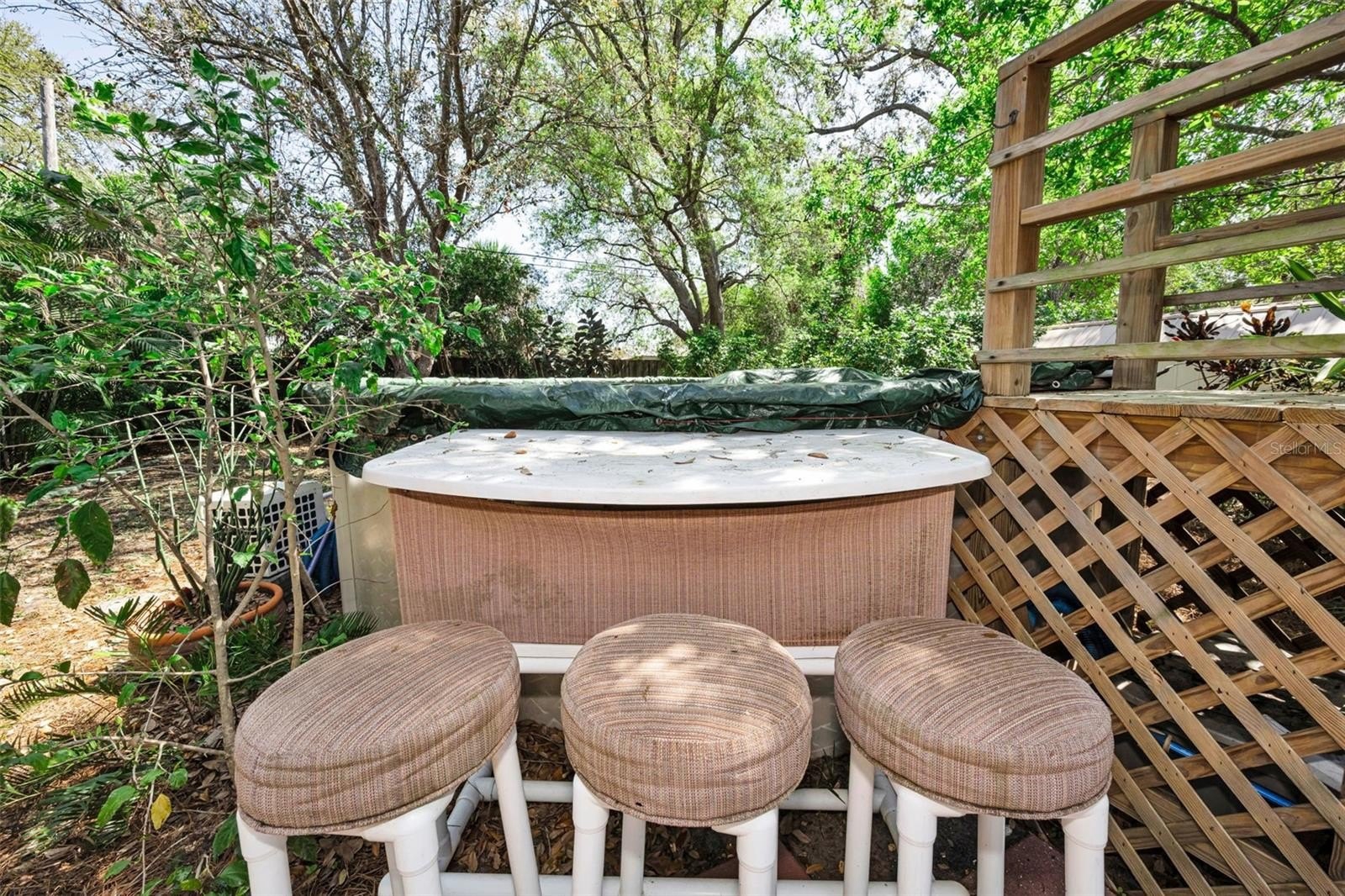 Enjoy multiple outdoor spaces including a covered and screened lanai perfect for relaxing year-round, a large patio and garden paths surrounded by tropical greenery, a detached storage shed (with electric!) for tools and equipment, and a unique above-ground pool with bar area ideal for entertaining and enjoying Florida’s sunshine.