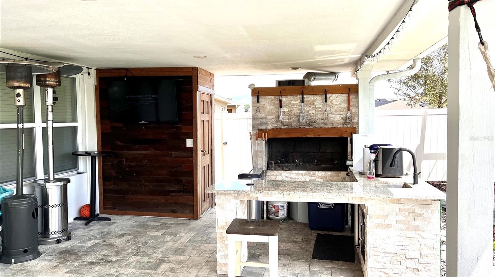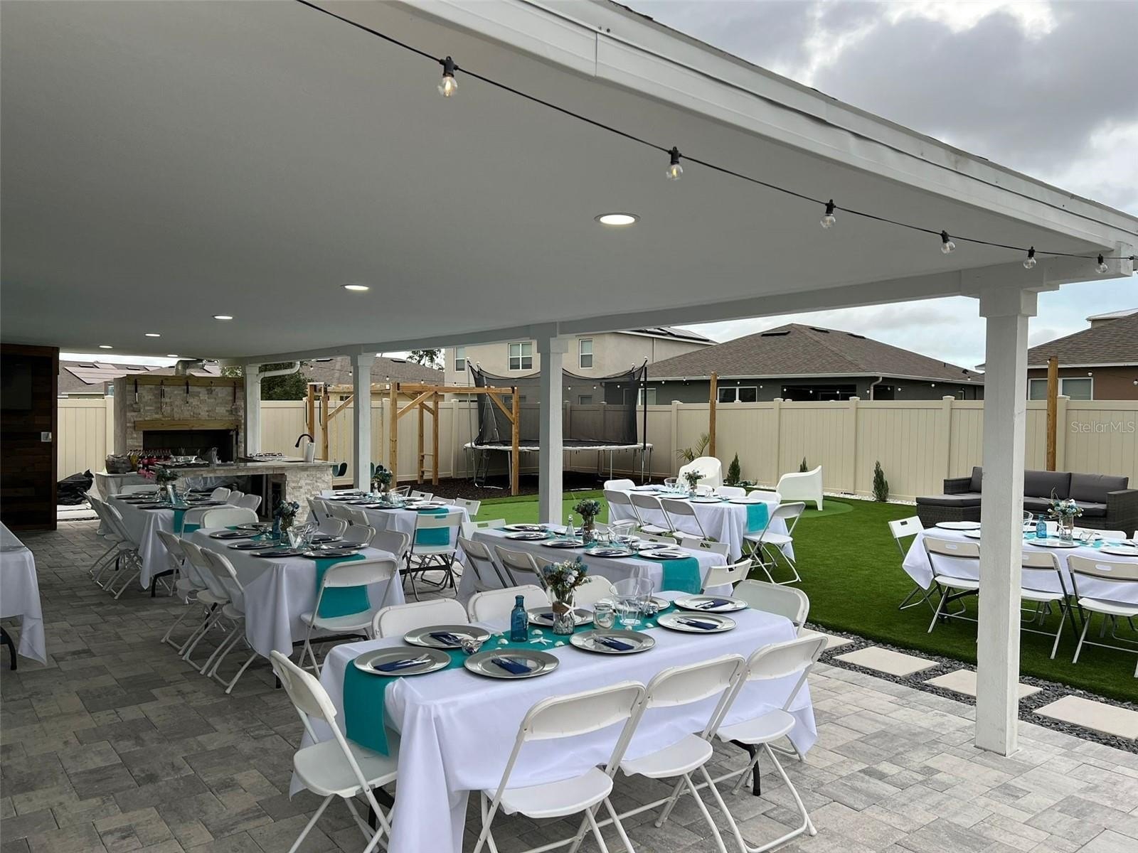 Step outside to enjoy the extended lanai designed for gatherings and outdoor living, featuring an outdoor kitchen with grill, half bathroom, and plenty of space for entertaining. The backyard includes artificial turf and a recreation area, creating an attractive and low-maintenance outdoor environment.