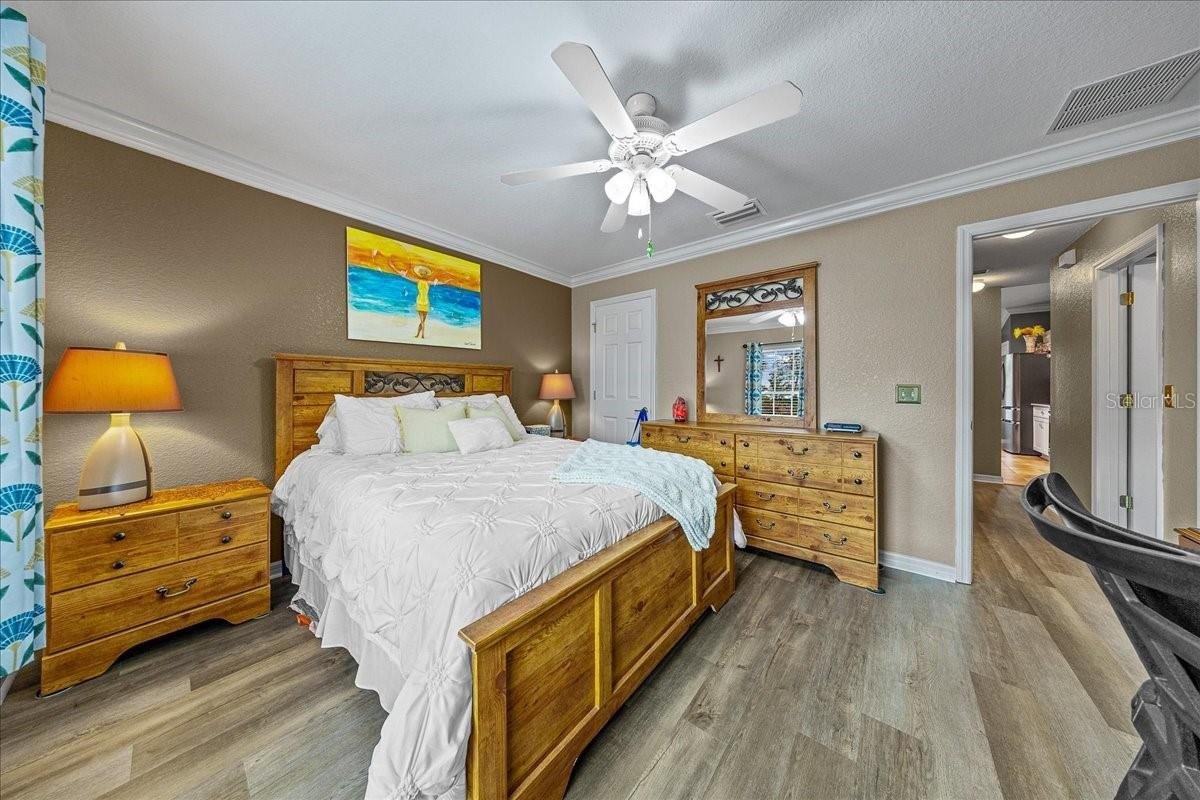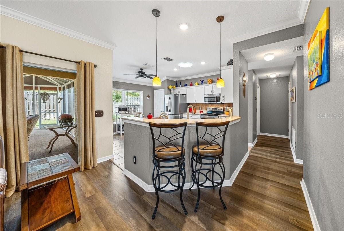 Located in Spruce Creek Golf & Country Club, this beautifully updated home offers modern style and peace of mind. Recent upgrades include luxury vinyl plank flooring with a moisture barrier (2025), the primary powder room features 2025 Onyx shower walls for a modern, spa-like feel, and a 2024 garage door with a warranty-backed motor and belt system. Comfort and efficiency shine with a 2023 mini split (12-yr warranty) in the primary suite and a 2023 Ecobee thermostat with sensor (3-yr warranty). Enjoy entertaining on the oversized lanai featuring a 2022 birdcage cover (limited 10-yr warranty) and a newer ceiling fan, while the river rock floor was pressure-washed and resealed in 2021 for lasting appeal.