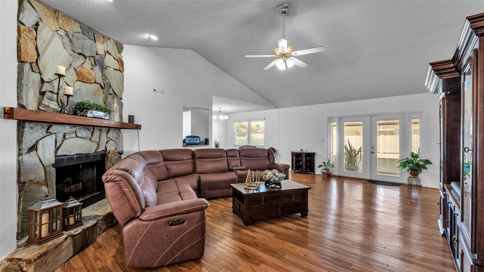Inside, you'll find beautiful wood flooring in the Great Room and dining area, with luxury vinyl plank flooring in two bedrooms for easy care and durability. The Great Room features vaulted ceilings, a wood-burning fireplace, and French doors with built-in blinds that open to the screened porch and paver patio—perfect for relaxing or entertaining.