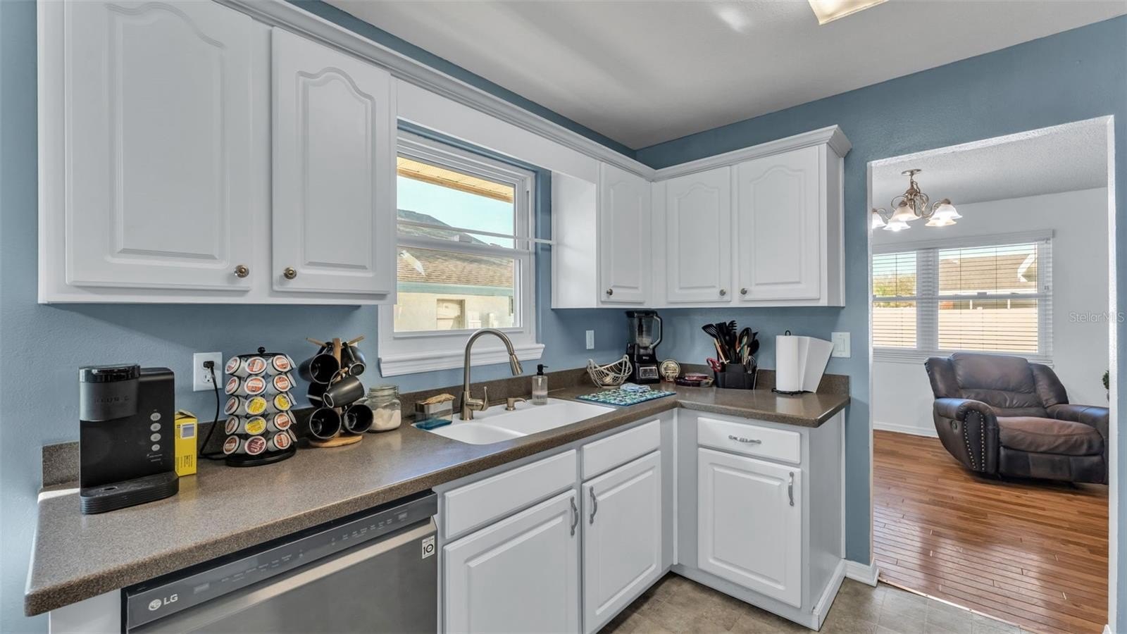 The eat-in kitchen offers Corian countertops, a walk-in pantry, and newer charcoal-colored stainless-steel appliances, including a refrigerator that is only three years old. A convenient pass-through connects the kitchen to the Great Room, while the adjacent Dining Room opens to the spacious Great Room, creating a natural flow for gatherings.