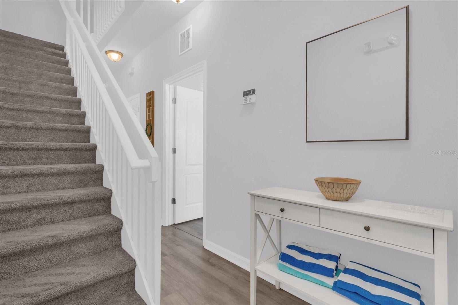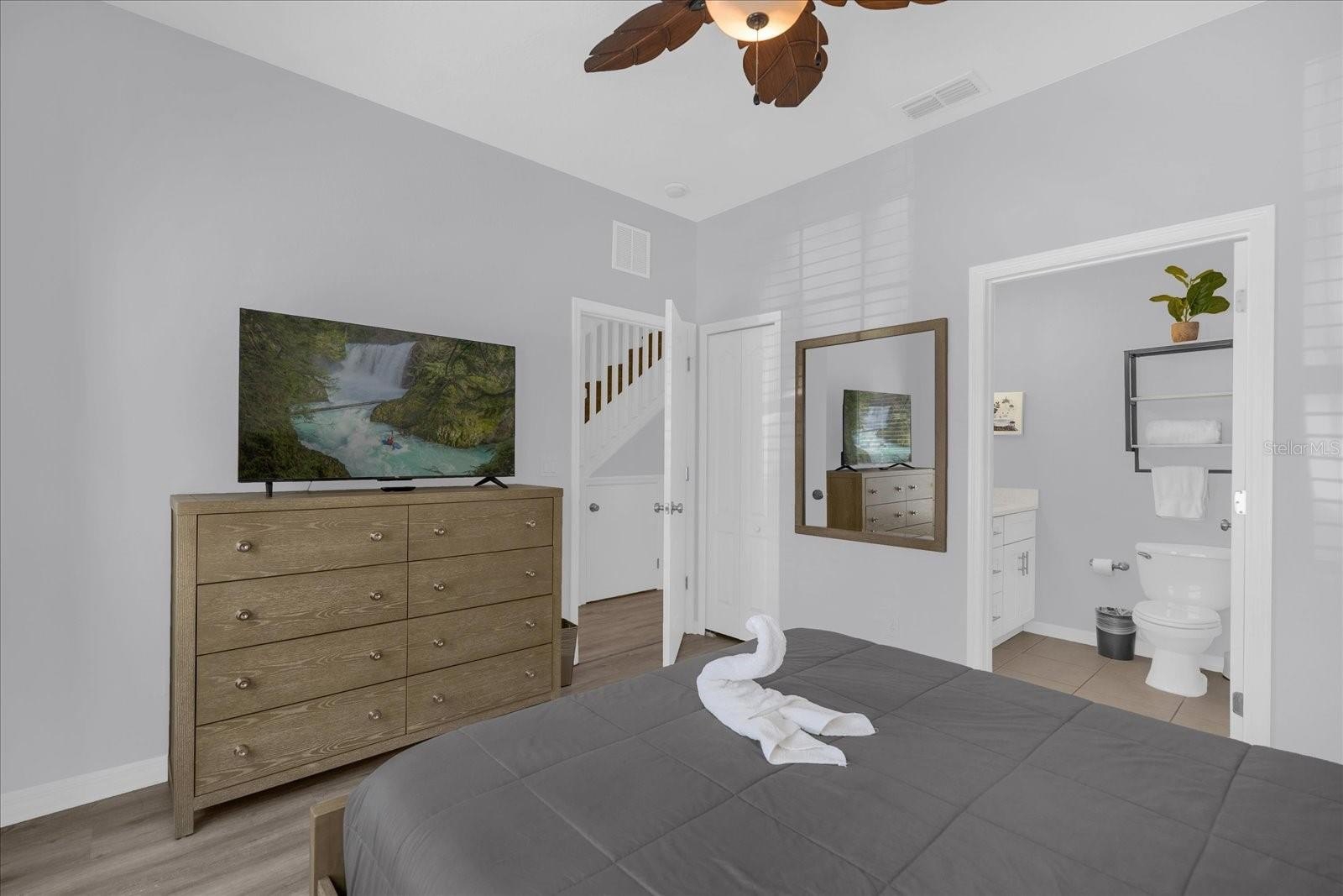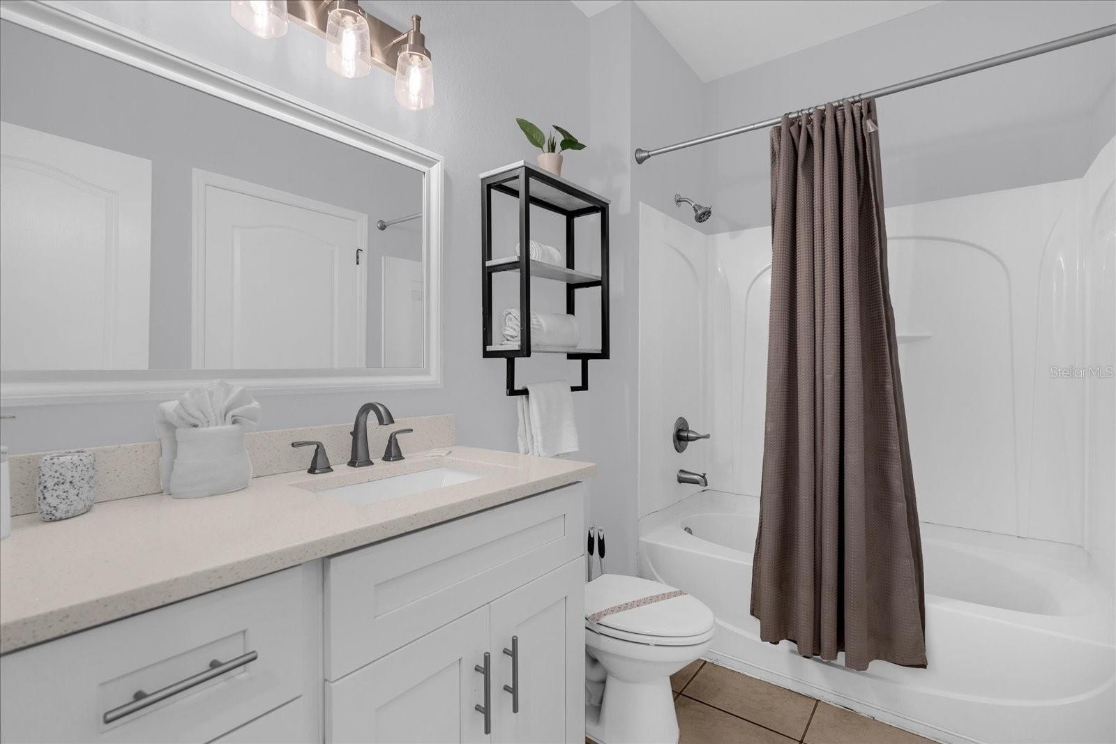 Turnkey townhome in the gated Coral Cay Resort community just minutes from Orlando’s major attractions, offering flexibility as a primary residence, second home, or short-term vacation rental investment including AirB&B. This move-in ready property features a bright open-concept layout with durable luxury vinyl plank flooring throughout the first floor. The renovated kitchen showcases quartz countertops, stainless steel appliances, soft-close cabinetry, a double sink, and a breakfast bar that flows seamlessly into the main living area, creating a comfortable space for everyday living and entertaining. Sliding doors lead to a screened impact patio overlooking the pond and amenity center, providing a relaxing indoor-outdoor living space with direct access to community amenities. The first floor also includes a private bedroom with en-suite bathroom featuring quartz counters, dual sinks, and a tub/shower combination, along with a convenient powder bath and stackable laundry area. Upstairs offers two additional bedrooms with pond and amenity center views. The larger bedroom includes a spacious closet, ceiling fan, and en-suite bath with quartz counters and a tub/shower combination that also provides hallway access. Coral Cay Resort offers a wide range of amenities including a clubhouse with movie theater, fitness center, game room with pool table, and kitchen, along with a heated community pool, spa, kiddie pool, playgrounds, sand volleyball court, picnic areas with grills, and a scenic walking trail with exercise stations surrounding a lake with a lighted fountain. Additional highlights include a paver driveway and close proximity to the resort-style amenity center.