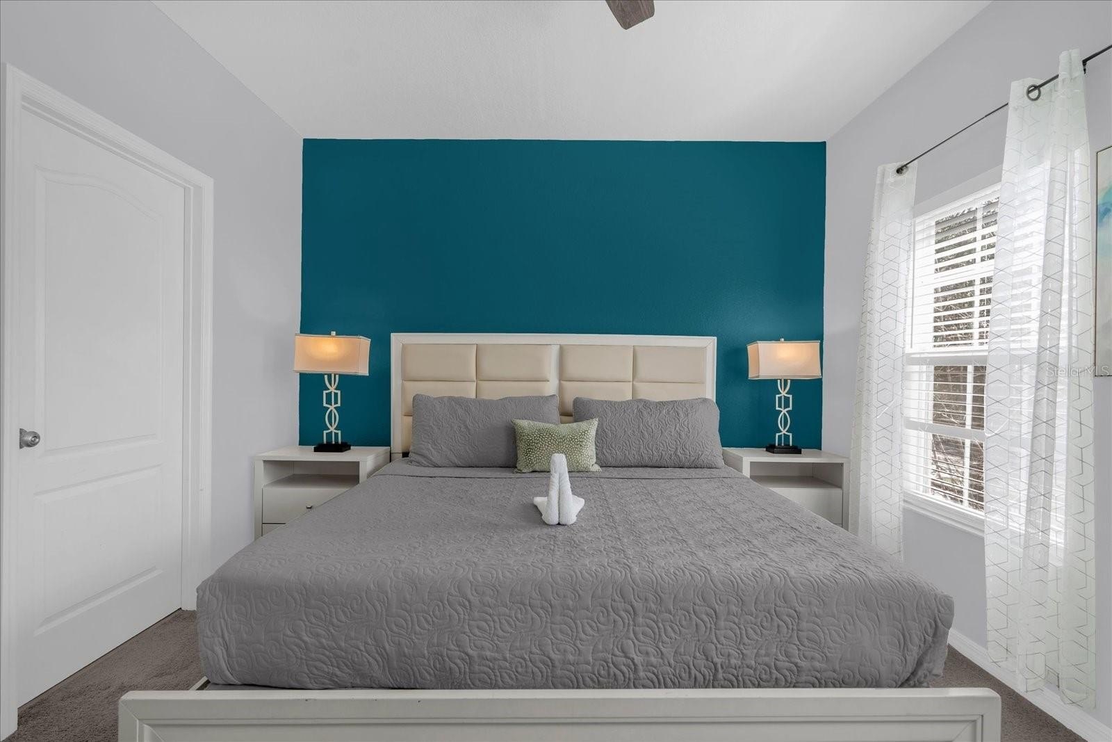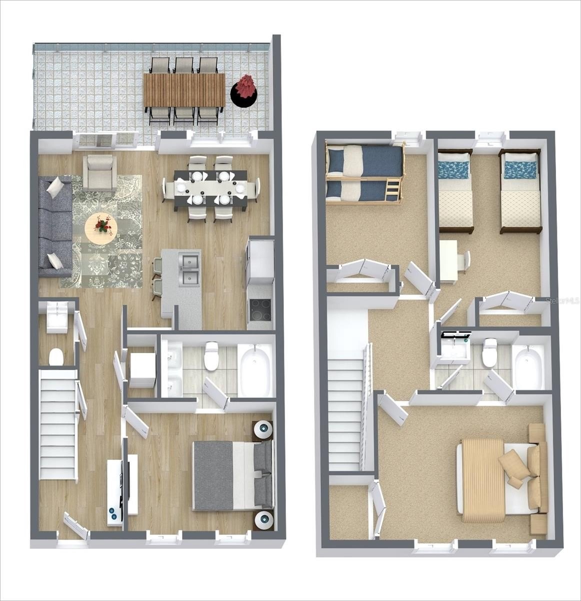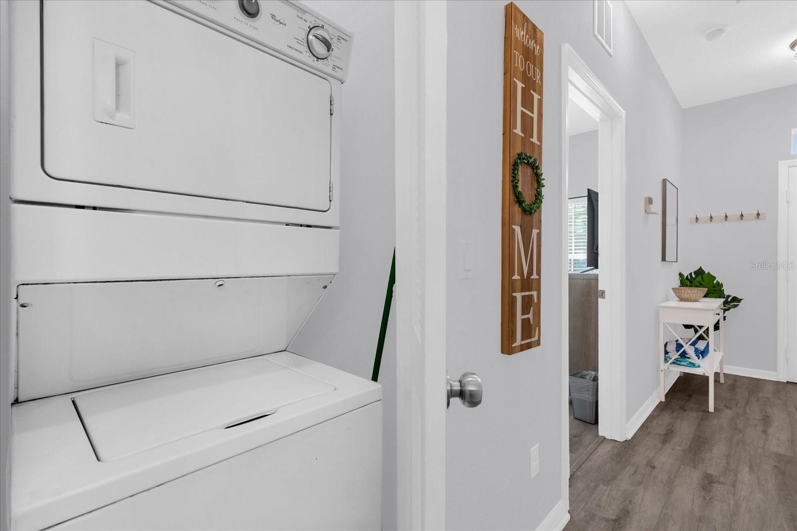 Turnkey townhome in the gated Coral Cay Resort community just minutes from Orlando’s major attractions, offering flexibility as a primary residence, second home, or short-term vacation rental investment including AirB&B. This move-in ready property features a bright open-concept layout with durable luxury vinyl plank flooring throughout the first floor. The renovated kitchen showcases quartz countertops, stainless steel appliances, soft-close cabinetry, a double sink, and a breakfast bar that flows seamlessly into the main living area, creating a comfortable space for everyday living and entertaining. Sliding doors lead to a screened impact patio overlooking the pond and amenity center, providing a relaxing indoor-outdoor living space with direct access to community amenities. The first floor also includes a private bedroom with en-suite bathroom featuring quartz counters, dual sinks, and a tub/shower combination, along with a convenient powder bath and stackable laundry area. Upstairs offers two additional bedrooms with pond and amenity center views. The larger bedroom includes a spacious closet, ceiling fan, and en-suite bath with quartz counters and a tub/shower combination that also provides hallway access. Coral Cay Resort offers a wide range of amenities including a clubhouse with movie theater, fitness center, game room with pool table, and kitchen, along with a heated community pool, spa, kiddie pool, playgrounds, sand volleyball court, picnic areas with grills, and a scenic walking trail with exercise stations surrounding a lake with a lighted fountain. Additional highlights include a paver driveway and close proximity to the resort-style amenity center.