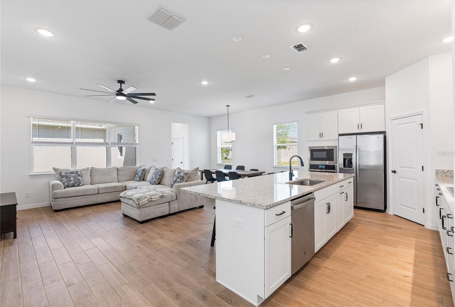 Don't let this like new water front home pass you by. Ready to move into, so no waiting or dealing with extra paperwork. This 4 bedroom, 3 1/2 bath with a bonus room, will give you and your family plenty of room to spread out and grow. This home is situated not only on the water, but is also the end unit on the bike path with benches and inviting landscaping all around the property in common areas. It is just a short walk around the lake, to the pool and amenities. The home is a very well appointed K Hovnanian Tessa model home, with a wide open floor plan. As you walk into on the first floor, through the front door, the natural light will impress you and you will love the tile flooring. The first room you'll see is a full suite, with it's own bathroom. Walking into the the kitchen the massive island counter top will blow you away! The entire area has recessed lighting with a gorgeous ceiling fan over the main area. There's enough room for the entire family to sit and chat as the days meals are being prepared in the chef's kitchen. The kitchen overlooks the great/family room so that even while you're in the kitchen, you're never far from the action. The oversized laundry room with a utility sink, is located just off the family room and at the entrance to the oversized garage with custom storage. Outside, you'll have a fully fenced back yard so your four legged friends can run freely, and you can entertain your friends and family at the grill. Heading upstairs, you will enter into the huge bonus room/play room/