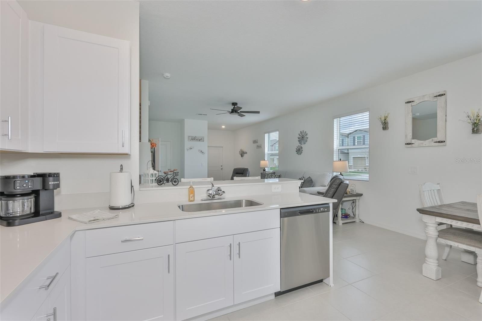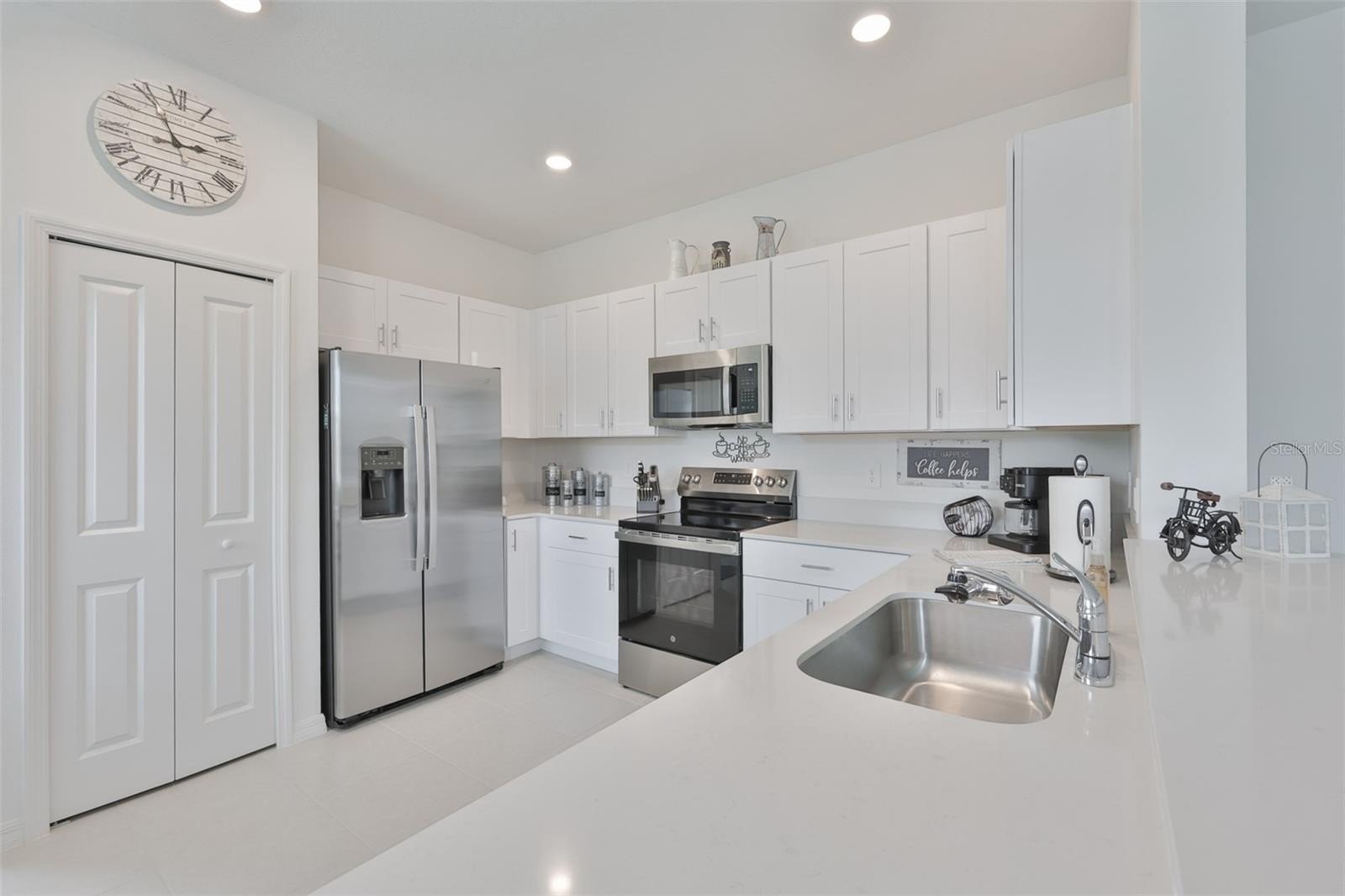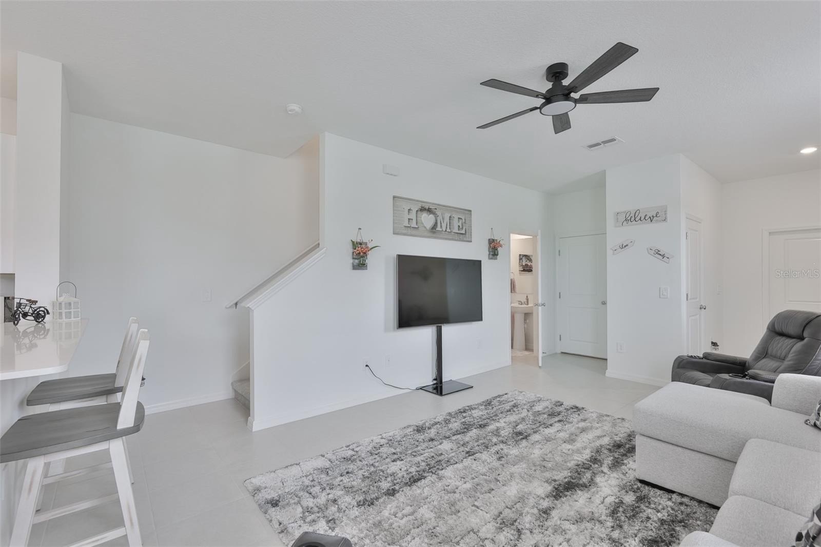 The contemporary kitchen is designed for both style and function, featuring brand-new 2025 stainless steel appliances, quartz countertops, beautiful cabinetry with decorative hardware, a large single-basin sink, spacious pantry, and bar seating for three—ideal for casual dining or entertaining. A convenient half bath on the main floor is perfect for guests, while the attached one-car garage adds everyday practicality.