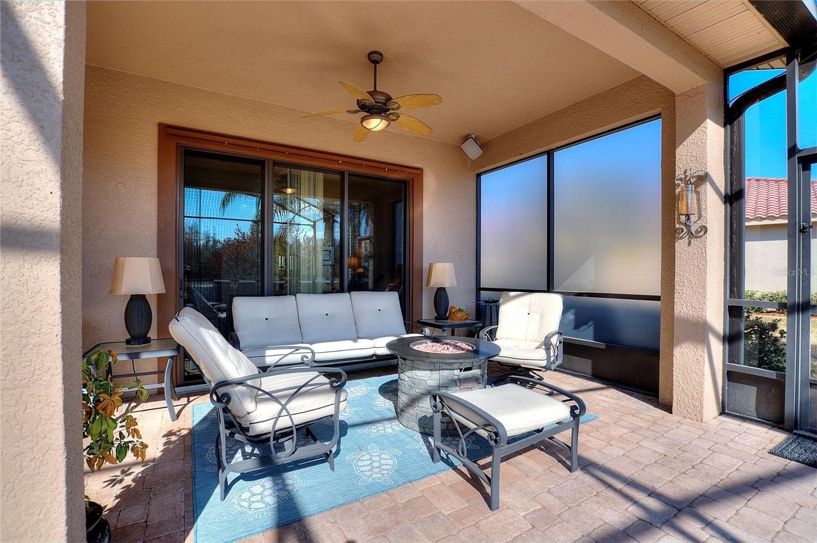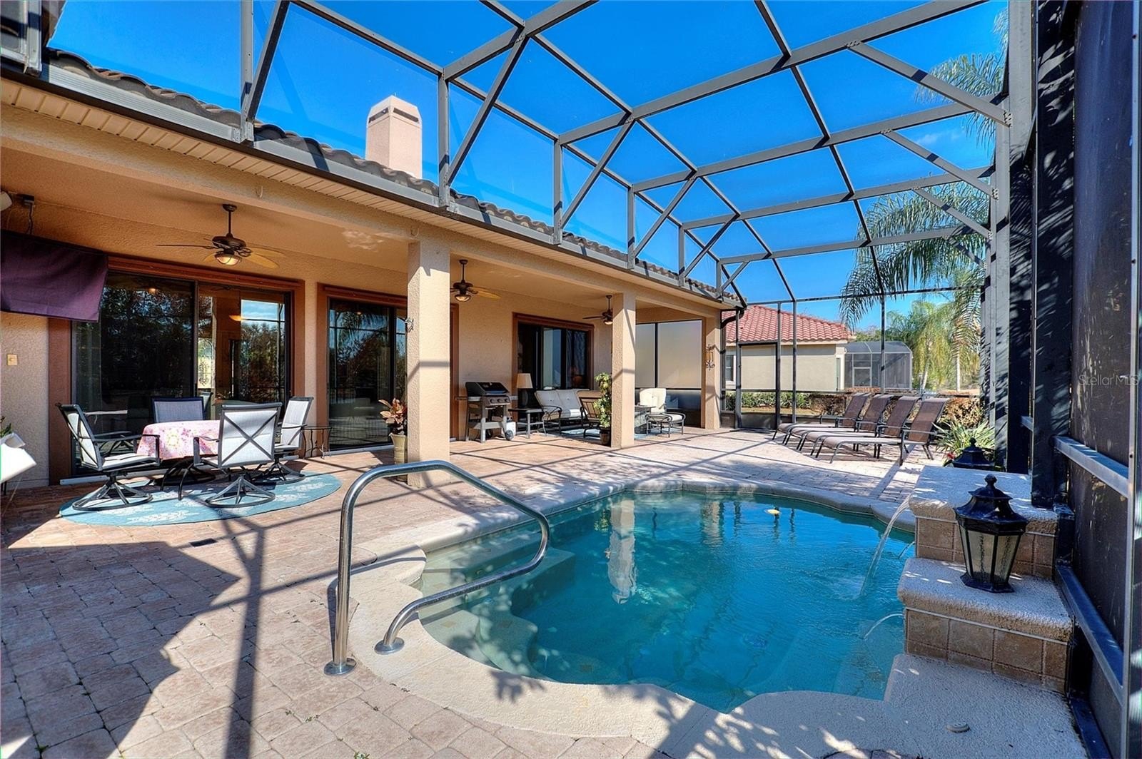 Welcome to your new Solivita home, a 3,088 Square Foot Riviera Model that is part of the Coral Gables Estates Collection. This 3 Bedroom, 3 1/2 Bath home is nestled in the desirable PORTOFINO neighborhood known for it's estate homes and large lots. As you approach the entrance you enter through the gate into a LARGE COURTYARD and immediately notice the FRENCH DOOR entry with IMPRESSIVE LEADED GLASS DOORS. Upon entering the home you pleased to see a large Great Room with adjoining Kitchen and Dining Room, an OPEN FLOOR PLAN ideal for entertaining. You will also notice the timeless PREMIUM TEXTURED PORCELAIN TILE, with its neutral color and durability, running throughout the living area of the home. Turning to your left you will see a floor to ceiling CUSTOM WOOD ENTERTAINMENT CENTER with bookshelves and WOOD BURNING FIREPLACE. You will no longer need fireplace videos during the holidays since you will now have the real thing! Outside the double set of sliders you will notice the Large Lanai with an attractive SPOOL, FEATURING A WATERFALL. Perfect for relaxing and cooling off while also enjoying the lower cost of a smaller pool. As you turn toward the right you find a large, Highly Functional Kitchen that is ideal for the chef in the family and for impromptu gatherings of your guests. BRAND NEW FRIGIDAIRE GALLERY DOUBLE WALL OVENS are ideal for preparing and timing large meals. The PANORAMIC CORNER WINDOW at the sink make will you feel like you are part of the outside scenery. The Large Center Island is ideal for breakfast or a quick snack, as well as an ideal place for serving food at social get togethers. The dining room is spectacular with a triple tray ceiling and modern lighting. The roomy Owner's Suite features french doors, a tray ceiling and an En Suite Bathroom. The very large bathroom has Dual Vanities/Sinks, a makeup area and features a Large Glass Block Shower that turns showering into an experience. At the other end of the bathroom you enter the Retreat Room which is a very private space. It is equipped with Dual Single Murphy Beds, ideal for the the younger visitors. This home has lots of UPGRADES: a 4' retreat extension, the entry courtyard, rounded corners, tray ceilings, DOUBLE CROWN MOULDING, CENTRAL VACUUM, Premium Porcelain Tile, Wood Fireplace, Built in Entertainment Center/Bookshelves, Leaded Glass Entry Doors, Hurricane Shutters and more. The HVAC was REPLACED in 2019, The Spool Heater in 2026, The Double Ovens in 2025. The Dryer is 2 years old. FURNISHINGS ARE INCLUDED! Arrange YOUR PRIVATE SHOWING of this outstanding home within Solivita’s dynamic 55+ community today! *PLEASE SEE THE MATTERPORT 3D VIRTUAL TOUR* With amenities such as 14 pools, 2 championship 18-hole golf courses, tennis, pickle-ball, basketball, softball, and over 240 clubs, plus spa services and two state-of-the-art exercise facilities spread across 4,200 acres of conservation, you'll have everything you need at your fingertips. Enjoy additional perks such as landscaping, irrigation, high-speed fiber internet, and TV included in the HOA. For your convenience, HCA Florida Poinciana Hospital is directly across the street along with a 42,000 square-foot medical office building. Also recently opened across the street is a new 215,000 square foot shopping Plaza featuring a Sprouts Farmers Market, multiple shopping options, and several restaurants. Please do not hesitate to come see this gorgeous home and perhaps make it YOUR new Solivita home!