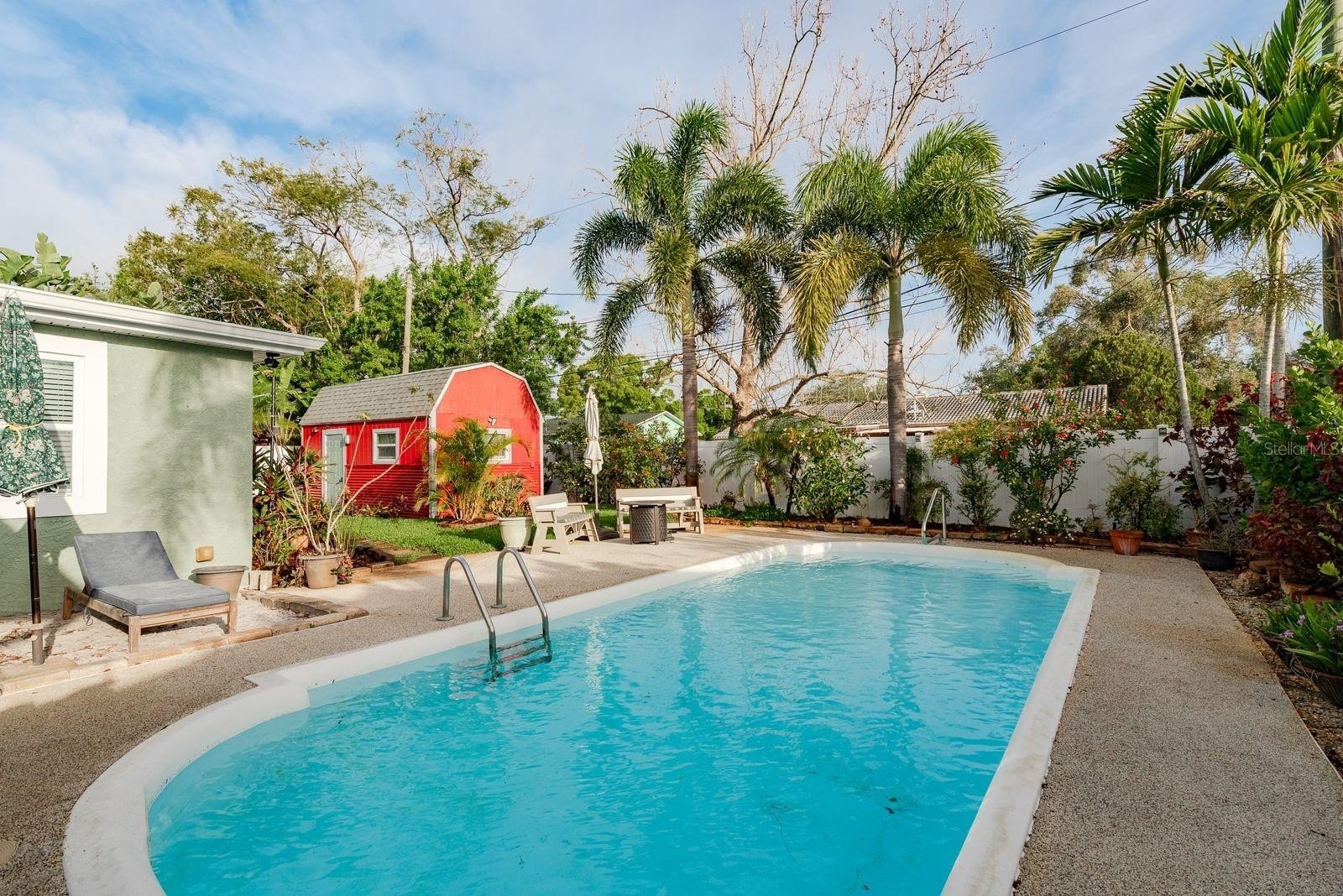Step outside to enjoy a relaxing patio overlooking the lushly landscaped backyard. The open pool area features composite rubber decking and is surrounded by vibrant flowers, shrubs, and classic Florida plantings. The pool equipment was recently updated with a new pump and control box (2024), and the irrigation pump and control system were replaced in 2025. A large detached storage building with electricity offers excellent potential as a workshop, home gym, or additional storage.