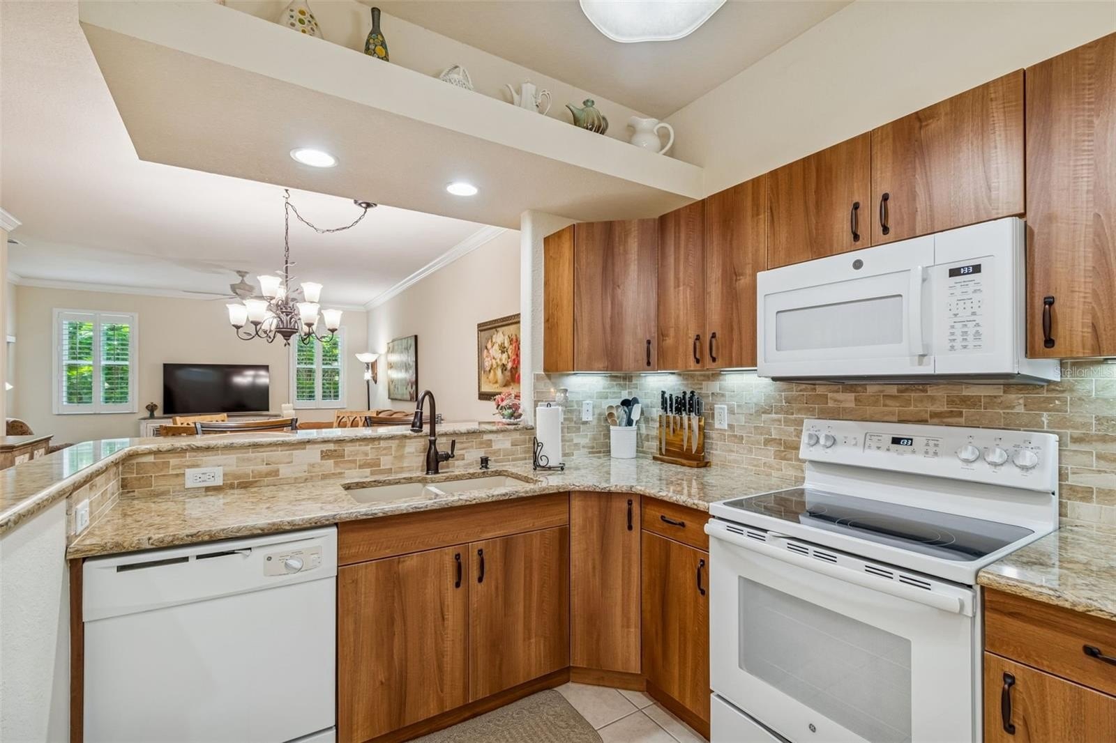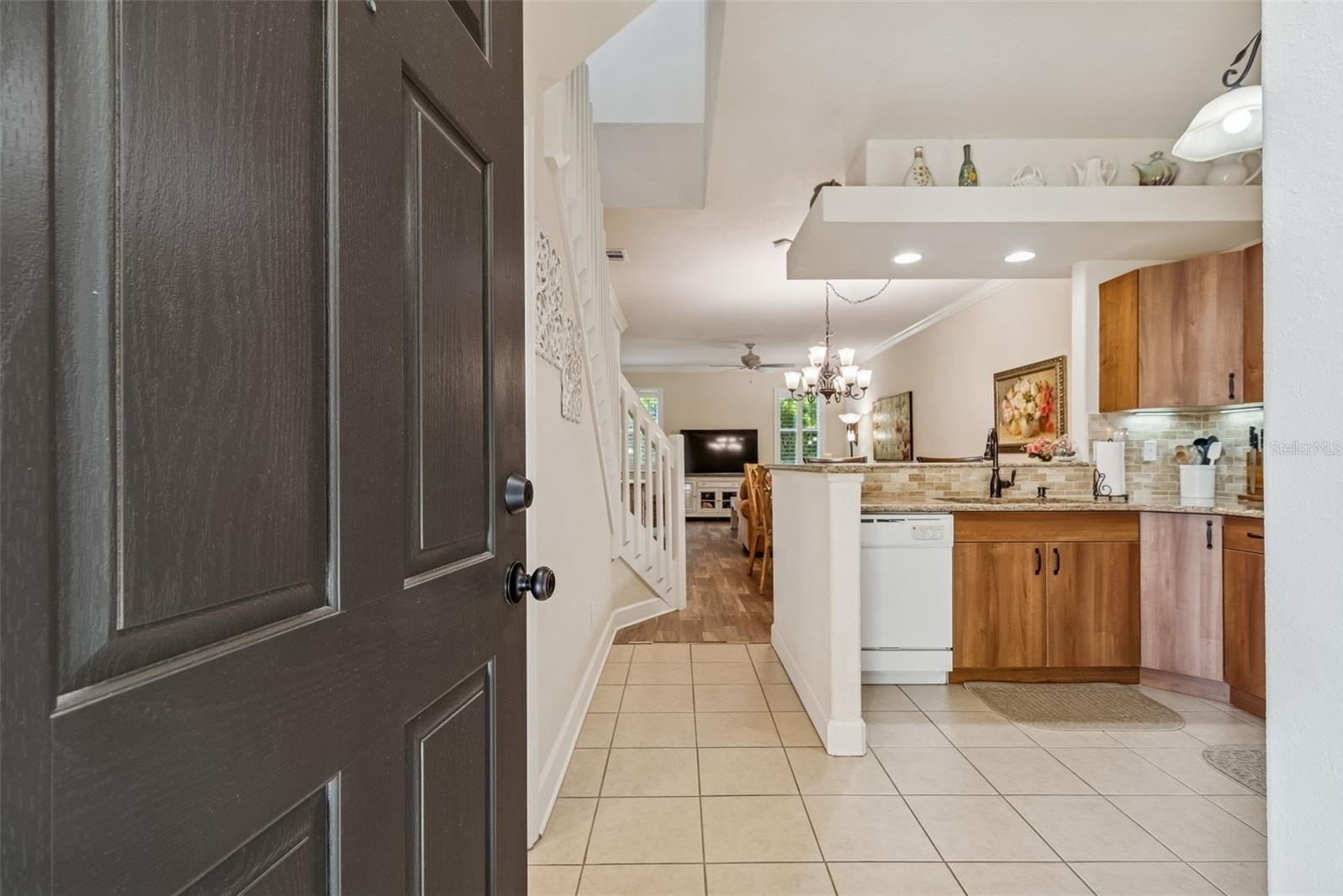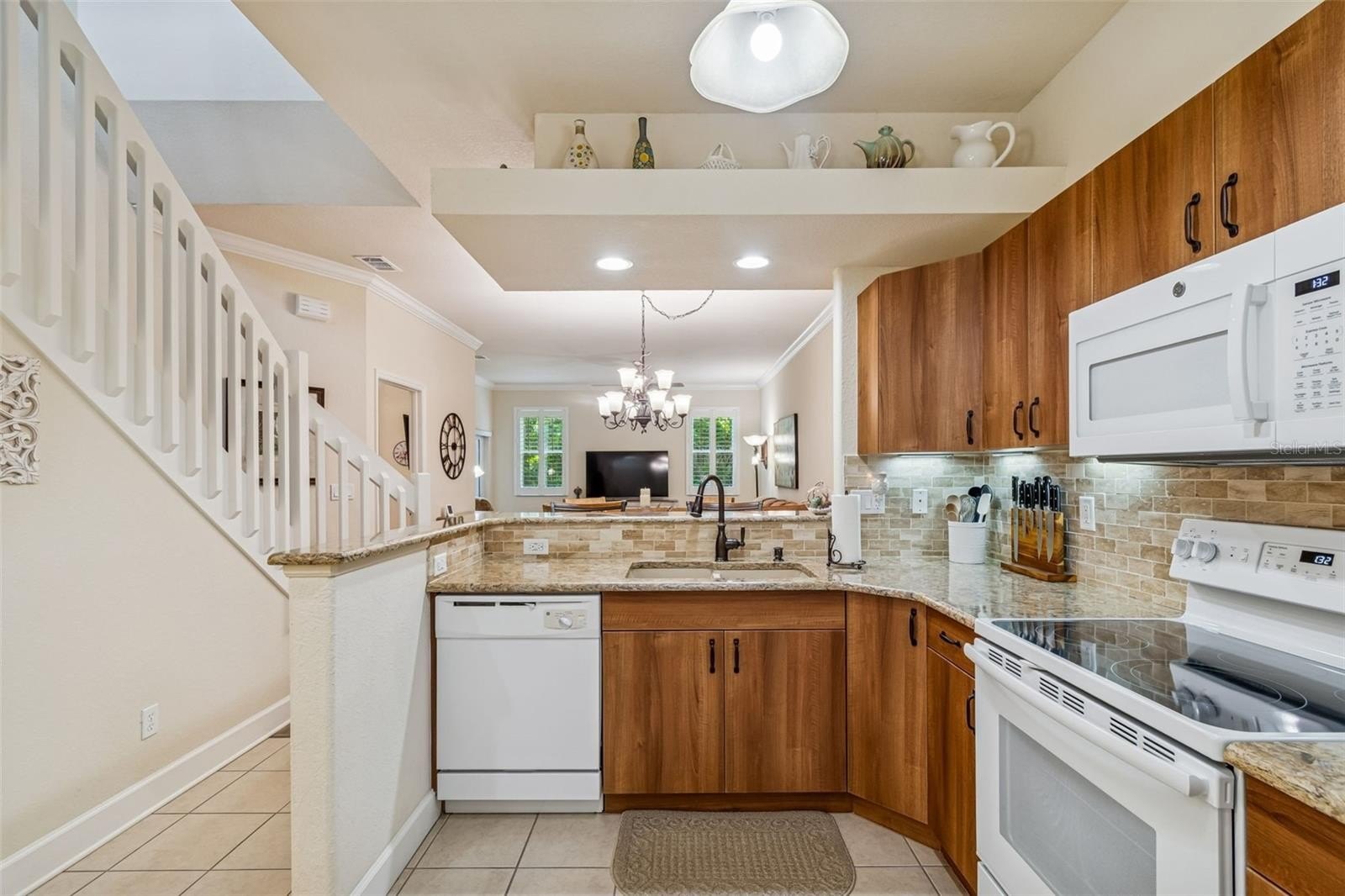 Beyond the threshold, the home opens gracefully into an airy open-concept layout where soaring ceilings and abundant natural light create a sense of warmth and possibility. Elegant rounded wall corners soften every space, while crown molding in the living and dining rooms adds a timeless touch of sophistication—details that whisper refinement rather than shout it.
